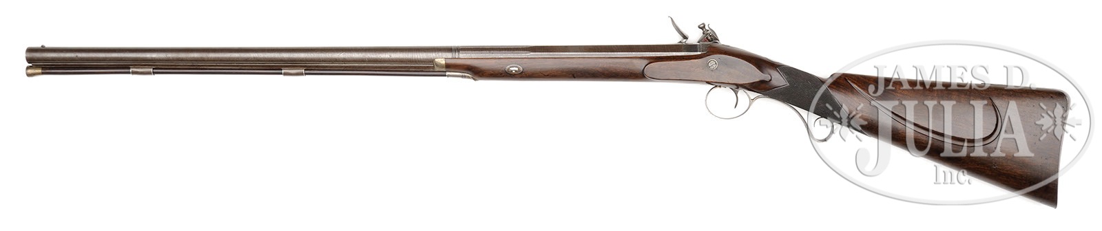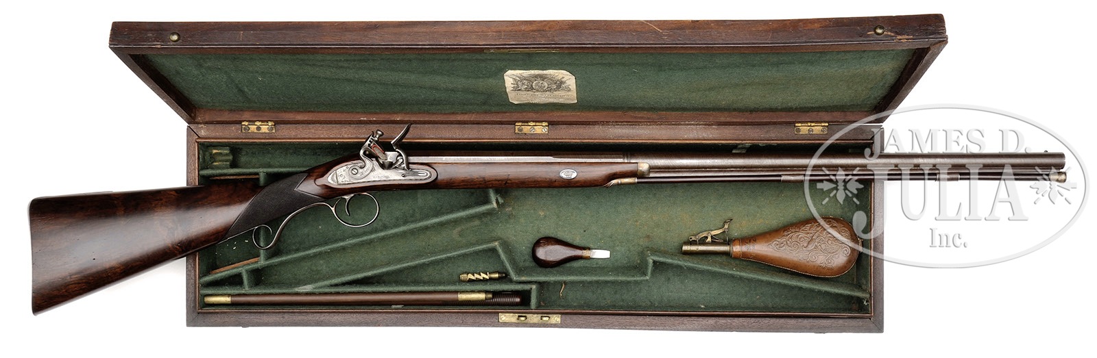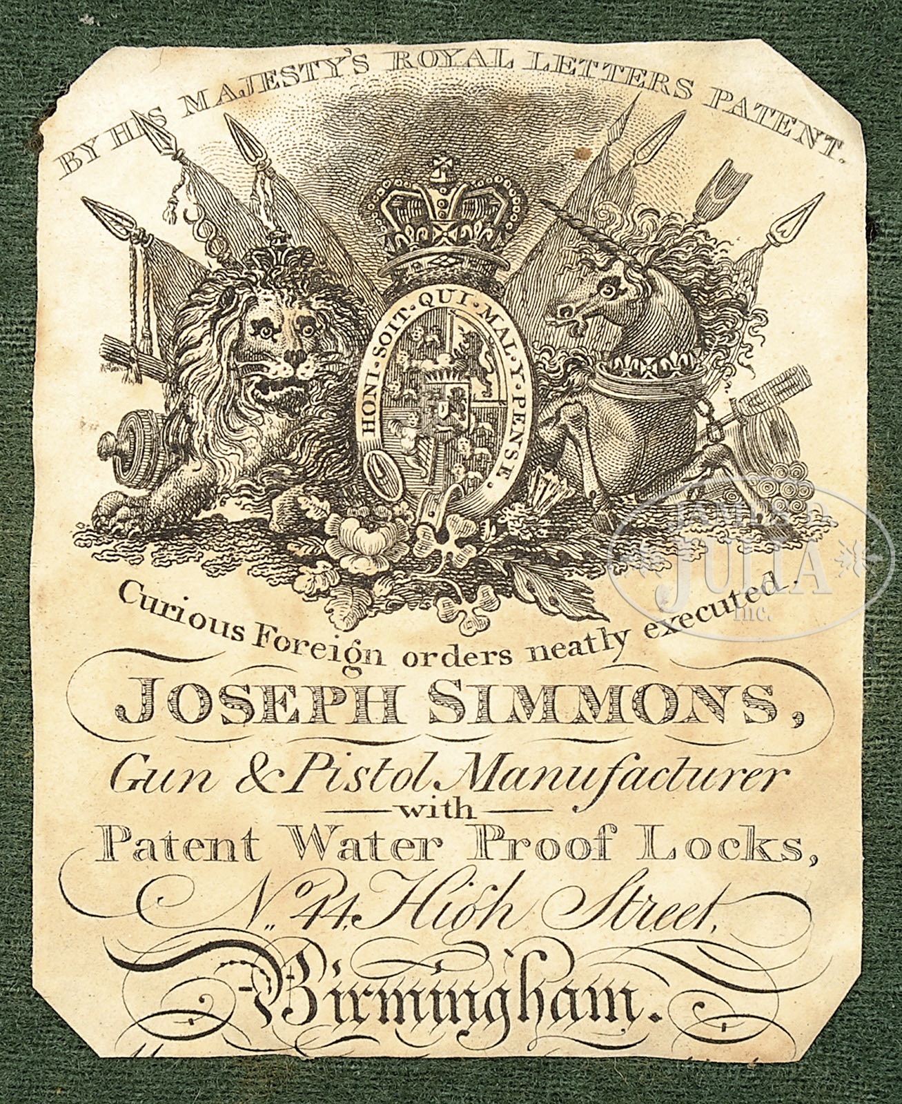 FINE CONDITION 16 BORE JOSEPH SIMMONS SINGLE FLINTLOCK FOWLER WITH ORIGINAL CASE.SN NSN. Cal. 16 bore. .662 Bore diameter. 30″ Octagon to 16-sided to round with fancy wedding band transition, damascus bbl, is fitted with under rib and two beaded thimbles which hold orig greenheart ramrod with brass head and tail with worm under cap. Bbl is gold inlaid “PATENT STEEL” on rear portion of top flat. Bottom of bbl is stamped with barrel makers marks “IPD” under a crown, and “DP” under a fleur-di-lis, either side of “Damascus”, and the number “1181”. Patent breech is case hardened and embellished with wide platinum band at rear, has platinum touch hole, and platinum poincon on top flat stamped “JOSEPH SIMMONS” (Birmingham, 1814-1832). High quality lock with waterproof pan and bridled roller frizzen, has chamfered serpentine cock. Lockplate is also chamfered with feather engraving on chamfer, deeply rebated squared tail engraved with sunburst, and hunting dog contemplating flying bird engraved on rear of lockplate. Floral engraving is on flat of cock. “Simmons” is engraved under pan. Nicely veined and lightly figured European walnut stock measures 13-3/4″ over steel butt plate with long, top tang, engraved with dog and bird, with floral highlights. Other furniture consists of scrolled grip trigger guard with stylized pineapple finial, engraved with birds on bow, and sunburst on scroll. Half stock attaches to bbl with captive side nail through oval silver escutcheons. Nose cap is also of silver. Stock features thin shadow line right hand cheekpiece, and square point pattern checkering with mullered borders at grip. Vacant silver oval crest plate is at top of grip. Bore diameter: .662. Minimum wall thickness: .050. Drop at heel: 2-1/8″, drop at comb: 1-5/16″. Weight: 5 lbs. 5 oz. LOP: 13-3/4″. Original figured mahogany case has inlet circular D-ring handle, pivoting hook closures, and key lock hole with bone escutcheon. Interior is lined in orig green baize with Joseph Simmons label on lid, and contains a leather bodied shot pouch, 3-pc greenheart and brass cleaning rod with jag, and an old walnut handled turnscrew. A mahogany compartment cover with brass knob is cut to hold lock. Also included is the orig key. (Case lock works well). CONDITION: Very fine to excellent. Bbl retains approx 80% of its orig brown finish with very fine definition to pattern. Patent breech and lock retain a considerable amount of their orig muted case hardening color with some marks and evidence of light cleaning on lock under name. Pan is somewhat pitted. Lock internals show all of their bright orig polish. Buttplate and trigger guard retain traces of their orig blue. Stock retains nearly all of an old oil finish over a number of minor marks and nicks. Bore is excellent, shiny, with a few minor pits. Lock and frizzen are crisp. Case exterior retains most of its orig finish, brass, some of its orig lacquer. Right side of top is slightly warped, with crack through grain at rear. Orig interior baize is near excellent, as is label. Some partitions are loose, but intact. Accessories are very fine. A fine usable “golden age” flint, lots of fun on “put and take” quail. 4-50995 MGM18 (10,000-15,000) – Lot 3392