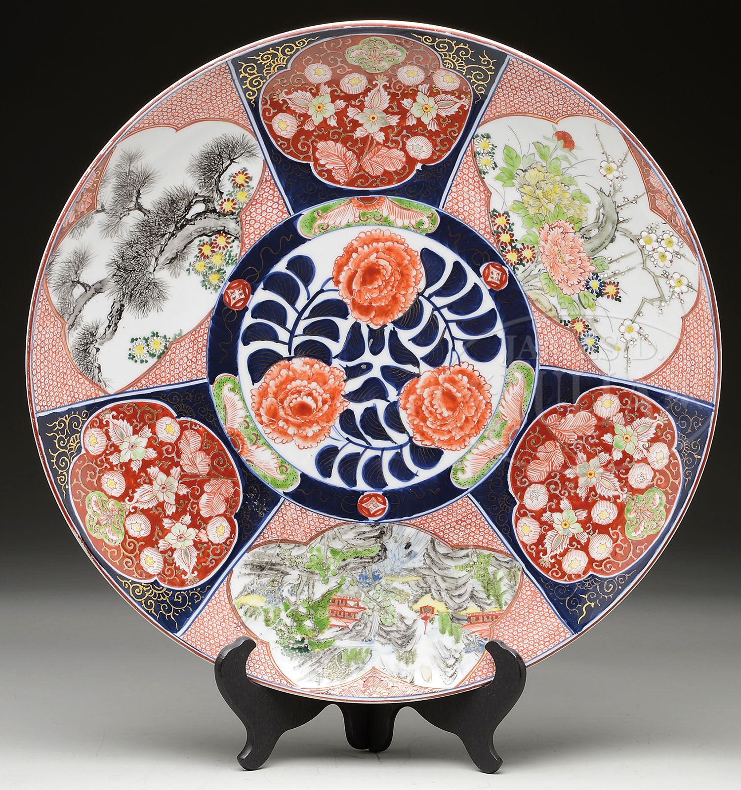 PORCELAIN WARE. Late 19th/early 20th century, Japan. Imari ware charger having decoration of flowers, figures, and brocade patterns. SIZE: 18” dia. PROVENANCE: Piczon collection. CONDITION: Very good. 9-91928 (800-1,000)