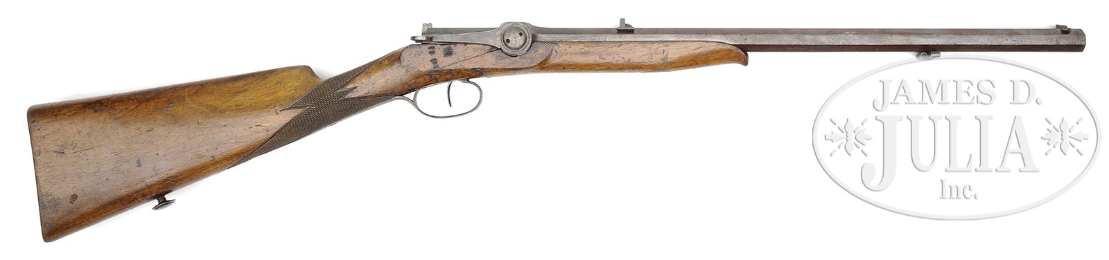 EXTREMELY RARE DREYSE FAUCET BREECH NEEDLE FIRE CARBINE.SN 8354. 19″ octagonal bbl. Blade front sight, adjustable rear sight, rectangular sling swivel, underneath bbl. Left side of bbl has two Gothic “M’s” at breech below SN 8354. All parts have matching numbers. Crank spindle at breech opens to receive a cartridge loaded through port on top of bbl. It has a checkered walnut stock with sling stud on bottom. Fire blue trigger. Steel trigger guard. PROVENANCE: Journal article entitled “The Dreyse Faucet Breech Rifle” By Larry B. Schuknecht outlining the development of this rare gun. CONDITION: Good condition, retaining about 15% original blue with light surface pitting that is fading to brown, fire blue on trigger is still visible, wood on stock. Stock is well worn with nicks and dings and a crack from the wrist up to the breech on the right side. It retains original color, and nice wood grain. There is flattening on the checkering. Bore is dull and lightly pitted. Trigger guard has been professionally repaired. Mechanics are very good. 4-51022 BWS158 (2,500-4,500) – Lot 3395