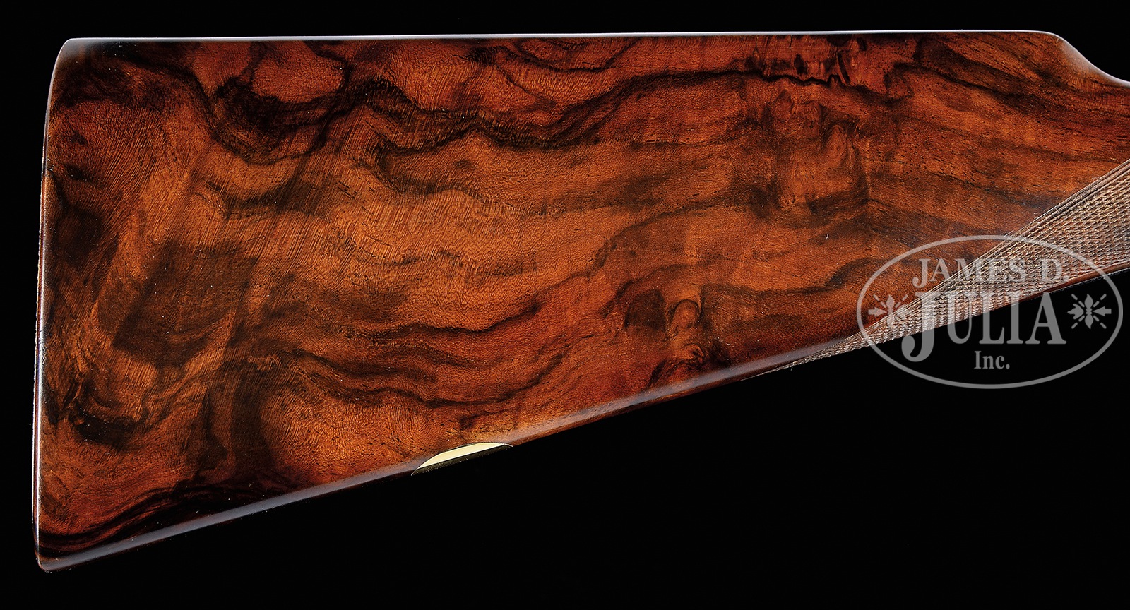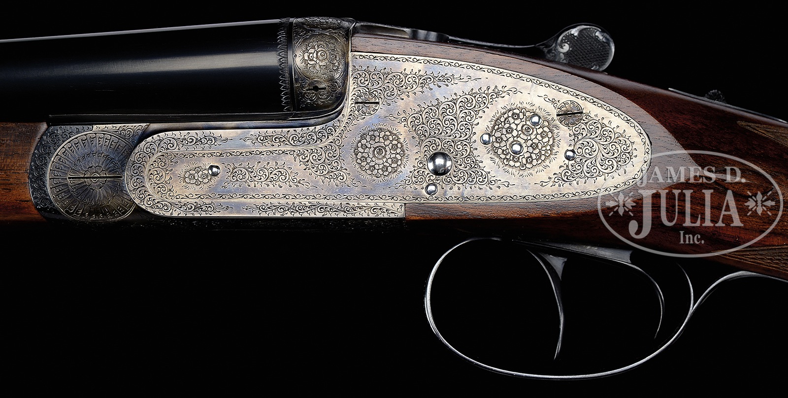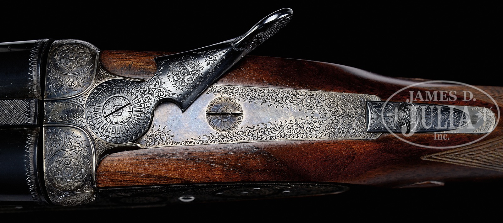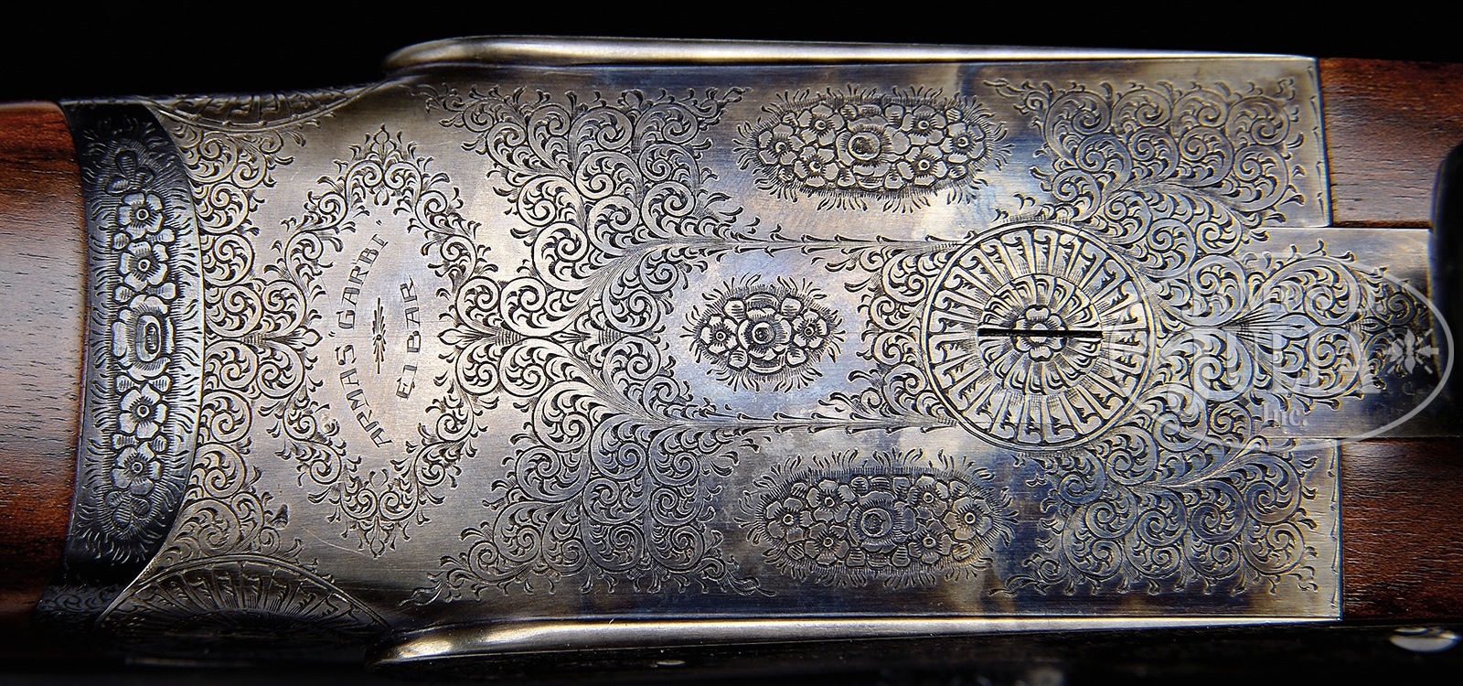 *FINE 28 GAUGE GARBI 103A SPECIAL SHOTGUN WITH SUPERB WOOD.SN 27-03-074-03. Cal. 28 ga. 29″ Chopper lump bbls with narrow, concave, matted game rib are marked with makers name, importer (WLM Scottsdale), and grade on tops. Bbl flats are stamped with SN and Spanish nitro proofs for 2-3/4″ chambers. Case hardened sidelock action features non-automatic safety (S inlaid in gold), bushed strikers, and dbl triggers (front articulated). Action and lockplates are engraved in well done, classic, English rose and scroll with makers name and address on bottom. Scroll engraved and blued trigger guard has last two sets of SN engraved on tang. Striking, wonderfully figured and marbled European walnut (this model is supposed to have selected walnut, but this stock is a cut above) straight grip buttstock measures 14-7/8″ over checkered wood butt, and features lozenge shaped drop points, point pattern checkering at grip, and a vacant gold oval on toe line. Matching long splinter forend has Anson release. Bore diameter: left -.545, right – .546. Bore restrictions: left – .019 (mod), right – .007 (IC). Drop at heel: 2-1/8″, drop at comb: 1-1/2″. Cast: approx 5/8″ off. Weight: 6 lbs. 1 oz. LOP: 14-7/8″. PROVENANCE: Remarkable William Larkin Moore Private Estate Collection of Fine Sporting Arms. CONDITION: Excellent, essentially near new, with only a few light handling marks in all its fine wood and metal finishes. Mechanically crisp. This model retails at over $21,000.00. 50594-36 MGM221 (7,000-12,000) – Lot 3395