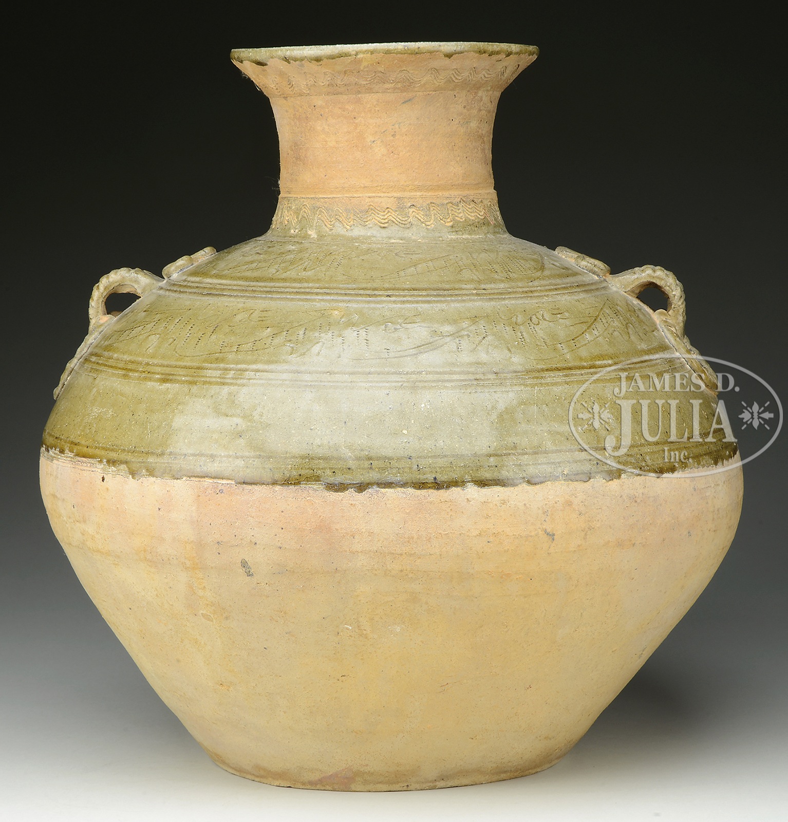 HAN STYLE GLAZED POTTERY STORAGE JAR.China. The jar in bulbous form tapering to a short cylindrical neck with flared top rim. Incised design decorating the body under a lightly applied celadon glaze. SIZE: 16″ h x 17″ dia. CONDITION: Very good. 49905-17 (700-900) – Lot 3399