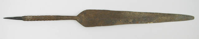 LARGE IRON SPEAR POINT. 24-1/2″ overall x 2-1/4″ at the widest point with a 9-1/2″ tapered tang having hand forged square shank with a rat tail and cut teeth – Heavy crusted rust. Appears to be missing about 1/2″ of the point with nicks and dings to the edges. A fine old hand forged spear point. 4-45140 (150-250)