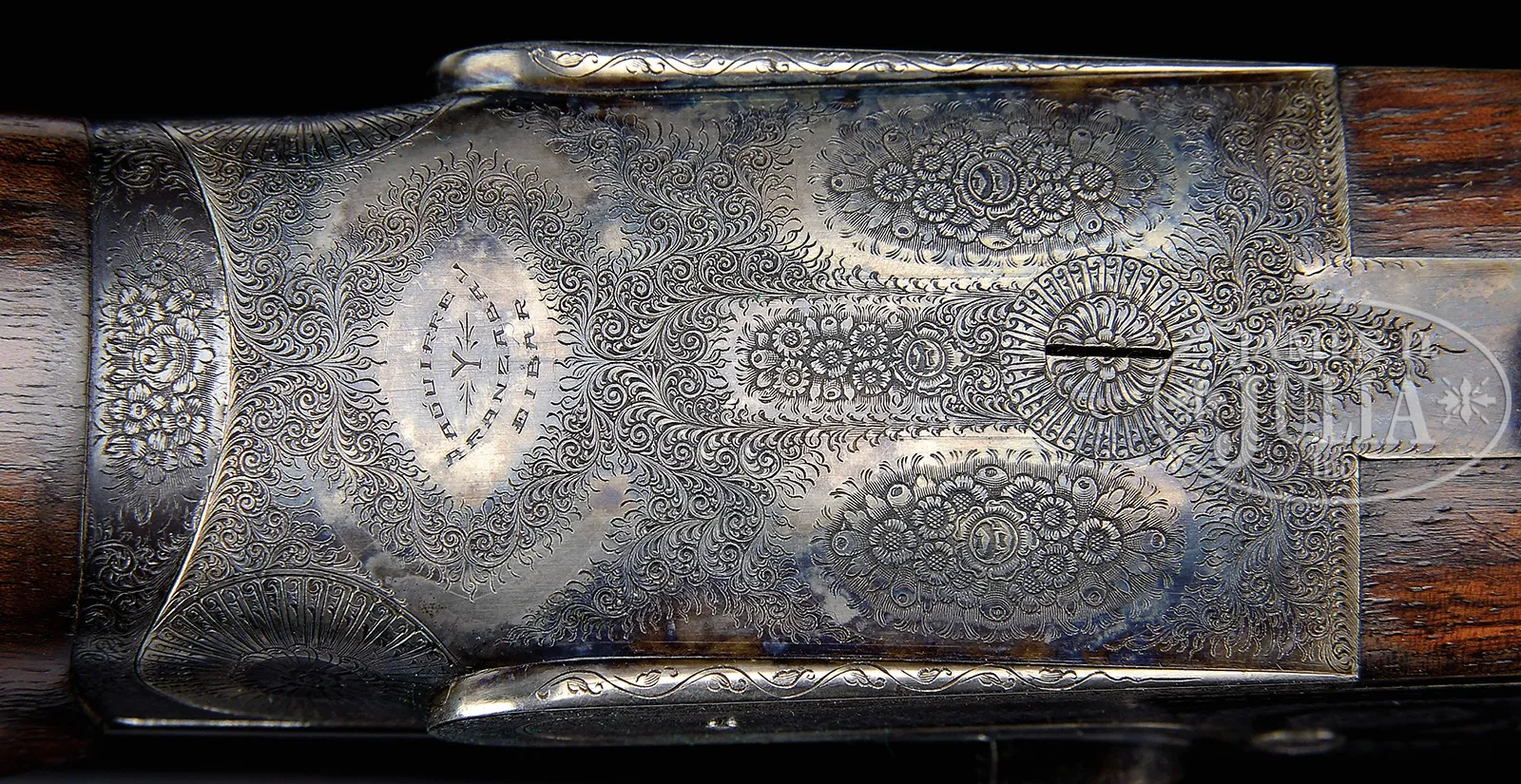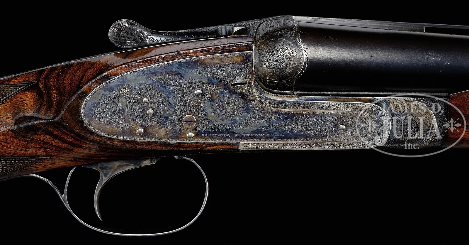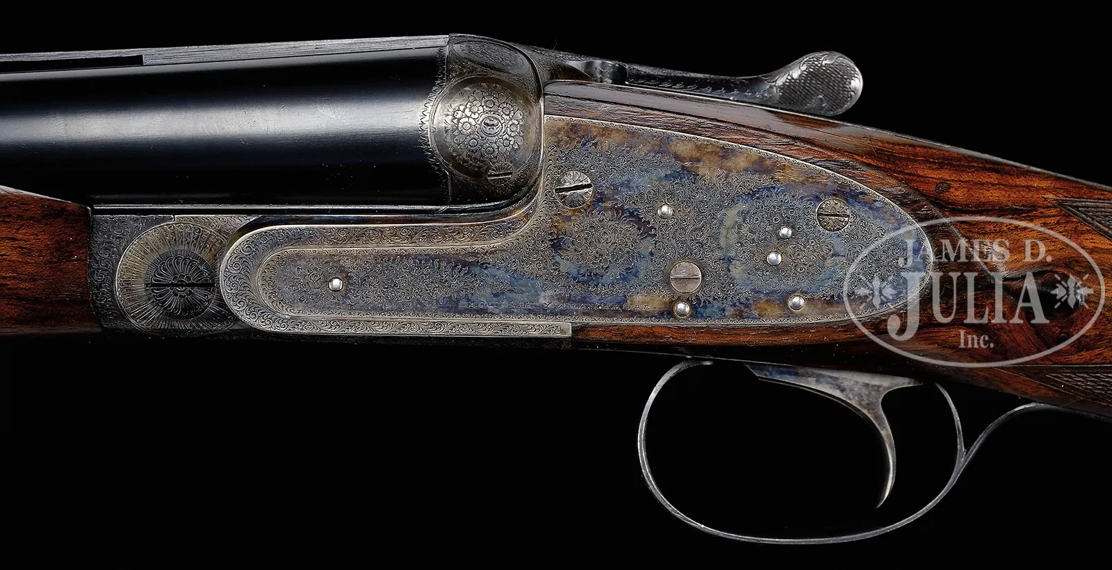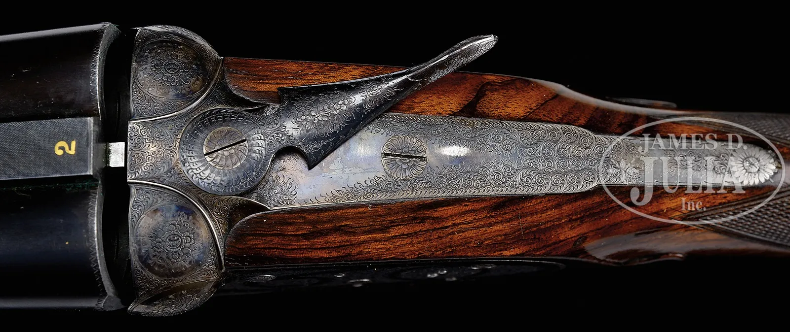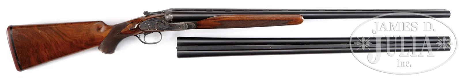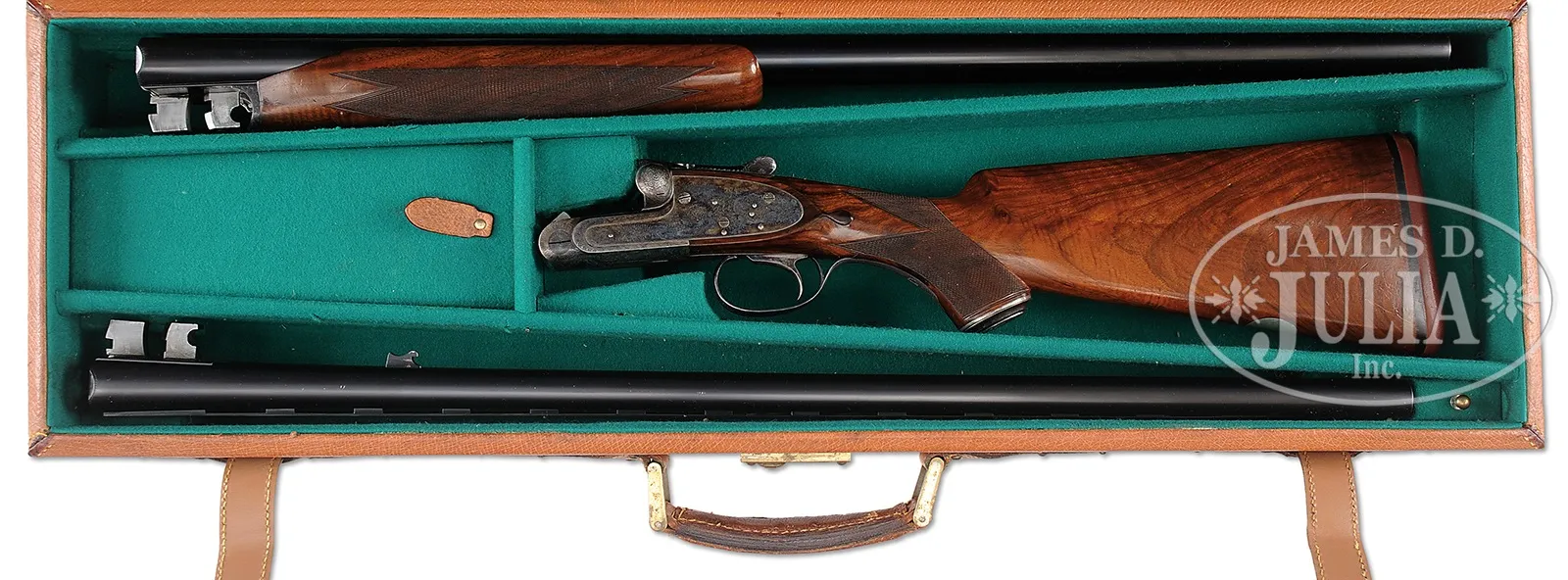 SN 51210. Cal. 12 ga. Bbl #1: 28″ of chrome nickel steel with vent rib with ivory front and mid-bead. Fixed IMP-CYL & IMP-MOD chokes. Chambers are 2-3/4″. Bbl #2: 28″ of chrome nickel steel with vent rib with front and mid bead. FULL & FULL chokes. 2-3/4″ chambers. Breech end of rib has gold “2”. Self-opening Pigeon Gun without safety. Case colored Purdey style sidelock action with side clips and cocking indicators. Full coverage of very fine rose and scroll hand engraving. Single non selective trigger with auto ejectors. Beavertail forearm of checkered thin shell walnut. Stock of fancy thin shell walnut features engraved case colored steel pistol grip cap, teardrops behind ears and silver nameplate on toe line. LOP: 14″ over thin red pad. Drop at comb: 1-3/8″. Drop at heel: 2″. weight: 8lb 6oz. Bbl date codes indicate 1952 mfg. Housed in leather covered 2-bbl luggage case. Special Note: This item(s) contains plant or animal properties that may be covered by the Endangered Species Act (ESA). We have taken care to ensure that this item(s) meets the standard for sale under the ESA. However, certain states and other countries have laws that are more restrictive than the ESA. It is the bidder’s responsibility to ensure that it is lawful to purchase or transport this item(s) into their state, and to obtain the necessary import and export approvals. Delay or failure to obtain any such permit or approval does not relieve the buyer of paying for the item(s) and consummating the purchase. CONDITION: Bbl #1 retains most of re-blued finish. Gold is missing from “1” on rib. Rib has 3 plugged holes from previous sight attachment. Good bright bores. Bbl #2 retains 95% orig blue and has good bright bores. Action has good case colors with slight fading and silvering on sharp edges and wear points. Blue on trigger guard tang has faded to gray. Stock and forearm has lightly worn finish showing numerous scratches and handling marks. Case is in good condition. 51045-3 DS (7,000-12,000) C&R; IVORY – Lot 3403