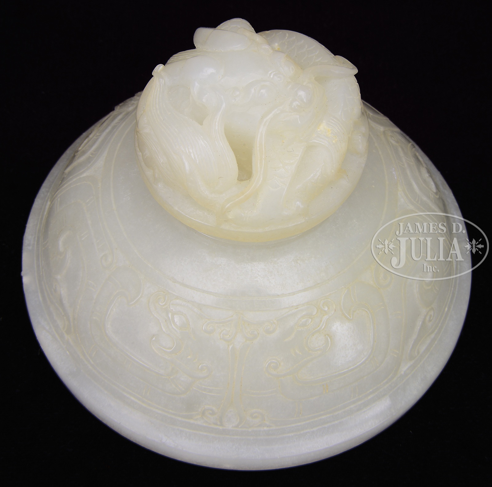 CARVED WHITE JADE ‘DRAGONS’ TRIPOD CENSER WITH LID.Qing Dynasty period, China. The body is of bulbous form, supported by three cylindrical legs extending out of beast masks, the two uprising & looped ring handles attached to the shoulder and body, the finial carved in the form of a dragon, all set on top of a carved wooden stand, the jade stone is of smooth white color. SIZE: 6″ h (15.3cm) x 6-3/8″ w (16.3cm). CONDITION: Very good with very minor roughness to edge. 9-97063 (50,000-65,000) – Lot 3404