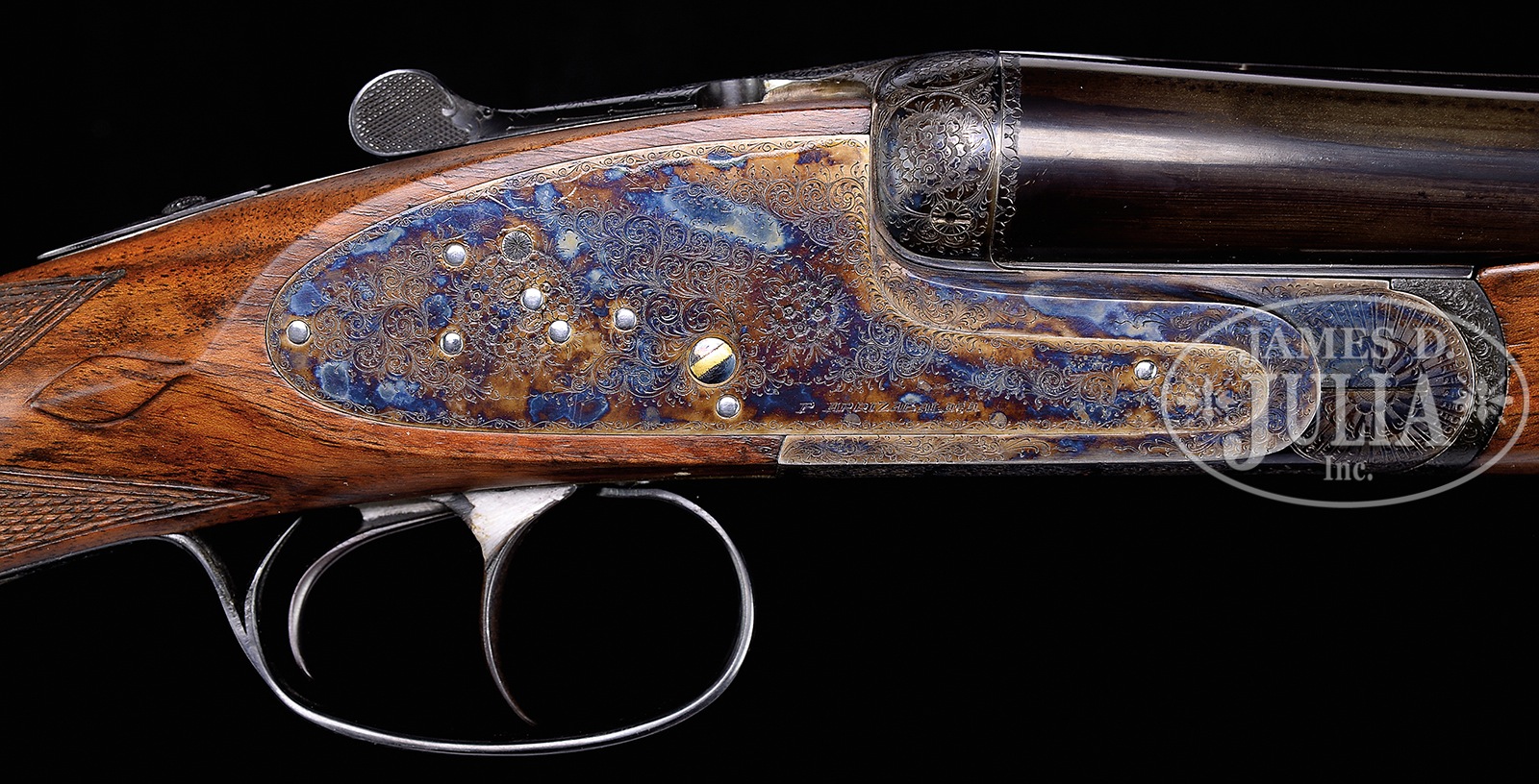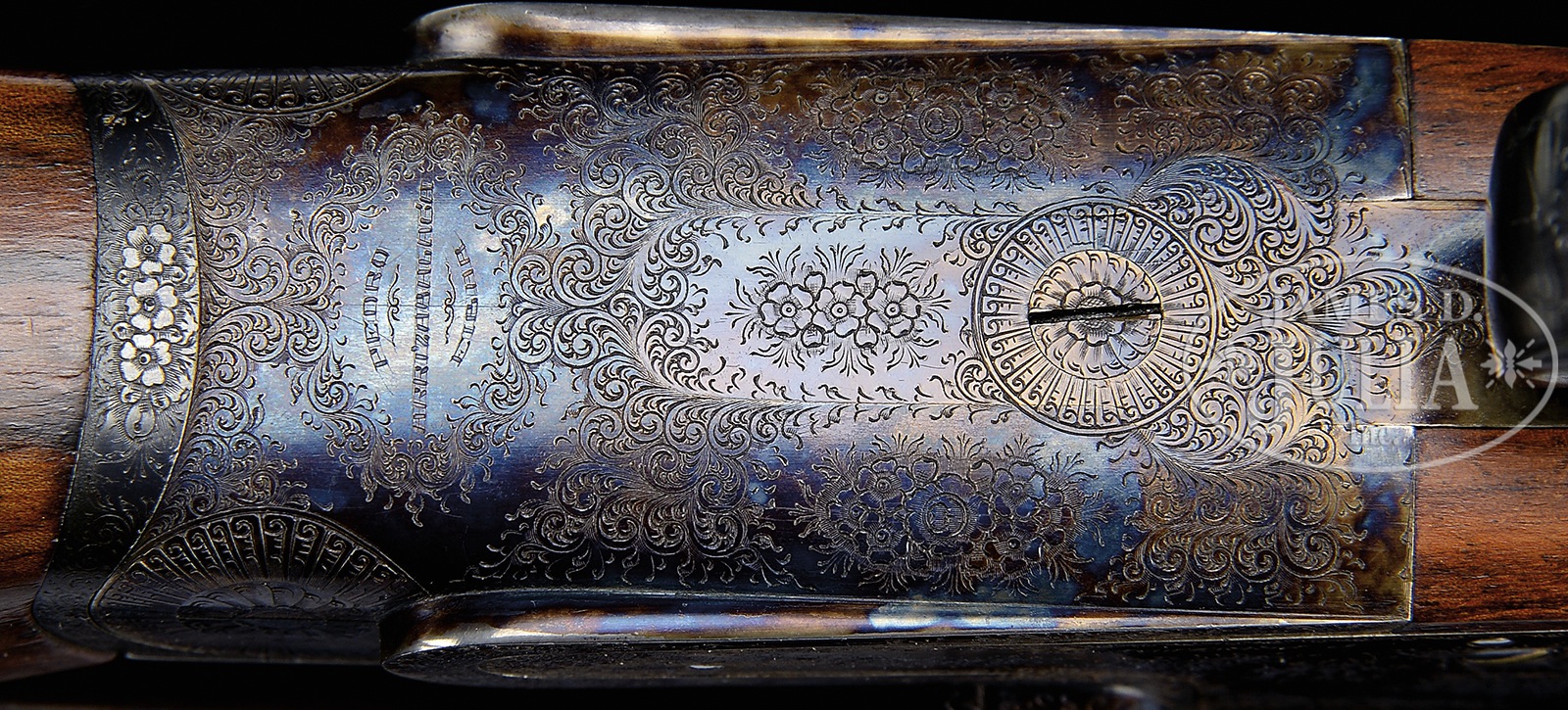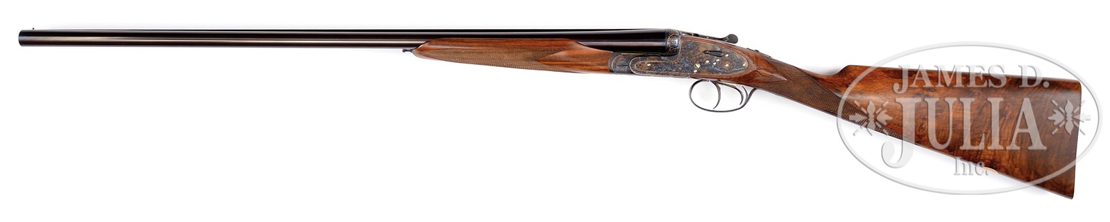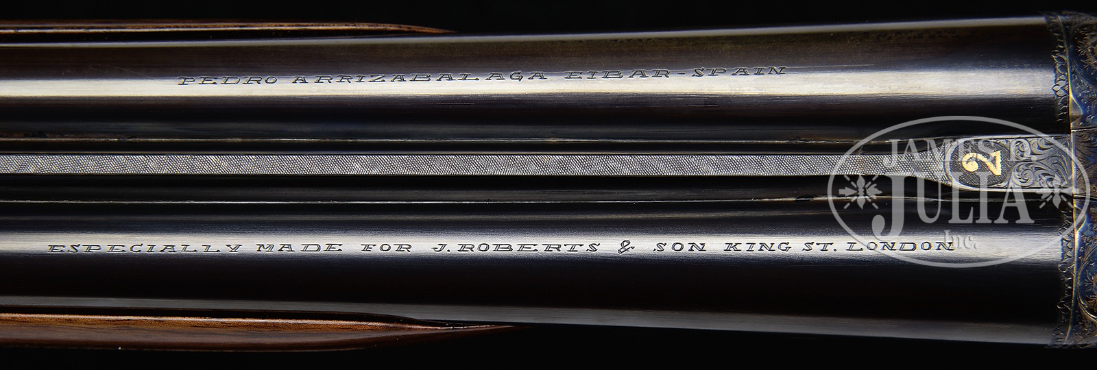 *HIGH QUALITY ARRIZABALAGA 20 GAUGE SIDELOCK EJECTOR SELF-OPENING GAME GUN WITH “PURDEY” ENGRAVING AND WITH CASE.SN 13857. Cal. 20 ga. 2-3/4″ Chambers. 26-1/2″ Chopper lump bbls are fitted with Churchill rib. Gun is no. “2” of a pair, with “2” gold inlaid at breech end of rib, on top lever, and forend tip. Tops of bbls are engraved with Arrizabalaga name and address and “ESPECIALLY MADE FOR J. ROBERTS & SON KING ST. LONDON.” Bbl flats are stamped with 1984 Spanish nitro proofs for 2-3/4″ chambers. Bbls are fitted with H&H type self-opening assist spring. Case hardened sidelock action features automatic safety (SAFE inlaid in gold), bushed strikers, gold band tumbler end cocking indicators, H&H type detachable locks, and dbl triggers (front articulated). Action and lockplates are engraved with classic English rose and scroll (advertised as “Purdey” style). “PEDRO” “ARRIZABALAGA” “EIBAR” is on bottom of action. Blued single beaded trigger guard with large open scroll on bow, has SN on tang. Nicely stump figured and lightly marbled European walnut straight grip buttstock measures 14-7/8″ over checkered wood butt, and features elongated drop points, diamond hand with point pattern checkering, and a vacant gold oval on toe line. Matching beavertail ejector forend has Anson release. Bore diameter: left -.617, right – .617. Bore restrictions: left – .006 (IC), right – .002 (skeet). Drop at heel: 2-1/8″, drop at comb: 1-1/2″. Cast: Neutral. Weight: 6 lbs. 2 oz. LOP: 14-7/8″. Brown leather case with stitched leather corners is lined in green felt, and has oval leather “Exposito” label in lid. Case contains a 3-pc brass and wood cleaning rod, along with a key. PROVENANCE: Remarkable William Larkin Moore Private Estate Collection of Fine Sporting Arms. CONDITION: Excellent, with evidence of casual field use. Bbls retain over 95% orig blue, thinned a bit, and with some marks. Case hardening of action shows silvering on beads and fences, slightly thinned on bottom. Top lever thumbpiece is slightly silvered. Blue on trigger guard tang is a bit thin. Stocks have a few light marks, a couple of removed dents, and some scratches, checkering lightly worn. Mechanically excellent. Case has a number of marks and scratches on its leather. Straps and handle are good. Interior cloth shows some soiling and rubs through from bbl lump. This esteemed Spanish maker makes only best quality guns with delivery taking over a year. This model currently retails at over $27,000.00. 50594-89 MGM169 (8,750-14,000) – Lot 3404