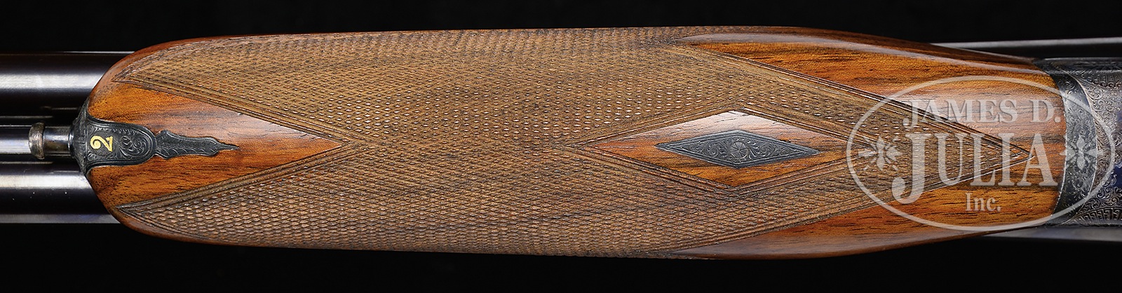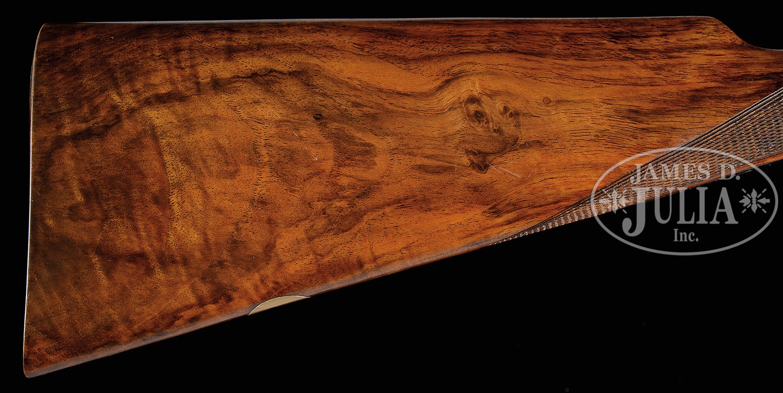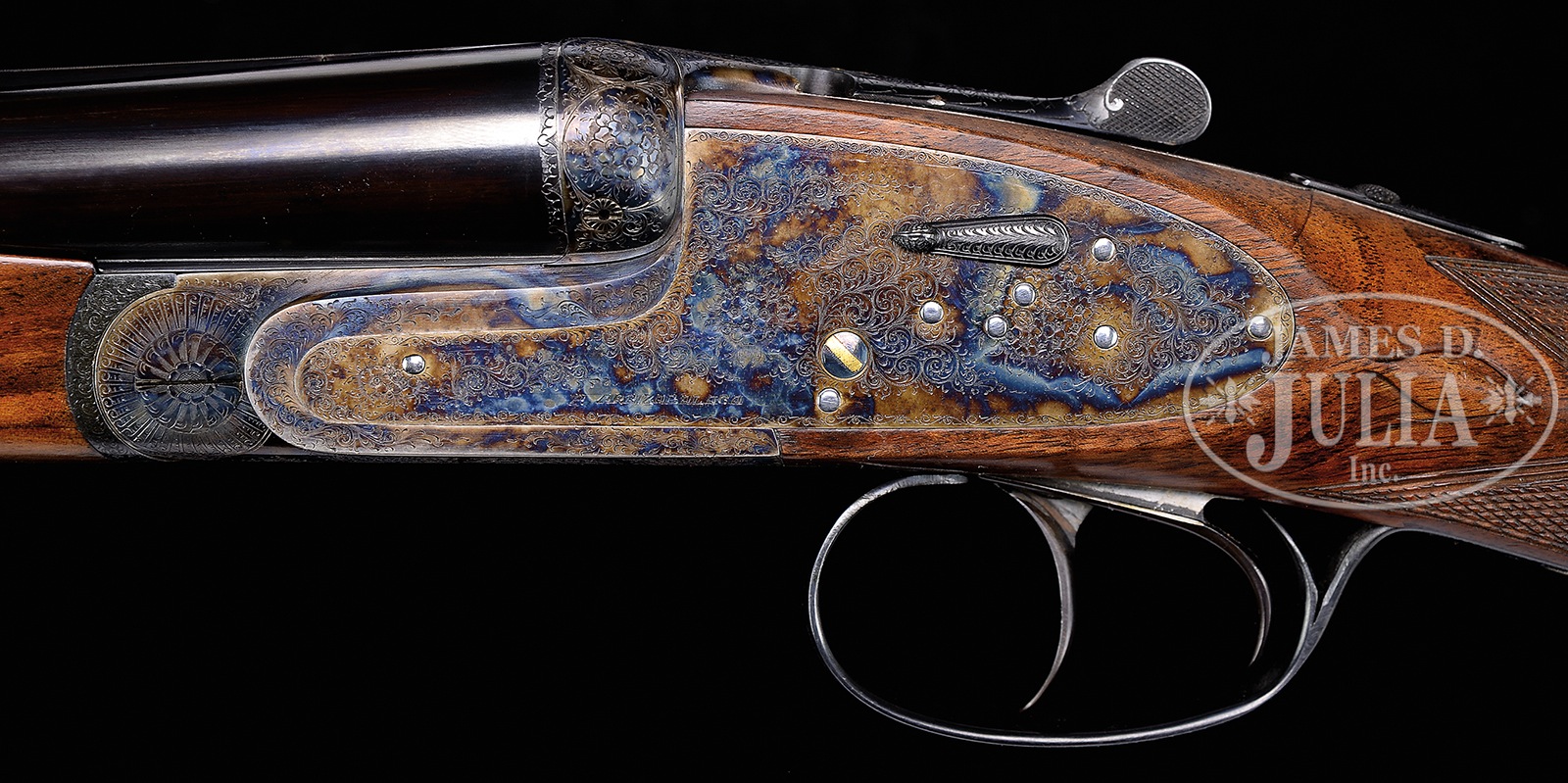 *HIGH QUALITY ARRIZABALAGA 20 GAUGE SIDELOCK EJECTOR SELF-OPENING GAME GUN WITH “PURDEY” ENGRAVING AND WITH CASE.SN 13857. Cal. 20 ga. 2-3/4″ Chambers. 26-1/2″ Chopper lump bbls are fitted with Churchill rib. Gun is no. “2” of a pair, with “2” gold inlaid at breech end of rib, on top lever, and forend tip. Tops of bbls are engraved with Arrizabalaga name and address and “ESPECIALLY MADE FOR J. ROBERTS & SON KING ST. LONDON.” Bbl flats are stamped with 1984 Spanish nitro proofs for 2-3/4″ chambers. Bbls are fitted with H&H type self-opening assist spring. Case hardened sidelock action features automatic safety (SAFE inlaid in gold), bushed strikers, gold band tumbler end cocking indicators, H&H type detachable locks, and dbl triggers (front articulated). Action and lockplates are engraved with classic English rose and scroll (advertised as “Purdey” style). “PEDRO” “ARRIZABALAGA” “EIBAR” is on bottom of action. Blued single beaded trigger guard with large open scroll on bow, has SN on tang. Nicely stump figured and lightly marbled European walnut straight grip buttstock measures 14-7/8″ over checkered wood butt, and features elongated drop points, diamond hand with point pattern checkering, and a vacant gold oval on toe line. Matching beavertail ejector forend has Anson release. Bore diameter: left -.617, right – .617. Bore restrictions: left – .006 (IC), right – .002 (skeet). Drop at heel: 2-1/8″, drop at comb: 1-1/2″. Cast: Neutral. Weight: 6 lbs. 2 oz. LOP: 14-7/8″. Brown leather case with stitched leather corners is lined in green felt, and has oval leather “Exposito” label in lid. Case contains a 3-pc brass and wood cleaning rod, along with a key. PROVENANCE: Remarkable William Larkin Moore Private Estate Collection of Fine Sporting Arms. CONDITION: Excellent, with evidence of casual field use. Bbls retain over 95% orig blue, thinned a bit, and with some marks. Case hardening of action shows silvering on beads and fences, slightly thinned on bottom. Top lever thumbpiece is slightly silvered. Blue on trigger guard tang is a bit thin. Stocks have a few light marks, a couple of removed dents, and some scratches, checkering lightly worn. Mechanically excellent. Case has a number of marks and scratches on its leather. Straps and handle are good. Interior cloth shows some soiling and rubs through from bbl lump. This esteemed Spanish maker makes only best quality guns with delivery taking over a year. This model currently retails at over $27,000.00. 50594-89 MGM169 (8,750-14,000) – Lot 3404