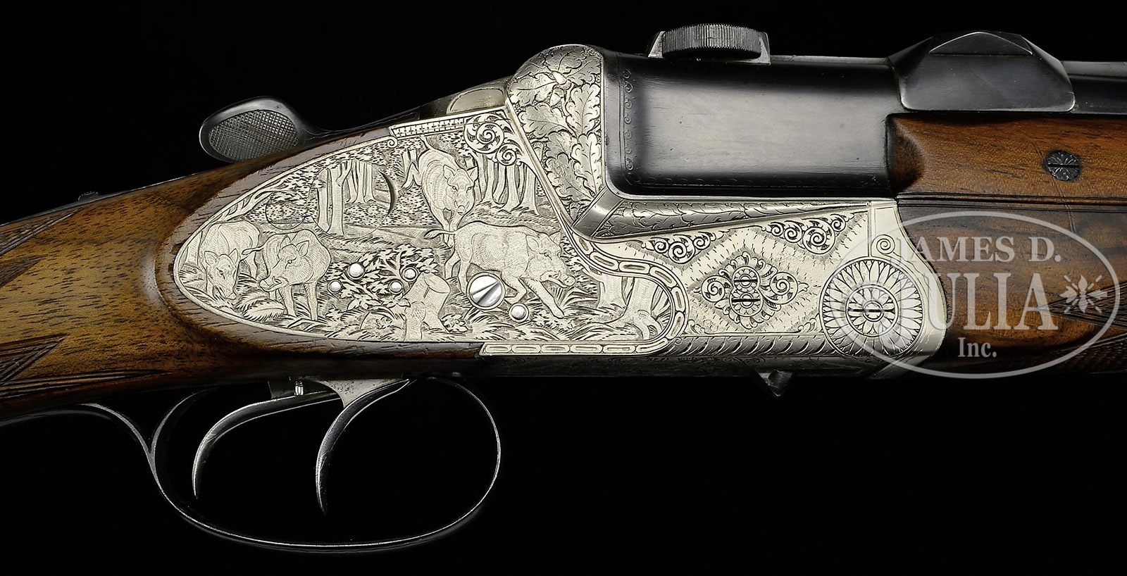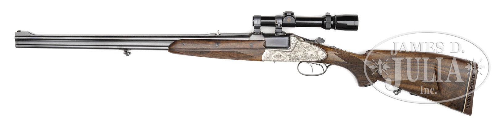 SN 15453. Cal. .300 H & H. 25-3/4″ Demi-bloc bbls are fitted with full length matted top rib cutaway at central portion forming quarter rib and front ramp. Rear portion is fitted with one standing leaf rear sight and claw bases. Gold bead front sight is longitudinally dovetailed into front base. A sling loop is installed on bottom bbl. Breech portion of bottom bbl is stamped with 1968 Ferlach proofs, caliber, retailer (Waffen Frankonia Wurzburg) and “BOHLER RASANT”. Coin finished, double Kersten, OU action features non-automatic safety, double triggers (front set), bushed strikers, reinforcing bolsters, and hand detachable sidelocks, with hinged takedown pin on right sidelock. Action is engraved with shaded scroll and with oak leaf motif on reinforcing bolsters. Sidelocks are engraved with game scenes depicting a pair of hinds and bugling stag on left; and a sounder of hogs, three boars and a sow, in woodlands on right. Bottom of action has scene of roe buck rubbing antlers on sapling under “FRANZ SODIA FERLACH” in arched riband. Scroll engraved steel trigger guard has SN at grip. Nicely dark streaked and lightly fiddle figured European walnut full horn capped pistol grip buttstock measure 15″ over Pachmayr white line brown pad, and features Tyrolean right hand cheekpiece, hogback comb, well cut point pattern checkering with two line border at grip, with a coin finished cartridge trap holding four cartridges (cover engraved with standing grizzly bear) on toe line, along with sling loop matching that on bbl. Matching 3-pc forend has Deeley release. Leupold 1.5 – 5 X scope with duplex reticle is in 30mm claw rings with shims to fit 1″ scope tube. Drop at heel: approx 2-3/4″, drop at comb: approx 1-5/8″. Weight without scope: 8 lbs. 10 oz. LOP: 15″. CONDITION: Excellent. Bbls retain over 95% orig blue. Action retains nearly all of its coin finish. Stocks retain nearly all of their dull oil finish with a number of light marks and scratches. Bores are excellent. Action is tight. Scope has some light scratches on exterior. Optics are clear. 4-50136 MGM46 (6,000-10,000) – Lot 3405