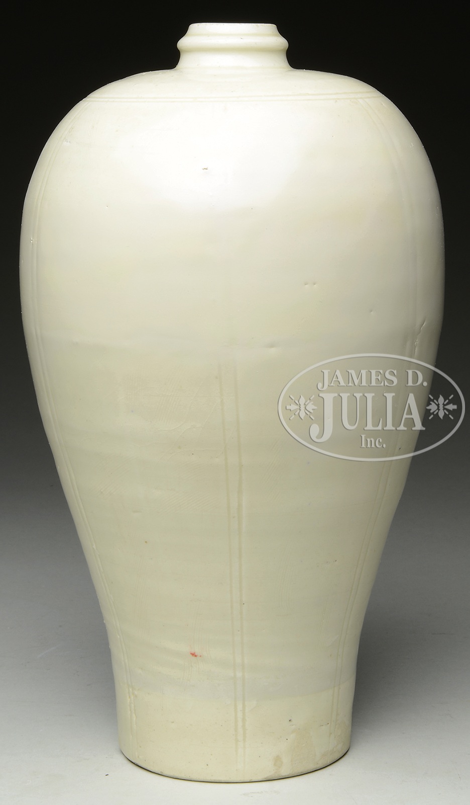 Song to Ming Dynasty period, China. The vase glazed in white and impressed with ring patterns on the body. SIZE: 11-3/4″ (29.8 cm) h x 6-5/8″ (16.7cm) dia. CONDITION: Good. 9-96935 (2,000-3,000) – Lot 3405