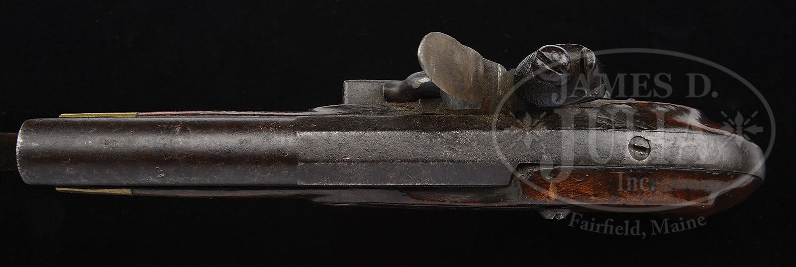 SMALL SOUTHERN IRON MOUNTED KENTUCKY PISTOL.SN NSN. 40 cal. 9″ overall. 5″ oct to rnd iron smooth bore unmarked bbl. This pistol is all iron mounted with exception of its 3/4″ brass nosecap. The flintlock is 4-1/2″ long and unmarked. This pistol is very unusual in that the iron bbl tang extends off the bbl, around the back of the pistol grip extending down to form the buttcap. The iron sideplate is of military style and the iron trigger guard appears to be hand forged. This writer’s opinion is this may be a Tennessee made pistol. PROVENANCE: Collection of John Montague. CONDITION: Good. The forward lock screw is missing, and the flintlock mechanism needs adjustment. There is some wood missing between the lock and the bbl tang. The gun is generally in nice, as-found condition throughout. 4-54384 RG36 (5,000-7,000) – Lot 3406