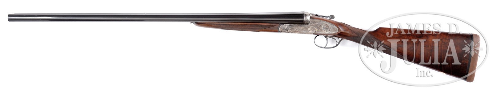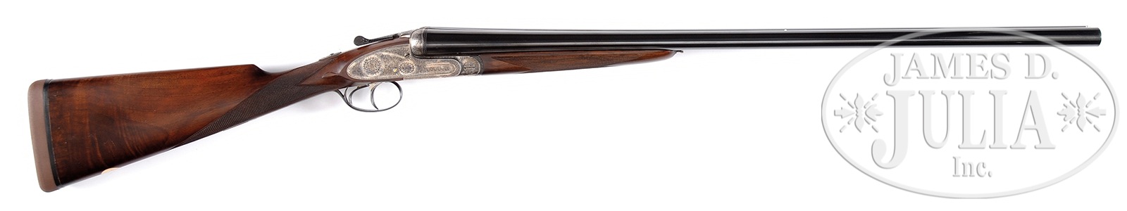 *PEDRO ARRIZABALAGA SIDELOCK SHOTGUN.SN 13436. Cal. 12 ga. 28-1/4″ bbls with sunken rib, 2-3/4″ chambers as marked on water table with “12-70” marking. Fixed chokes are open to IC & MOD. Rib has retailer marking “Gastinne Renette Paris”. Steel front bead with faux-ivory white mid-bead. Purdey style sidelock action with cocking indicators, dbl triggers and ejectors. Engraving is full coverage rose and scroll style. Splinter forearm and straight hand stock of fancy thin shell walnut with point pattern hand checkering. Main plate and toeline marked with initials “JWS”. LOP: 14-3/8″ over brown Decelerator pad and 9/16″ wood spacer. Drop at comb: 1-7/8″; drop at heel: 2-13/16″. Leather covered leather case with green velour fitted interior having Arrieta case. PROVENANCE: Remarkable William Larkin Moore Private Estate Collection of Fine Sporting Arms. CONDITION: Very good. Bbls retain very good orig blue showing a few scattered light scratches and marks. Very good bores. Faded but lightly visible case colors remain over most of the frame and locks. Stocks have very good satin refinish. Case is good. 50595-65 DS (7,250-12,500) – Lot 3406