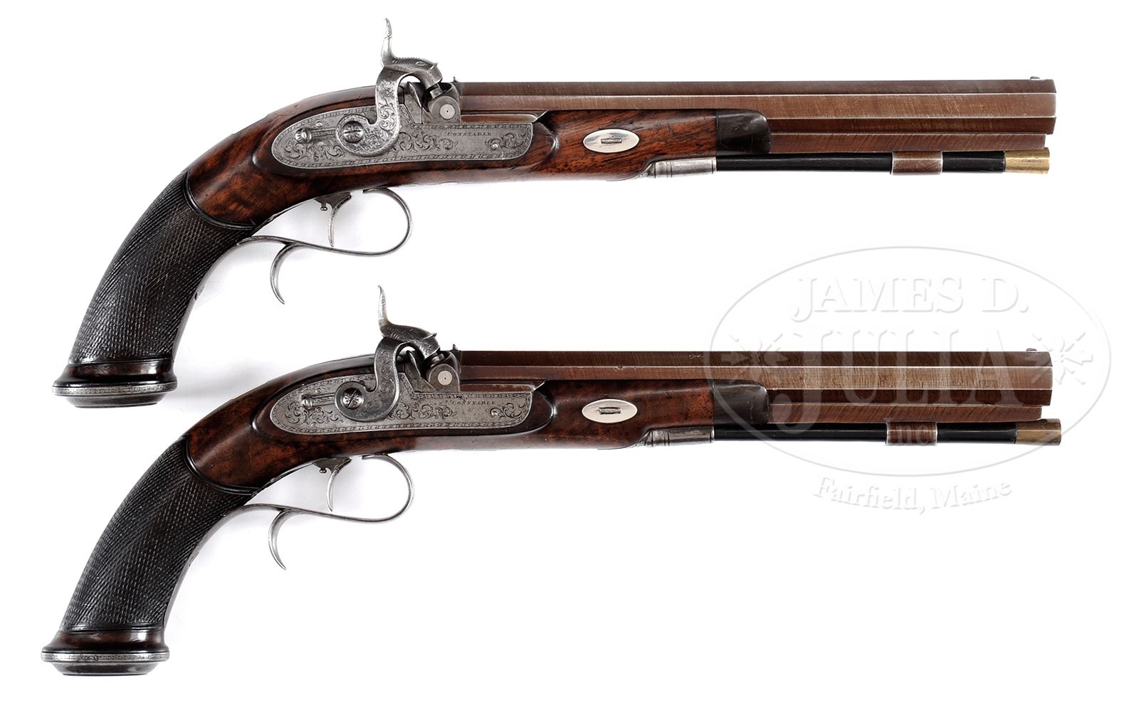 CASED PAIR OF PHILADELPHIA DUELING TYPE PISTOLS MADE BY RICHARD CONSTABLE.SN NSN. 1) Cal. .45. Overall length 16-1/4″, 9-1/2″ full oct smooth bbl is faintly marked on the top flat “Constable Philadelphia”. This pistol has exquisite engraving on the percussion lock and hammer, lock is marked “Constable”. The walnut stock has an ebony nosecap, and well done checkered grip. The furniture and buttcap are beautifully engraved iron. The ebony ramrod appears to be orig, and the gun has a single set trigger. 2) Cal. .45. Overall length 16-1/4″, 9-1/2″ full oct smooth bbl is stamped on the top flat “Constable Philadelphia”. This pistol has exquisite engraving on the percussion lock and hammer, lock is marked “Constable”. The walnut stock has an ebony nosecap, and well done checkered grip. The furniture and buttcap are beautifully engraved iron. The ebony ramrod appears to be orig, and the gun has a single set trigger. These pistols are cased with bullet mold, powder measure, screw driver, and James Dixon & Sons Sheffield leather power flask. Early American gun maker Richard Constable was English trained and successor to Booth and Co. operating from 1817 – 1851 in Philadelphia, PA. He made high quality pistols, Dueler Sets and other arms in distinct Philadelphia style. He is highly regarded as to his quality and skill. American made dueler are very rare in comparison with English, French or German origin guns. CONDITION: 1) Like new with all orig finish. The marking on the bbl is worn and hard to read and there is a crack in the stock running from trigger guard to bbl on left side. 2) Like new with all orig finish. Case is good condition and appears to be orig. 49183-31 RGG (4,000-6,000) – Lot 3407