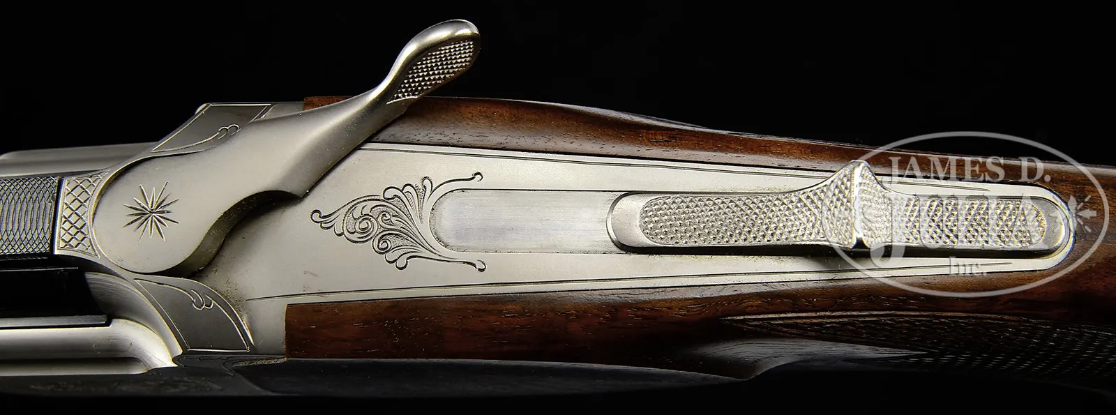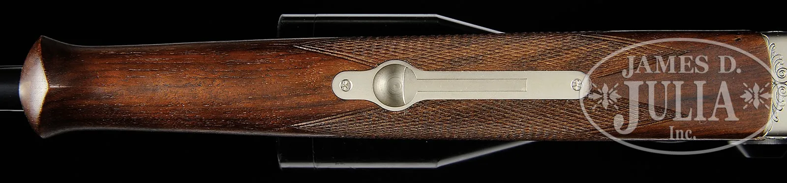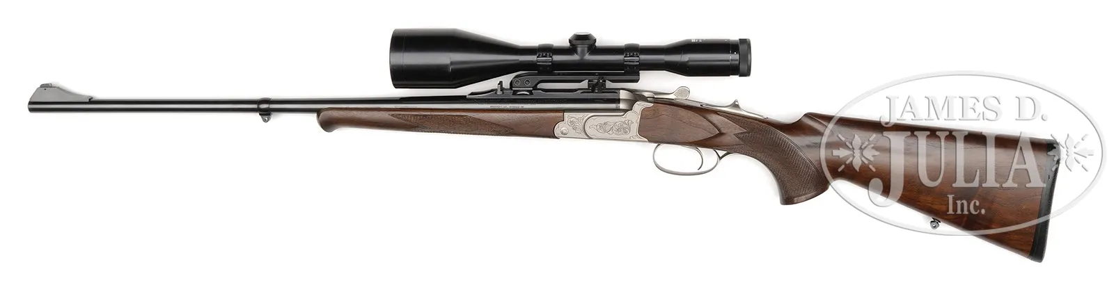 *KRIEGHOFF HUBERTUS SINGLE SHOT RIFLE WITH EXTRA BARRELS, SCOPE, AND CASE.SN 020372. Cal. 6.5 x 57R, 30-06, 9.3 x 74R. 23-5/8″ Bbls are each fitted with quarter rib having one standing leaf rear sight, and mounts for Recknagel “ERAMATIC” quick detachable scope rings. Bbls also have banded-on sling eyes and front sight ramps with square, bronze beads, and are marked with Krieghoff name and address and warnings. 30-06 and 9.3 Bbls are round. 6.5 Bbl is octagon. Each bbl set has caliber stamped in milled out portion of left rear lump, which is also marked “KRIEGHOFF ULM” and with SNs. Each bbl set has its own schnabeled forend with Deeley latch, marked for caliber in bbl channel. Lightweight, coin finished action is fitted with Krieghoff’s unique “Kickspanner” action with large cocking/ safety slide on top tang. Rifle is absolutely safe and uncocked when slide is in the “safe” position. Once thumbpiece is pushed forward action is cocked, and remains “live” and cocked by opening the action, through repetitive shots, until thumb slide is released back into “safe” position. Action is engraved with cleanly cut, tasteful sprays of large, shaded, open scroll. Bottom of action is marked “KRIEGHOFF HUBERTUS”. Trigger is “set”. Well figured European walnut full pistol grip buttstock measures 13-7/8″ over thin, black pad. A sling eye is on toe line. Point pattern checkering is at grip. There is a silver colored oval depicting standing grizzly bear, with what looks like a hallmark on bottom rock. Aforementioned forends match well. 9.3 x 74R BBL set: Drop at heel: approx 2-1/4″, drop at comb: approx 1-1/4″. Weight: 6 lbs. 6 oz. LOP: 13-7/8″. 30-06 BBL set: Drop at heel: approx 2-1/4″, drop at comb: approx 1-1/4″. Weight with scope: 7 lbs. 14 oz. LOP: 13-7/8″. 6.5 x 57R BBL set: Drop at heel: approx 2-1/4″, drop at comb: approx 1-1/4″. Weight: 6 lbs. 11 oz. LOP: 13-7/8″. Zeiss DIATAL – ZA 8 X 56 scope with heavy post and crosshair duplex reticle is in Recknagel ERAMATIC mount which fits 30-06 bbl. Two other ERAMATIC base/ ring sets without scopes are also with the rifle. Makers tan leather case with two combination locks, is lined in green cloth, has Krieghoff leather label stitched into lid, and has space for action, three bbl sets, scope, and both spare mounts. CONDITION: Excellent, near new. Wood and metal retain essentially all their orig finishes, with a few minor marks. Bores are excellent, bright and shiny throughout. Action is crisp. Set trigger works. Scope has some marks in exterior lacquer from another mount, and with some scratches and minor chipping on ocular bell. Optics are excellent. Case leather is excellent, with a few minor marks. Straps and handle are very fine. Interior cloth shows marks from contact with gun and bbls. Partitions have been rearranged, and there’s some glue in cloth. A fast handling, well balanced rifle, ideal for a one gun worldwide hunter. Last manufacturer’s retail for this combo would be well in excess of $16,000.00. 4-50171 MGM43 (6,500-9,500) – Lot 3411