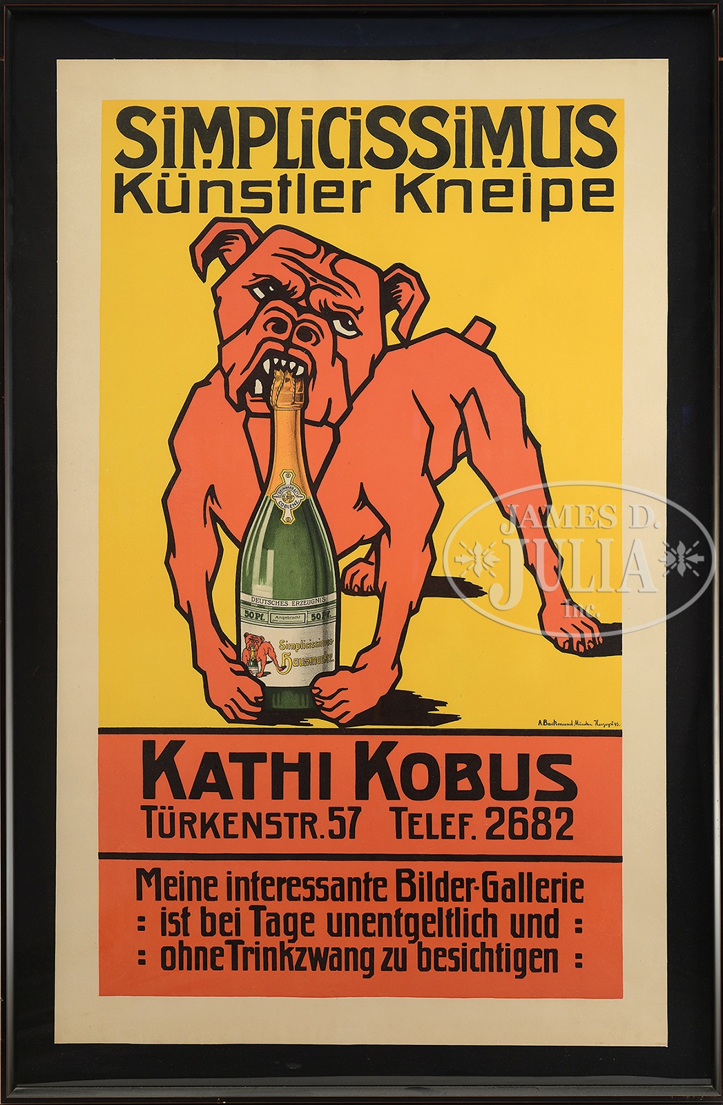FIVE FRAMED POSTERS.1) “Las Arenas” by Josep Renau-Montoro, colorful diving poster with an art deco motif. Artist signed top left, titled “Las Arenas Balneario Piscina Luminosa Valencia”. On left edge “Graficas Valencia S.L. Sevilla 13”. Housed in a fine black and red frame with double black mat. 2) German champagne poster “Simplicissimus/Kunstler Kneipe”, by A. Backmund 1945. Housed in a black frame behind plexi-glass. The poster appears to be backed and can be seen entirely in frame. 3) “Starlight Savon” by Henri Meunier (1873-1922), colored lithograph showing a young child bathing in a tub of soapy water. Appears to be backed loosely and fully seen within frame. Housed in a black frame with linen liner and mat. 4) “Glycodont” toothpaste poster, the vintage French poster showing a child with over sized toothbrush and toothpaste. Housed in a black frame under plexi-glass. 5) Over sized poster “Three Penny Opera”, the 1976 poster shows the star Raul Julia wearing a black derby had, white gloves and walking stick. Housed in a black frame behind plexi-glass. SIZE: 1) Sight 39″ h x 27″ w. Overall 49″ h x 37″ w. 2) 49″ h x 30-1/4″ w. Overall 55″ h x 36-1/4″. 3) 33-1/2″ h x 17″ w. Overall 41″ h x 24-1/2″. 4) Sight 33″ h x 23-1/2″. Overall 38″ h x 29″ w. 5) Sight 83″ h x 42-1/2″ w. Overall 88-1/2″ h x 48″ w. PROVENANCE: From the personal estate collection of Michael Urioste of Gadsden Alabama. CONDITION: All not examined out of frame, and all very good. 49354-11 (2,000-3,000) – Lot 3411