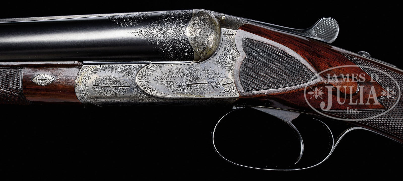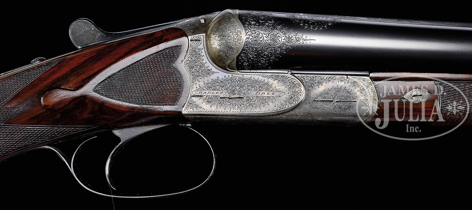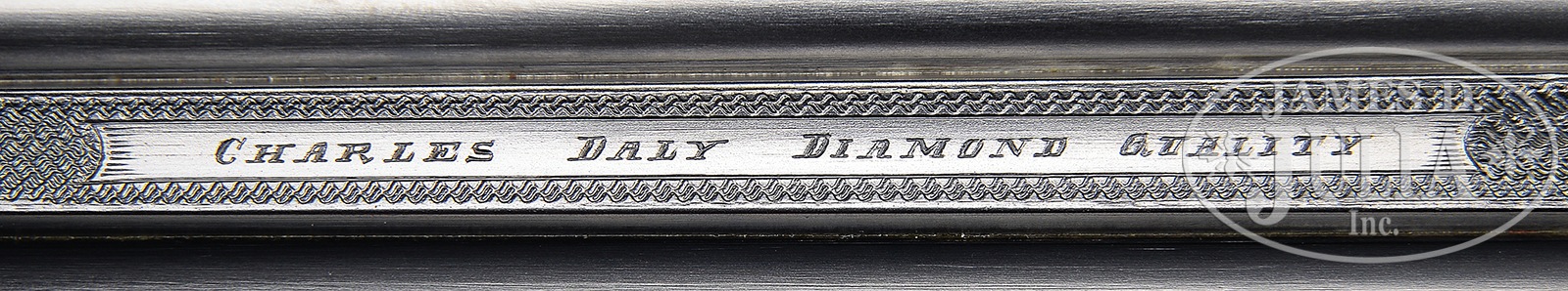 *NICELY ENGRAVED PRUSSIAN DALY DIAMOND QUALITY GAME GUN.SN 11569. (1924) Cal. 12 ga. 2-3/4″ Chambers. 28″ Dovetailed steel bbls are engraved “Charles Daly Diamond Quality” on matted game rib. Breech ends have Roechlings Special Steel logos in front of 1-1/2″ triangles of very well cut scroll. Bbl flats are stamped with German imperial proofs with proof date of 11/24. Bottoms of bbls are stamped with steel type. Case hardened, scallop-backed boxlock action features automatic safety (SAFE inlaid in gold), pin type cocking indicators, hidden square crossbolt third fastener, side clips, intercepting safety sears, and single non-selective trigger. Action is near fully engraved with well cut shaded scroll. “CHARLES DALY” is on each side of action. Scroll surrounds very fine oval scene of retriever in cattails snapping at rising duck on trigger plate. There are three flying grouse and hunter with dog on trigger guard bow, one grouse is obviously hit and falling. SN is on tip of tang. Streaked and lightly figured European walnut round knob pistol grip buttstock measures 14″ over Silver type pad. Side panels are checkered and terminate in elongated drop points. Checkering at grip is of point pattern. Pistol grip is tipped by a horn button. A vacant silver oval is on toe line. Matching splinter ejector forend with inlet horn tip, has Deeley release. Bore diameter: left -.724, right – .724. Bore restrictions: left – .039 (extra full), right – .006 (IC). Wall thickness: left – .029, right – .030. Drop at heel: 2-1/2″, drop at comb: 1-5/8″. Cast: approx 1/2″ on. Weight: 6 lbs. 4 oz. LOP: 14″. Ivory bead sight. PROVENANCE: Remarkable William Larkin Moore Private Estate Collection of Fine Sporting Arms. Special Note: This item(s) contains plant or animal properties that may be covered by the Endangered Species Act (ESA). We have taken care to ensure that this item(s) meets the standard for sale under the ESA. However, certain states and other countries have laws that are more restrictive than the ESA. It is the bidder’s responsibility to ensure that it is lawful to purchase or transport this item(s) into their state, and to obtain the necessary import and export approvals. Delay or failure to obtain any such permit or approval does not relieve the buyer of paying for the item(s) and consummating the purchase. CONDITION: Excellent, as partially refinished. Bbls retain essentially all of a fine high quality re-blue. Action retains 30 – 40% orig color, vivid where protected, balance a pleasing pewter gray. Stocks retain nearly all of a glossy oil finish, with some light subsequent marks. Stock has had wood added to head at juncture with action on right side, and with similar repair, but smaller, toward bottom of left. It appears to have cracked longitudinally with repair pins transversely inset and disguised by checkering of side panels and grip. Bores are excellent. Action is tight. Ejectors are strong and in time. Trigger works. 50594-47 MGM108 (6,500-9,500) C&R; IVORY – Lot 3411