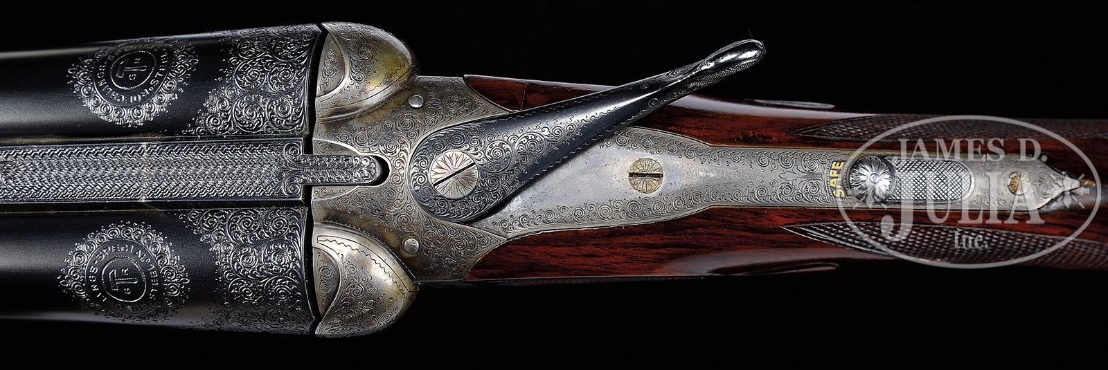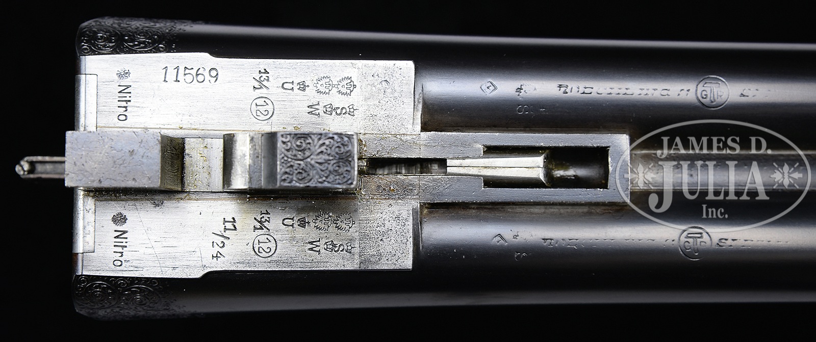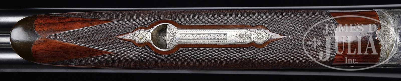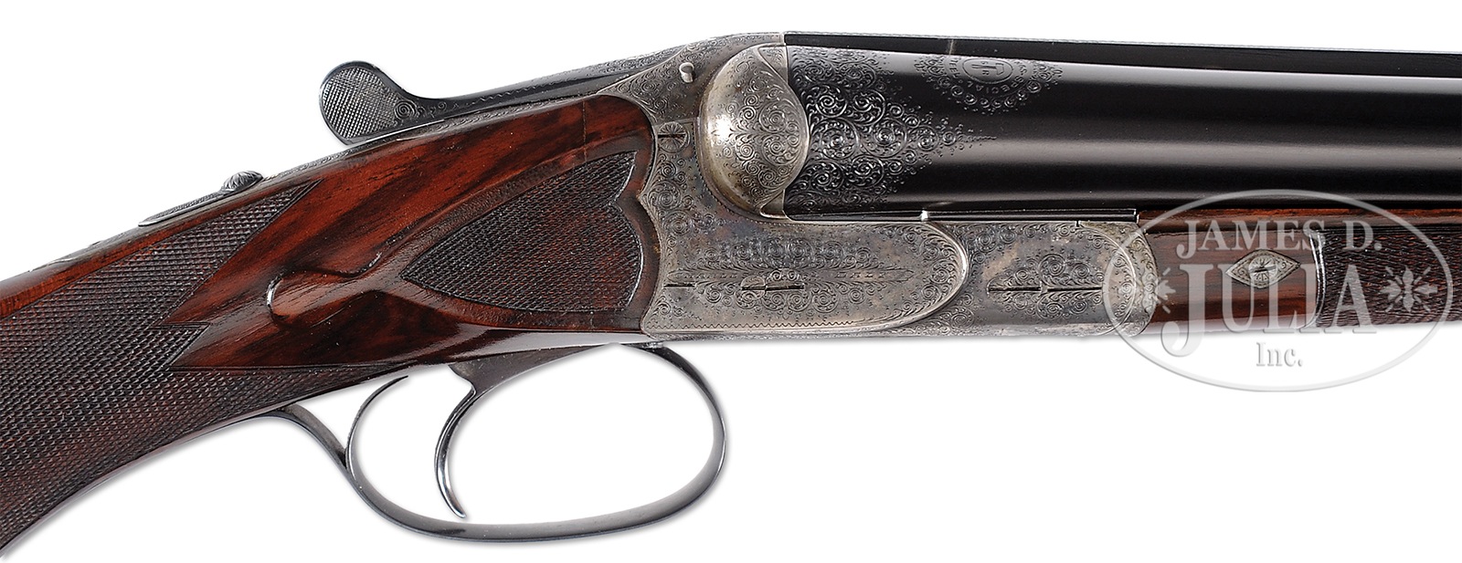 *NICELY ENGRAVED PRUSSIAN DALY DIAMOND QUALITY GAME GUN.SN 11569. (1924) Cal. 12 ga. 2-3/4″ Chambers. 28″ Dovetailed steel bbls are engraved “Charles Daly Diamond Quality” on matted game rib. Breech ends have Roechlings Special Steel logos in front of 1-1/2″ triangles of very well cut scroll. Bbl flats are stamped with German imperial proofs with proof date of 11/24. Bottoms of bbls are stamped with steel type. Case hardened, scallop-backed boxlock action features automatic safety (SAFE inlaid in gold), pin type cocking indicators, hidden square crossbolt third fastener, side clips, intercepting safety sears, and single non-selective trigger. Action is near fully engraved with well cut shaded scroll. “CHARLES DALY” is on each side of action. Scroll surrounds very fine oval scene of retriever in cattails snapping at rising duck on trigger plate. There are three flying grouse and hunter with dog on trigger guard bow, one grouse is obviously hit and falling. SN is on tip of tang. Streaked and lightly figured European walnut round knob pistol grip buttstock measures 14″ over Silver type pad. Side panels are checkered and terminate in elongated drop points. Checkering at grip is of point pattern. Pistol grip is tipped by a horn button. A vacant silver oval is on toe line. Matching splinter ejector forend with inlet horn tip, has Deeley release. Bore diameter: left -.724, right – .724. Bore restrictions: left – .039 (extra full), right – .006 (IC). Wall thickness: left – .029, right – .030. Drop at heel: 2-1/2″, drop at comb: 1-5/8″. Cast: approx 1/2″ on. Weight: 6 lbs. 4 oz. LOP: 14″. Ivory bead sight. PROVENANCE: Remarkable William Larkin Moore Private Estate Collection of Fine Sporting Arms. Special Note: This item(s) contains plant or animal properties that may be covered by the Endangered Species Act (ESA). We have taken care to ensure that this item(s) meets the standard for sale under the ESA. However, certain states and other countries have laws that are more restrictive than the ESA. It is the bidder’s responsibility to ensure that it is lawful to purchase or transport this item(s) into their state, and to obtain the necessary import and export approvals. Delay or failure to obtain any such permit or approval does not relieve the buyer of paying for the item(s) and consummating the purchase. CONDITION: Excellent, as partially refinished. Bbls retain essentially all of a fine high quality re-blue. Action retains 30 – 40% orig color, vivid where protected, balance a pleasing pewter gray. Stocks retain nearly all of a glossy oil finish, with some light subsequent marks. Stock has had wood added to head at juncture with action on right side, and with similar repair, but smaller, toward bottom of left. It appears to have cracked longitudinally with repair pins transversely inset and disguised by checkering of side panels and grip. Bores are excellent. Action is tight. Ejectors are strong and in time. Trigger works. 50594-47 MGM108 (6,500-9,500) C&R; IVORY – Lot 3411