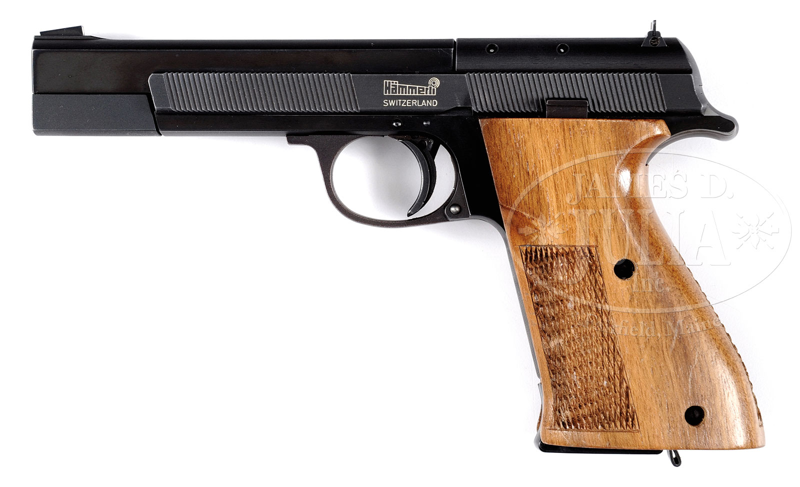 Please Note: This is a Hammerli Model 212 NOT a Model 205 as stated in the catalog. The M212 is the sporter variation of the M205/8 platform. *FINE SWISS HAMMERLI MODEL 205 TARGET PISTOL.SN 90556. Cal. 22. 5″ bbl. Blue finish with oversized checkered walnut target stocks. 10 round capacity, single action. Swiss copy of the iconic Smith & Wesson Model 41. A best quality target pistol. PROVENANCE: The Esteemed Collection Of Noted Expert And Author Warren Buxton. CONDITION: Very fine with slight pattern of wear with over 80% blue finish remaining. Excellent bore and mechanics. 51569-60 TDW (1,250-1,500) – Lot 3411