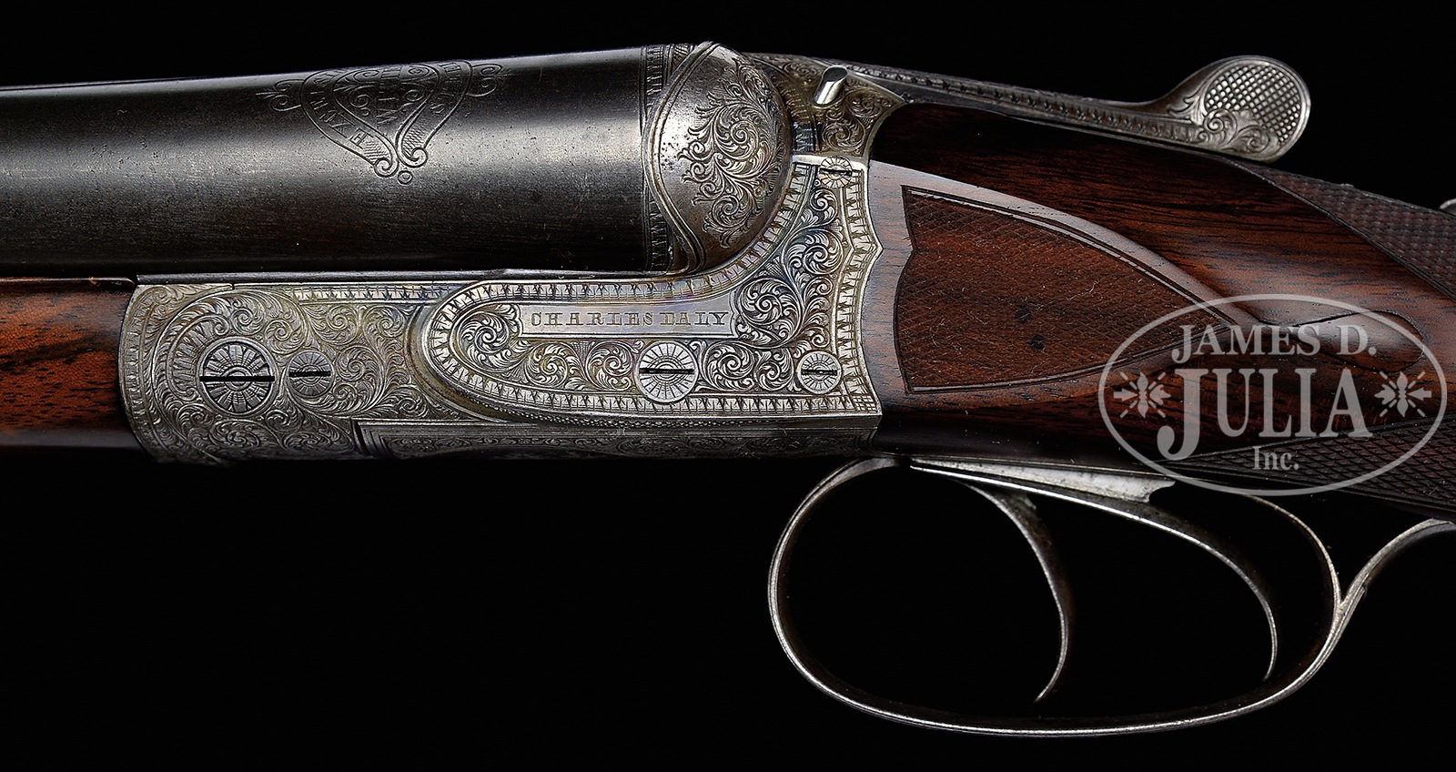 LIGHTWEIGHT PRUSSIAN DALY DIAMOND QUALITY GAME GUN BY LINDNER.SN 1348. (ca 1894) Cal. 12 ga. 2-3/4″ Chambers. 28″ Dovetailed bbls are engraved “Charles Daly Diamond Quality” on matted game rib. Breech ends have Witten Excelsior Steel logos. Bbl flats are stamped with German imperial proofs for 12 ga. Bottoms of bbls are stamped with steel type and “HAL” (Lindner) crossed pistol logos. Case hardened, scallop-backed boxlock action features automatic safety (SAFE inlaid in gold), pin type cocking indicators, hidden square crossbolt third fastener, side clips, intercepting safety sears, and dbl triggers with finger blades checkered. Action is near fully engraved with well cut open shaded scroll within feather and geometric borders. “CHARLES DALY” is on each side of action. Scroll surrounds oval vignette of strutting pheasant behind fence line on trigger plate. A pair of grouse (?) is central theme on trigger guard bow. SN is on tip of tang. Nicely marbled and figured European walnut round knob pistol grip buttstock measures 14″ over ribbed horn buttplate. Side panels are checkered and terminate in elongated drop points. Checkering at grip is of point pattern. Pistol grip is tipped by a horn button. A vacant silver oval is on toe line. Matching splinter ejector forend with inlet horn tip, has Deeley release. Bore diameter: left -.728, right – .725. Bore restrictions: left – .032 (full), right – .014 (mod). Wall thickness: left – .029, right – .029. Drop at heel: 2-1/2″, drop at comb: 1-1/2″. Cast: approx 1/2″ off. Weight: 6 lbs. 3 oz. LOP: 14″. PROVENANCE: Remarkable William Larkin Moore Private Estate Collection of Fine Sporting Arms. CONDITION: Very fine, as partially refinished. Bbls retain 60 – 70% of what appears to be orig blue, with some later darkening over light scattered pitting, and considerable hand wear. Action retains 30 – 40% orig color, vivid where protected, balance a pleasing pewter gray, with some light pinprick pitting on fences. Stocks retain nearly all of a very high quality hand rubbed oil finish, with some light subsequent marks, checkering competently re-cut. Bores are excellent, chambers appear to have been back bored. Action is tight. Ejectors are strong and in time. Sling swivels have been removed from bbls and buttstock. 50594-51 MGM107 (5,000-8,000) – Lot 3413
