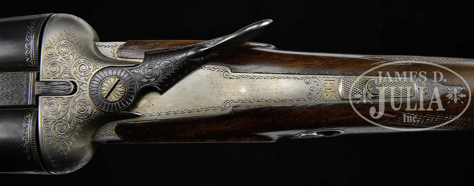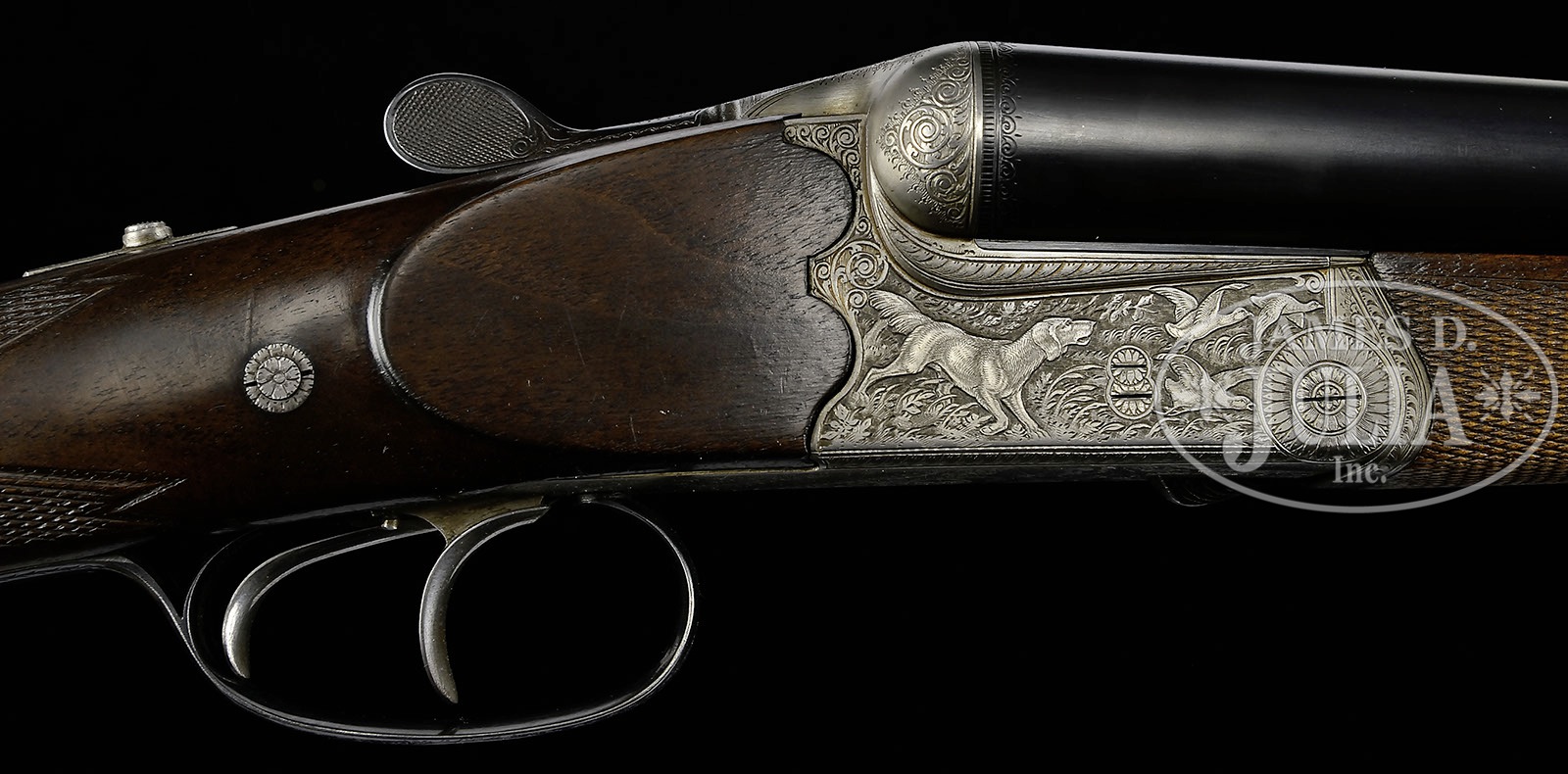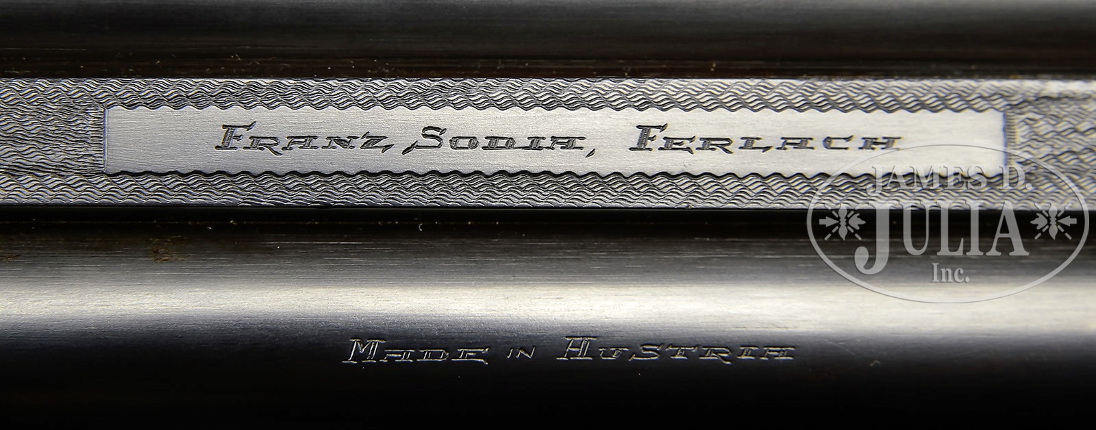 *FRANZ SODIA BLITZ ACTION DRILLING.SN 4210. Cal. 12 x 12 x .257 Roberts. 24-1/2″ Bbls with full length matted rib engraved “Franz Sodia Ferlach”, have pop-up V-notch rear sight and gold bead front. Bottoms of bbls are stamped with 1953 Ferlach proofs, calibers, SN, and “BOHLER SPEZIAL”. Coin finished scallop-backed Blitz action features rifle/ shotgun selector on top tang, Greener type side safety, bushed strikers, hidden crossbolt third fastener, reinforcing bolster, and double triggers (front set). Action is engraved with well cut Germanic shaded scroll, and well done game scenes with a roe buck and doe bounding through open meadow on left, a setter flushing a trio of partridge on right, and a pair of ducks winging over marsh on bottom. Blued and scroll engraved trigger guard with “MADE IN AUSTRIA” on grip, has gold inlaid oval monogram, “JHP” on bow. Nicely fiddle figured, dense European walnut capped pistol grip buttstock with right hand shadow line cheekpiece and point pattern checkering at grip, measures 14-1/8″ over black white line pad. A sling loop is on toe line matching that soldered to bottom of bbl. Matching rounded splinter forend has Deeley release. Bore diameter: left-.724, right -.724. Bore restrictions: left -.035 (Full), right -.035 (Full). Minimum wall thickness: left -.025, right -.020. Drop at heel: 2-1/2″, drop at comb: 1-1/2″. Weight: 7 lbs. 4 oz. LOP: 14-1/8″. CONDITION: Excellent. Bbls retain nearly all of what appears to be orig blue, but is most likely a fine quality older rust blue. Action retains most of its orig coin finish, somewhat darkened from normal hand wear. Stocks retain nearly all of what is most likely an older oil finish, checkering slightly worn. Bores are excellent. Action is tight. Set trigger works. A well made fairly lightweight drilling in an unusual but highly regarded caliber. 4-49732 MGM49 (2,500-4,000) – Lot 3415