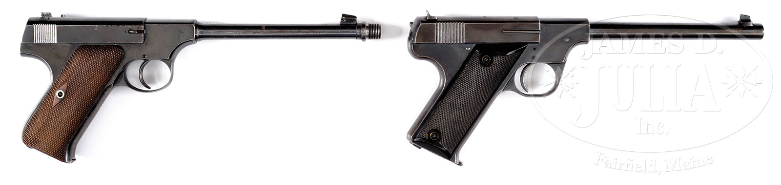 *LOT OF TWO 22 PISTOLS, COLT PRE-WOODSMAN & HARTFORD ARMS.1) HARTFORD ARMS 1925. SN 3288. Cal. 22LR. 6-3/4″ bbl. Rare, manually operated. Marked on left side of frame “MANFD. BY / THE HARTFORD ARMS&EQUIP.CC. / HARTFORD,CONN. / PATENTED / 22CAL. / LONG RIFLE”. SN located on front grip strap. Checkered black hard rubber grips. Unmarked dual tone magazine. PROVENANCE: The Esteemed Collection Of Noted Expert And Author Warren Buxton. CONDITION: Very good showing finish wear. Markings are clear. A few very minor areas of light surface rust. Grips are fine. Excellent bore. Good working order. C&R 2) COLT WOODSMAN. SN 6476. Cal. 22LR. 7-1/8″ bbl. Pre-Woodsman model. End of bbl threaded for silencer. Standard Hartford, Connecticut bbl address. “DEC. 22,1903.” patent date. Checkered, diamond wood grips. Proper dual tone “CAL.22 / COLT” marked magazine. PROVENANCE: The Esteemed Collection Of Noted Expert And Author Warren Buxton. CONDITION: Very good showing finish wear on high points and grip straps. Some areas of light surface rust and discoloration on the left side of the bbl. Ding in metal on right side of bbl. Has 3 initials lightly scratched into finish on right side of frame under slide serrations. Muzzle threads are sharp. Fine bore has strong rifling. All markings clear. Grips show nominal wear. Good working order. C&R 51569-34, 51569-44 GER (1,000-1,500) – Lot 3416