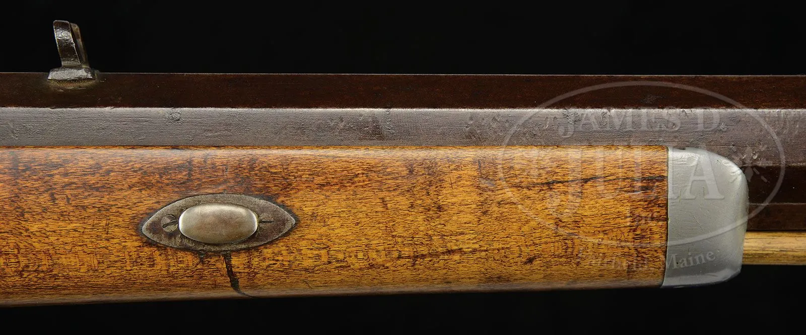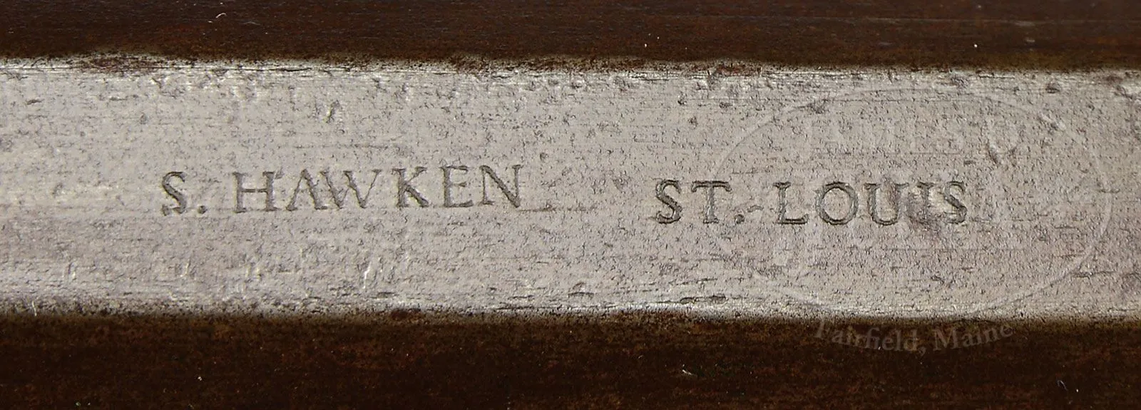 RARE AND DESIRABLE SAMUEL HAWKEN HALF-STOCK PERCUSSION PLAINS RIFLE.SN NSN. This rare example of a western plains rifle has a 38″ full oct .40 cal rifled bbl which is stamped “S. HAWKEN ST LOUIS” and features classic Hawkens long wrist bbl tang. Orig percussion back-action lock is unmarked. Rifle has orig pewter nosecap. Samuel Hawken was born in 1796 and located in St. Louis in 1822. His rifles were stamped “S. HAWKEN” from 1849 to 1861. Hawken rifles were famous all through the west and were considered “the best” in plains or mountain rifles. This gun appears “as found” all major parts orig with very minor restoration. PROVENANCE: Estate Collection of Lewis & Leyton Yearout. CONDITION: Gun is very good overall. Bbl and lock are plum/brown with numerous small dents and scratches. Hints of orig brown finish can be seen in protected areas. Gun appears all orig with possibly exception of locking key and some wood restoration inside stock channel, around key-way. Stock is sound and solid with much dark apparently orig varnish especially dark in protected area under cheekpiece and around trigger guard but worn away showing lighter maple color to wood especially at forestock where gun was held. There is much pitting around bolster where gun would have taken fire. Brass trigger guard and buttplate have light mustard patina, are well fit with scattered small scratches and blemishes. Adjustable set trigger and trigger mechanism are a bit sloppy but maybe with a bit of adjustment would work well. Bore has well defined fairly crisp rifling with pitting. 4-53967 JS89 (4,000-6,000) – Lot 3417