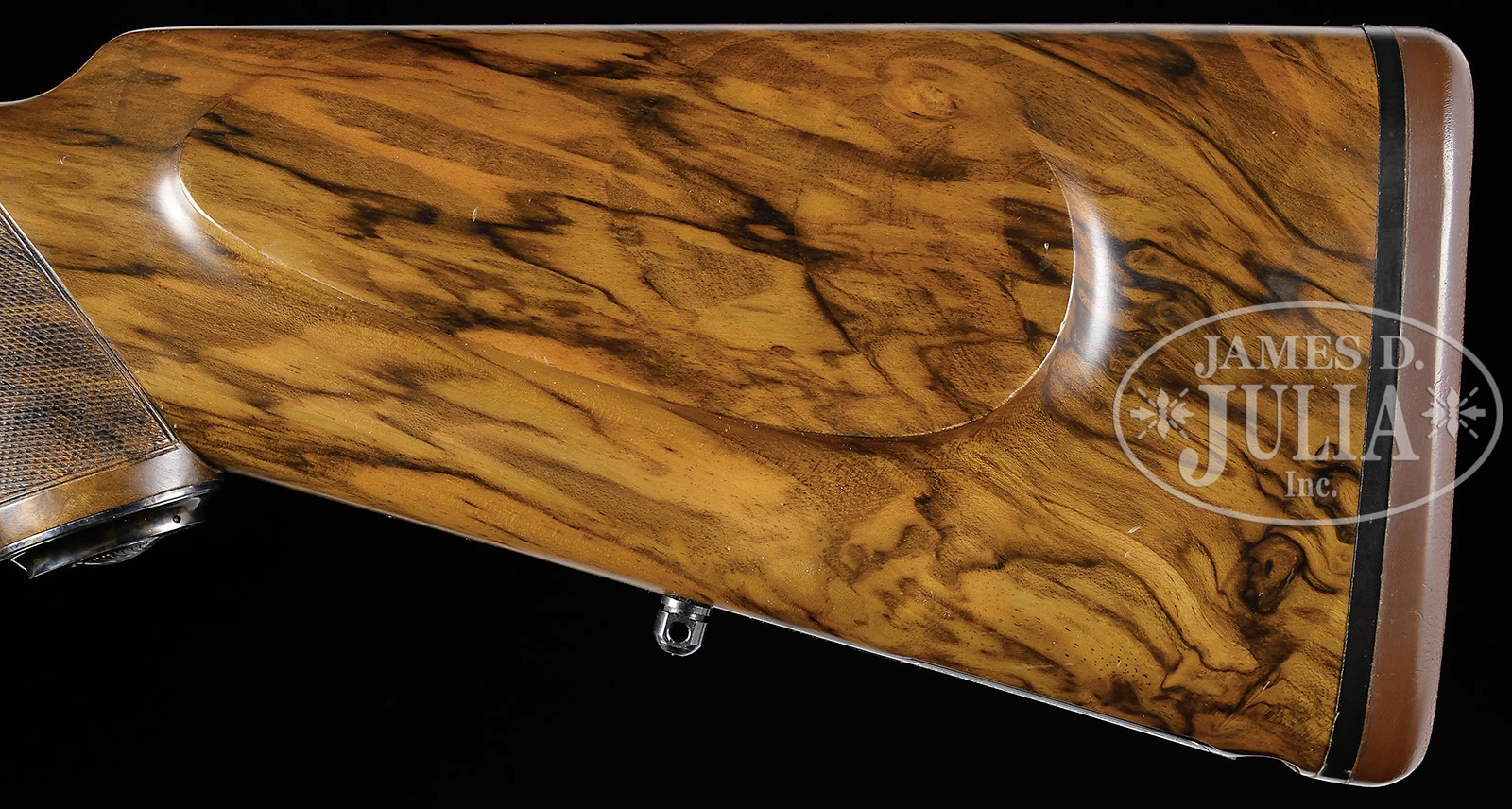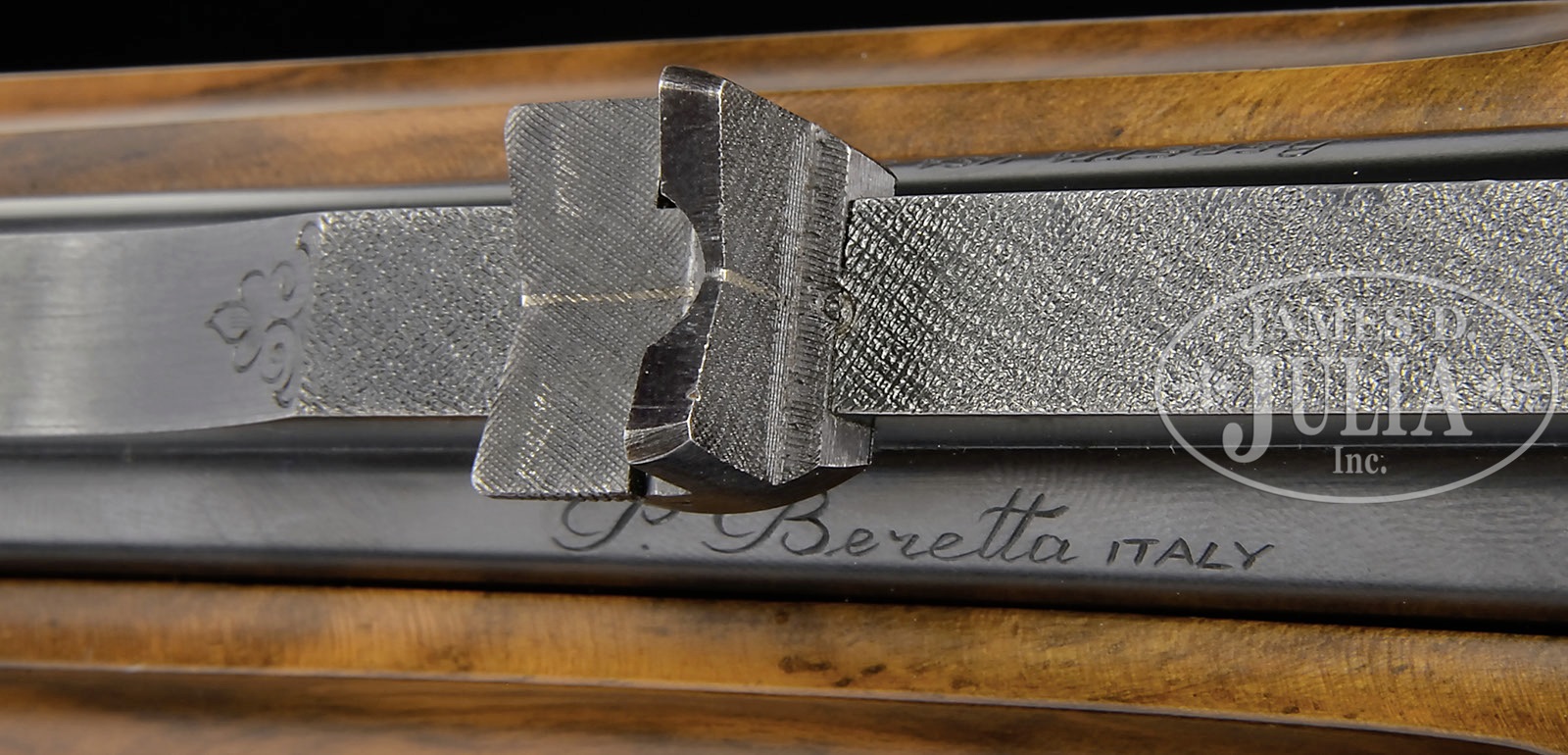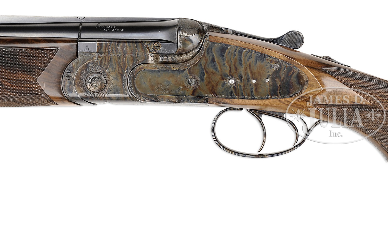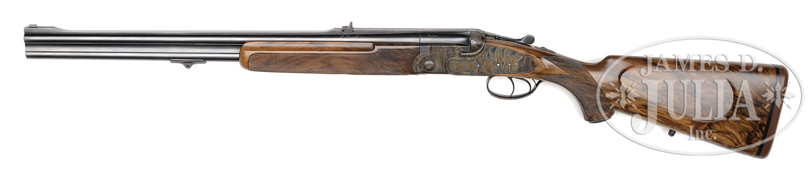 *BERETTA MODEL SS06 .458 OVER-UNDER EJECTOR DOUBLE RIFLE.SN C11352B. Cal. .458 Winchester Magnum. 24-3/8″ Mono-bloc bbls with full length rib cutaway at center to form quarter rib and front ramp, is matted on top. Rear portion of rib is fitted with one standing, one folding leaf rear, and bead front sight. Top bbl is engraved “P. Beretta ITALY” on left side of rib, and with “Beretta USA CORP., ACKK, MD.” on right. Top right of mono-bloc is engraved “CAT. 3787” top left, with caliber. Mono-bloc and bbls are stamped with 1991 Italian nitro proofs, grade, and SN. A long sling eye is soldered to bottom bbl. Robust, case hardened, Beretta low profile, OU sidelock action is fitted with non-automatic safety (S engraved), reinforcing bolsters, and double triggers. Action and lockplates are engraved with vine borders. “P. Beretta” is on each lockplate. Bottom of action is engraved “P. Beretta GARDONE V. T.” and “EXPRESS”. Double beaded trigger guard has SN at grip, which extends to case hardened, steel trap grip cap. Beautifully marbled, somewhat burl figured European walnut pistol grip buttstock measures 14-1/2″ over brown Old English pad, and features right hand classic cheekpiece, point pattern checkering with line border at grip, and a sling eye on toe line helping to secure a case hardened cartridge trap, with space for three cartridges. One piece matching forend has Deeley type release. Drop at heel: approx 2-5/16″, drop at comb: approx 1-15/16″. Weight: 10 lbs. 5 oz. LOP: 14-1/2″. CONDITION: Excellent, very near new. Only a few minor light marks are in wood or metal. Bores are excellent. Appears essentially unfired since proof. There are numerous assembly and disassembly marks on mono-bloc. Mechanically crisp. Front sight bead is broken off. Current suggested retail for this rifle is $75,000.00. 4-49551 MGM45 (15,000-25,000) – Lot 3418