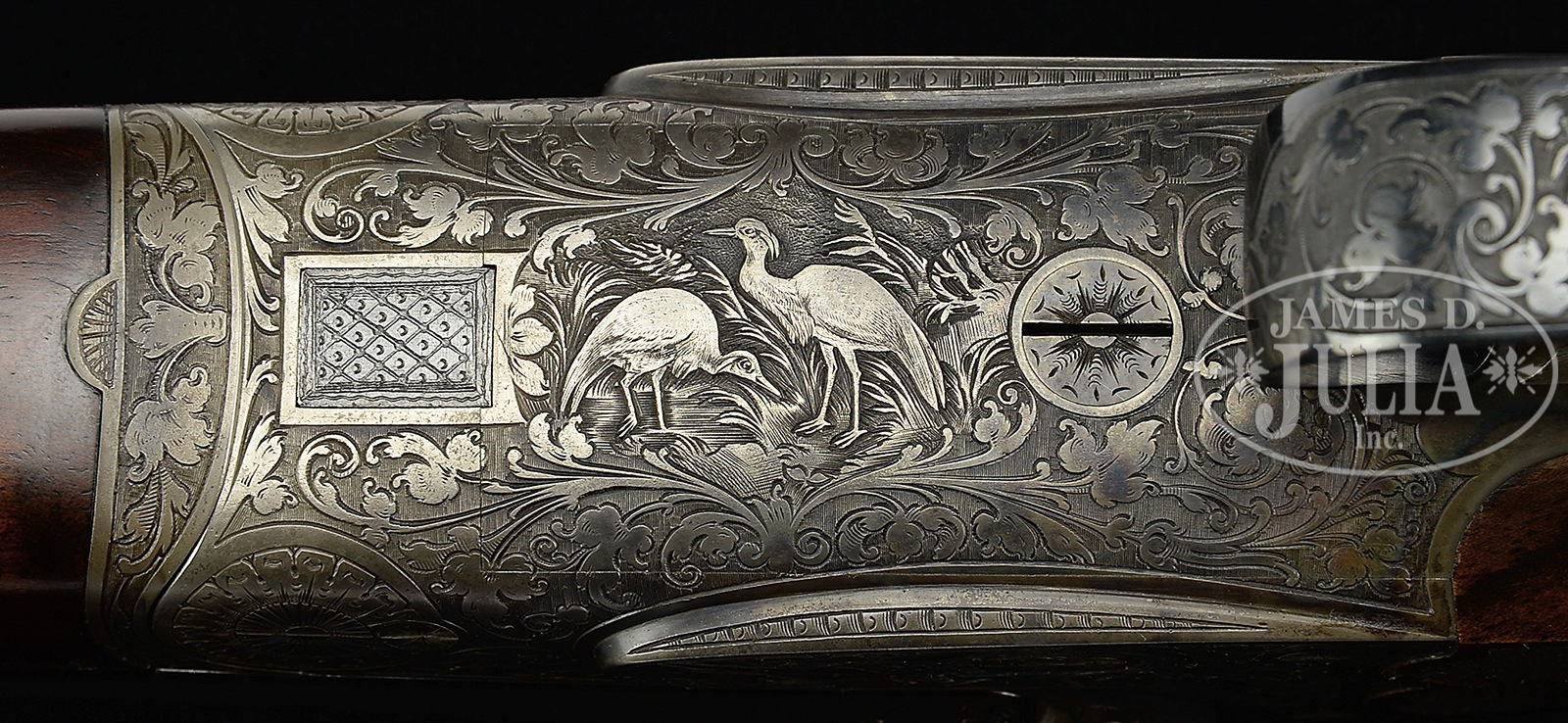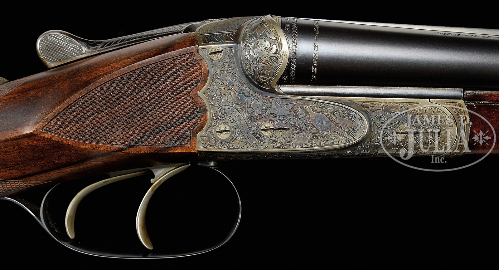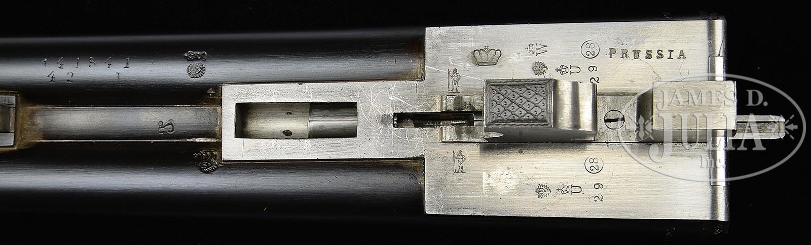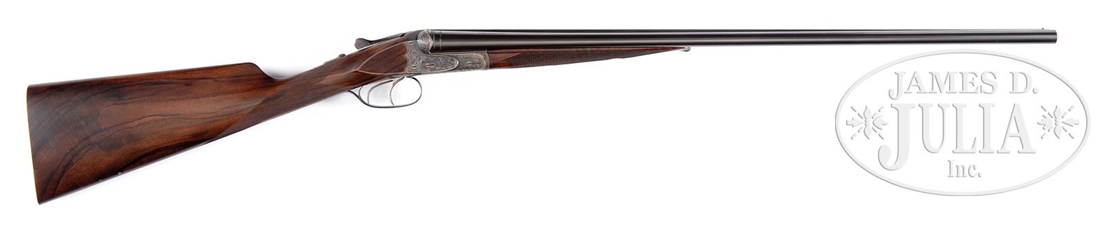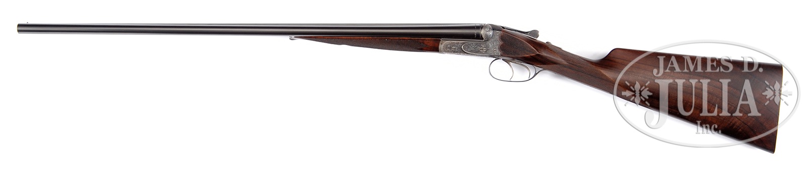 *DAINTY AND RARE 28 GAUGE MODEL 40E BOXLOCK EJECTOR GAME GUN BY J.P. SAUER.SN 141541. Cal. 28 ga. 2-3/4″ Chambers. 26″ Shoe lump bbls with concave, matted game rib, are engraved “J. P. SAUER & SON” on tops, with steel type around breech ends. Bbl flats are stamped with usual early Sauer markings of crowns, “W”, caveman logos, and “PRUSSIA”. Case hardened, small sized, scallop-backed, boxlock action features non-automatic safety (SAFE engraved), crossbolt third fastener, side clips, and dbl triggers. Action is engraved with especially well rendered large relief scrolling acanthus surrounding game scenes; pair of ducks on left, trio of pheasant on right, and cranes on bottom. “J. P. Sauer & Son” is in scrolled riband on each side. Blued trigger guard has pair of quail on bow, and SN at grip. High quality newly made straight grip buttstock is of well streaked and nicely figured European walnut, and measures 15″ over checkered wood butt. Grip and side panels are finely checkered. Orig splinter ejector forend has inset nicely shaped horn tip, and Deeley release. Bore diameter: left -.554, right – .554. Bore restrictions: left – .030 (full), right – .017 (mod). Wall thickness: left – .026, right – .030. Drop at heel: 2-1/4″, drop at comb: 1-3/8″. Neutral cast. Weight: 5 lbs. 6 oz. LOP: 15″. CONDITION: Very fine, as partially refurbished. Bbls retain nearly all of a fine quality rust re-blue. Action retains most of its orig case hardening color, silvered on bottom from normal hand wear. Newly made buttstock is excellent with a few very light handling marks. Orig forend refinished, checkering lightly worn. Bores are excellent. Action is tight. Ejectors are in time. This light and lively gun would be ideal for quail or woodcock. 50478-1 MGM28 (8,000-12,000) C&R – Lot 3419