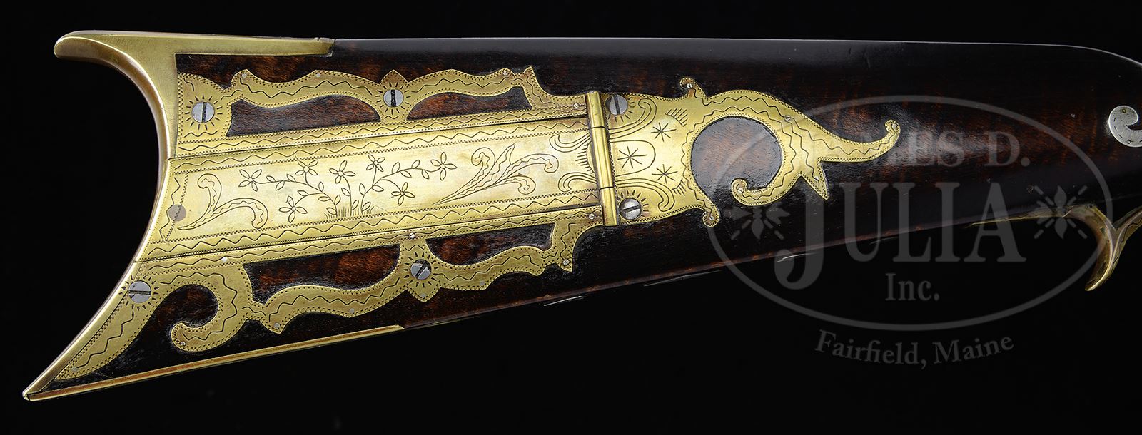 SN NSN. Cal. .32. Overall length 48″, 3-1/2″ x 5/8″ buttplate. 33-5/8″ full oct unmarked rifled bbl. This remarkable rifle is an absolutely beautiful example of a Somerset/Bedford rifle. The rifle has a 4-pc brass engraved patchbox with 4 piercings and a finial similar to the Dunmyer rifle on pg 88 of Gunsmiths of Bedford, Fulton, Huntingdon & Somerset Counties. The rifle has 27 attractive silver inlays, a 4″ engraved brass toe plate with 4 bone filled piercings and a striking 6-1/2″ engraved brass wear plate with 3 piercings one of which is bone filled. The outstanding brass engraved side plate features 3 bone filled piercings and the cheek piece has a silver running fox inlay. The percussion Bedford-style lock is initialed “E.C.” in script forward of the percussion nipple for “Elias Crissey” (Crissy). Crissey was born Feb 26th, 1835, and died July 18th, 1925. He lived in Hooversville, Shade Township, Somerset County all of his life. It is recorded that he served in the Civil War. Elias is buried in the Hooversville Reformed Church cemetery. It is believed by some that Crissey was apprenticed to Benjamin Franklin Vore (1814 – 1886) whose shop was located on the Bedford-Stoystown turnpike. Vore’s earlier guns have Bedford County lines and patchboxes and large hand forged locks. His later guns had his initials “B.V.” on the locks. One of Crissey’s rifles was exhibited at the 1876 Philadelphia Centennial Exhibition where it was awarded a prize for craftsmanship. This is by far the finest boys Kentucky rifle we have ever encountered. PROVENANCE: Peter Tillou Collection. CONDITION: Clean and orig. The lock on this magnificent rifle needs internal adjustment but the entire gun is in wonderful condition. 49612-1 RGG C&R (12,000-25,000) – Lot 3421