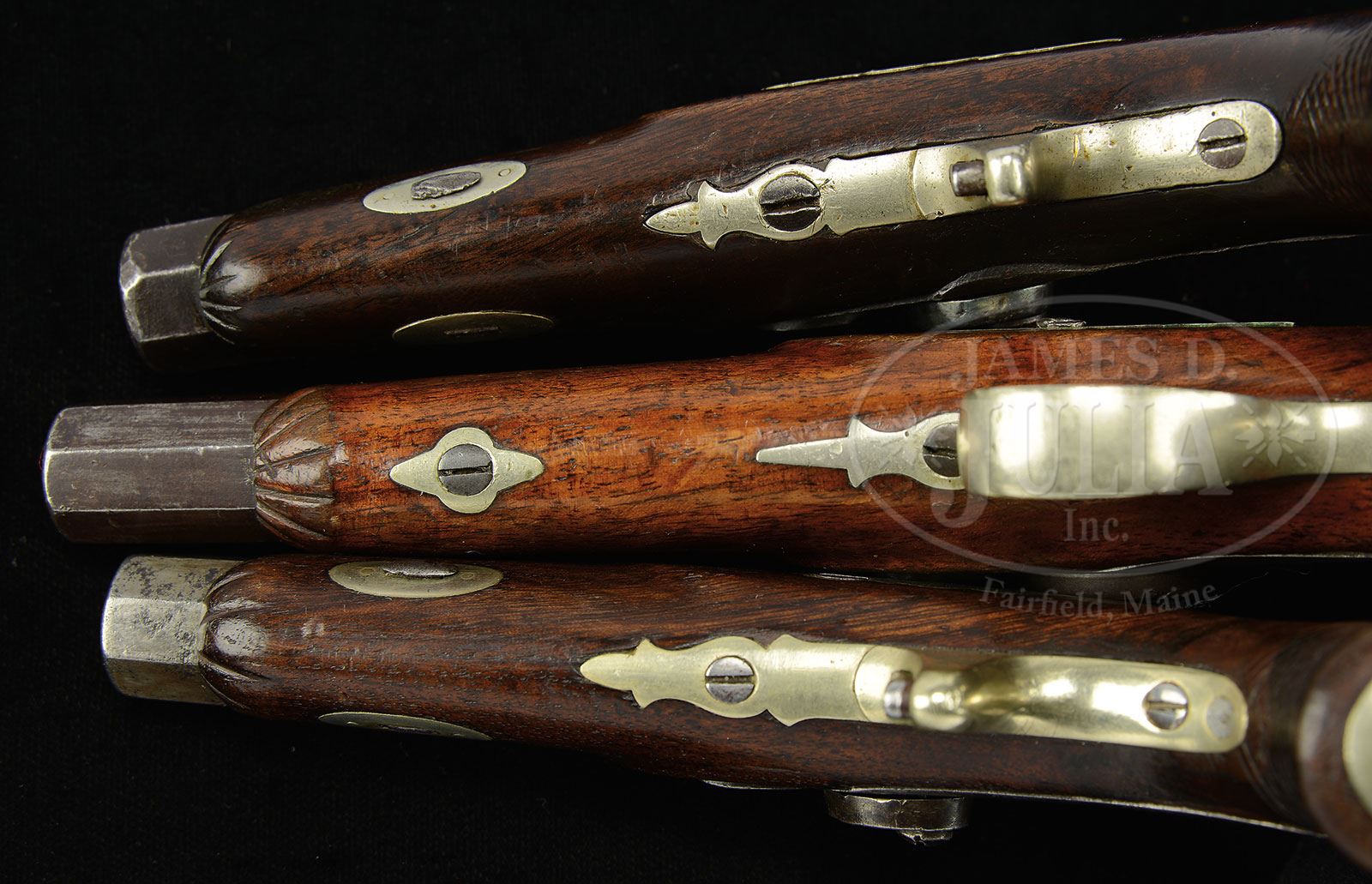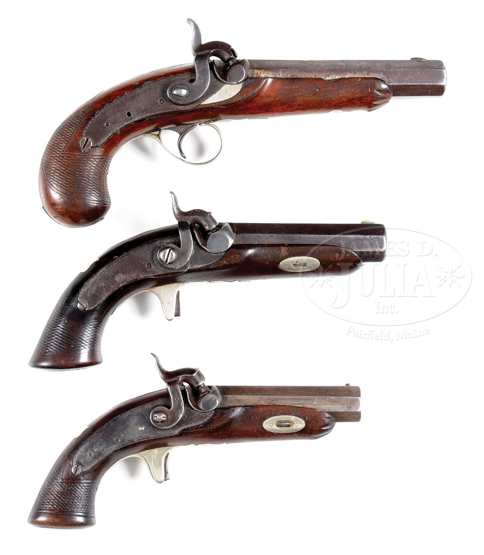 SN NSN. Offered here are the three variations of Schneider & Glassick Memphis deringers. 1) The Schneider & Glassick is pictured on p.196 of Eberhart & Wilson The Deringer in America Vol. 1 and is described in book “Pocket pistol. Barrel is 3″, breech 7/8″ (7” overall) in .42 caliber. German silver furniture and blade front sight; iron screws. This piece has a screw through the floorplate and into the bottom of the breech, and is threaded into the breech as well as the locking pin. Stock is walnut. Marked “SCHNEIDER & GLASSICK MEMPHIS, TENN.” on top barrel flat. Probably made by Bitterlich, Nashville, TN. 2) The Schneider is numbered “1” on breech and is marked “SCHNEIDER & CO/MEMPHIS.TENN” on its 2-3/4″ bbl, 3-1/2″ with breech. Gun measures 6-1/2″ overall. Mounted like Schneider & Glassick with spur trigger and German silver mounts. 3) This Glassick marked pistol measures about 8″ overall with 4-5/8″ bbl including breech. This gun has a most unusual feature with the date “1851” stamped on right side flat of bbl. Standard marking on bbl flat reads “F. GLASSICK & CO/MEMPHIS,TENN”. This is one of the larger deringer style pistols you will see, totally German silver mounted. This is a fine trio of Memphis pistols never offered in a set like this before. PROVENANCE: Maurie Fox Collection. Collection of John Montague. CONDITION: 1) Schneider & Glassick markings on bbl are quite weak and only partially discerned as can be seen in photos. Gun is good to very good overall, metal being brown/gray overall. Gun appears complete and orig with welded repair to top of hammer. Stock is sound with well fit mounts retaining traces of thinning varnish with hand worn patina. Gun exhibits numerous small scratches, nicks and blemishes typical after 150 years. Action is sloppy but functions with well discerned rifling in 48 Cal. bore. 2) Good to very good overall. Markings are discernible though pitting obscures much of the mark as can be seen in photos. Iron overall shows old cleaning and pitting and is gray overall. German silver mounts fit stock well. There is a glue repair to stock about 1″ above buttcap and at wrist. Stock retains hand worn patina with traces of varnish in protected areas. 3) Glassick is very good to fine overall. Bbl retains strong traces of thin brown finish. Breech, hammer and lock are smooth dark gray. Stock has several minor chips around lock and on right side along bbl, well fit overall retaining 50-60% orig varnish. Hammer has a large chip on front right side. Mechanically gun binds when cocked. Discernible rifling in a pitted 48 Cal. bore. 4-54344 JS200 (9,000-12,000) – Lot 3422
