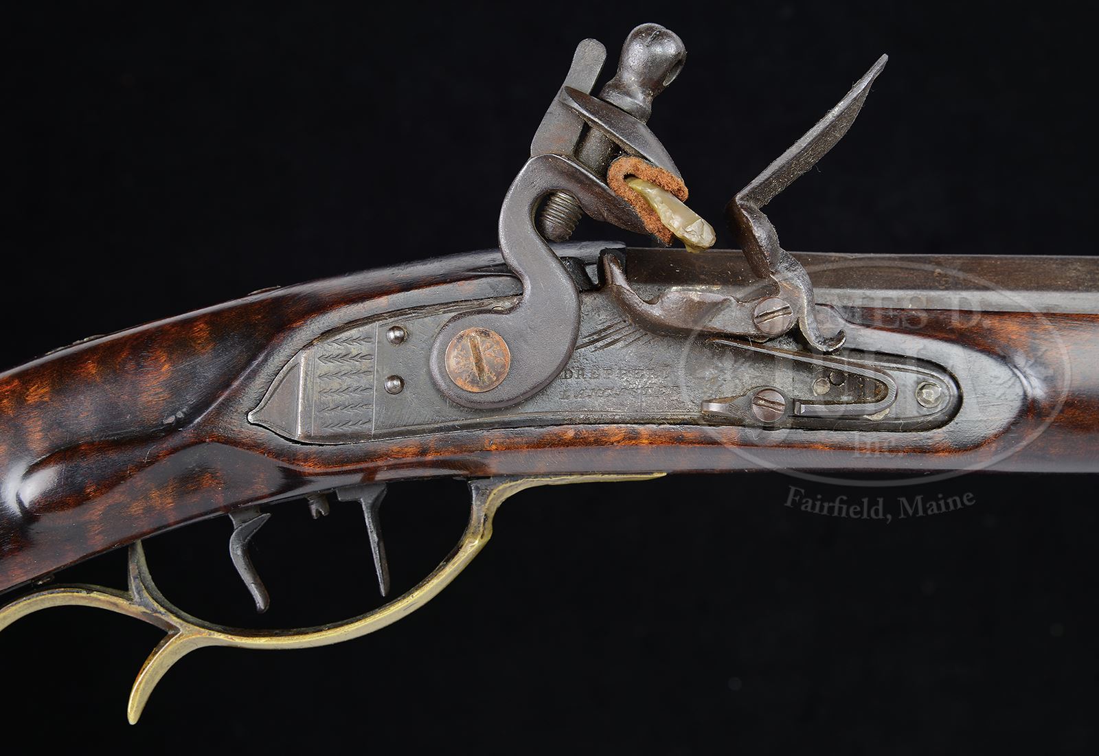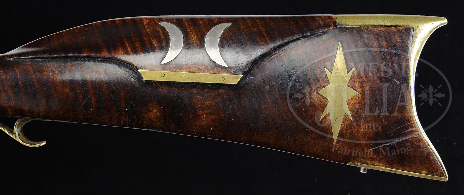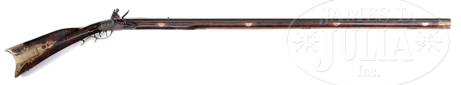 CURLY MAPLE FLINTLOCK KENTUCKY RIFLE BY SOLOMON WARD OF JAMESTOWN NORTH CAROLINA.SN NSN. Cal. .41. Overall length 61-1/2″, 4-1/4″ x 1-1/4″ buttplate. 45-7/8″ full oct bbl signed “S.H. Ward”. 4-pc brass patchbox with 9 piercings. Drepperd Lancaster, PA, marked flint lock. Curly maple rifle has 10 silver inlays, flat brass 2-screw side plate, a flat brass 3/8″ inlay on the cheek piece and a brass 8 pointed star behind the cheek. The rear ramrod entrance furrow has an intricate rear tang with 1 piercing. Solomon Ward (1838 – 1905) was one of the last of the Jamestown, NC, makers. His shop was located off Guilford College Road, at the present day Cedar Wood development. CONDITION: Lock appears to be a re-conversion. The patchbox appears to be orig to the rifle however was modified by the gunsmith to fit the curvature of the buttplate. 49254-26 RGG (7,000-10,000) – Lot 3423