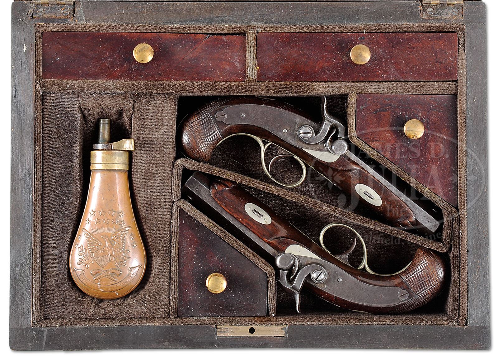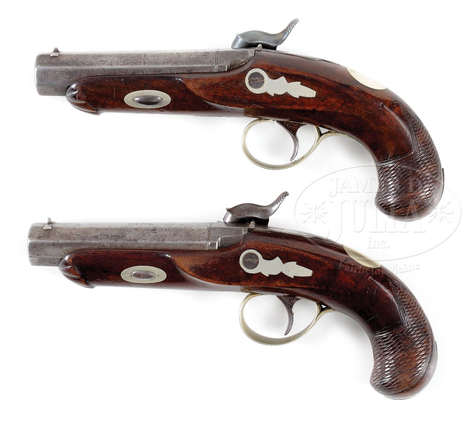 CASED MATCHING PAIR SNEIDER & CO MEMPHIS TENNESSEE DERINGERS.SN 47. This is a rare matching pair, SN 47 “SNEIDER & CO/MEMPHIS TENN” marked deringers. Each gun is also numbered “1” & “2” on bbl tangs. SN 47 is found on each breech. Guns are quite elegant in their lines with simple engraved borders and plain German silver mounts. The burled walnut stocks have carved scallop shaped noses. This pair is listed by SN in Eberhart & Wilson in their text The Deringer in America Vol. 1. There are few pairs in such fine matching condition known by Sneider. PROVENANCE: Dr. G.W. Huckaba, Memphis, TN. Collection of John Montague. CONDITION: Guns are in very good matching condition with gray metal with good markings, gun “2” has rebound in stamped marking but is still fully discernible, scattered staining and pitting. German silver mounts are well fit in stocks that retain about 80% of their orig varnish. Gun “1” has about a 2″ glued repair on right side from muzzle back above escutcheon that does not affect aesthetics as can be seen in photos. Gun “2” has welded repair to crack on ear of hammer. Mechanically both guns are functional with discernible rifling in pitted bores. Brass banded casing is a 19th century box with more modern compartmentalizing for display with an eagle pistol flask, scissor ball mold, loading rod and nipple wrench. 4-54303 JS192 (7,500-9,500) – Lot 3424