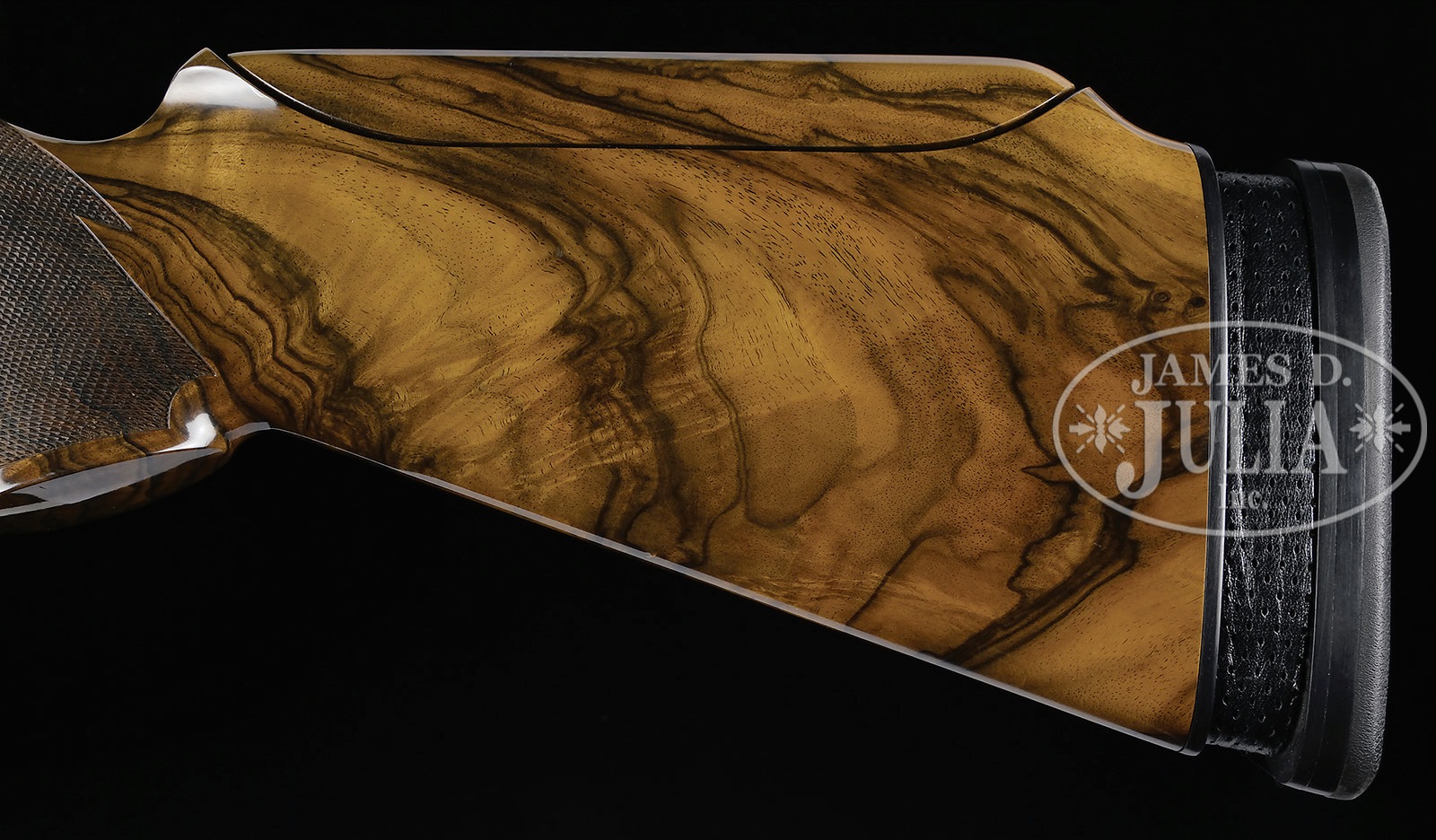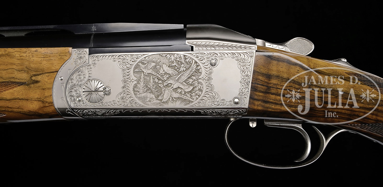 *KRIEGHOFF K80 BAVARIA GRADE SKEET FIVE BARREL SET WITH TWO CASES BY HUEY.SN 12303. Cal. 12 ga./ 12 ga./ 20 ga./ 28 ga./ .410. The two 12 ga. bbls have 2-3/4″ chambers, one with broadway style rib the other with standard ventilated rib. 20 ga. with 3″ chambers. 28 ga. with 3″ chambers, and .410 with 3″ chambers. All bbl sets are 28″ long, with ventilated ribs, and marked “BOHLER LAUFSTAHL”. All bbls have importers name on left side of bottom bbl, and are choked skeet and skeet. Bottoms of mono-blocs are stamped with SNs and “SHOTGUNS OF ULM”. Both 12 ga. bbls are ported on both sides of bottom bbl. Coin finished K 80 action features blocked out safety, and selective single trigger. Action is engraved in “Bavaria” style with well cut, large and medium scroll, framing vignettes of birds on each side; an eagle swoops upon a hapless pheasant while his partner escapes on left side of action, and a trio of ducks flush from marsh on right. Bottom of action is marked “K 80 SHOTGUNS OF ULM” and “Ulm W Germany”. Spectacular dark marbled and flame figured European walnut full pistol grip buttstock measures 14-3/4″ over black Decelerator pad with spring recoil reducer. Stock also features adjustable comb, right hand palm swell, and nicely cut borderless point pattern checkering. Full one piece matching forend has Deeley type release. 12 ga. with broadway style rib: Weight:8 lbs 15 oz. 12 ga. with standard ventilated rib: 8 lbs. 13 oz. 20 ga.: 8 lbs. 14 oz. 28 ga.: 8 lbs. 14oz. 410: 8 lbs. 13 oz. LOP: 14-3/4″. Best quality Huey oak and leather motor cases with canvas leather trimmed outer covers are numbered “1356” and “1357”. Cases are of russet leather with brass corners. Interiors are lined in green suede. Case for action and broadway style rib bbls contains cleaning equipment, snap caps, chamber brush, and oil bottle. Second case contains four skeet bbls with lift-out tray holding 12 and 20 ga. bbls. CONDITION: Excellent, near new, with evidence of very little firing, mostly of 12 ga. bbls. There are only a few light minor marks on metal, and some rubs and light scratches on stocks. Cases are excellent, near new. Accessories show some tarnish. An exceptional, well matched, skeet set. This set was discontinued in 1999, at that time suggested retail was over $22,000.00. 4-50979 MGM77 (12,500-22,500) – Lot 3425