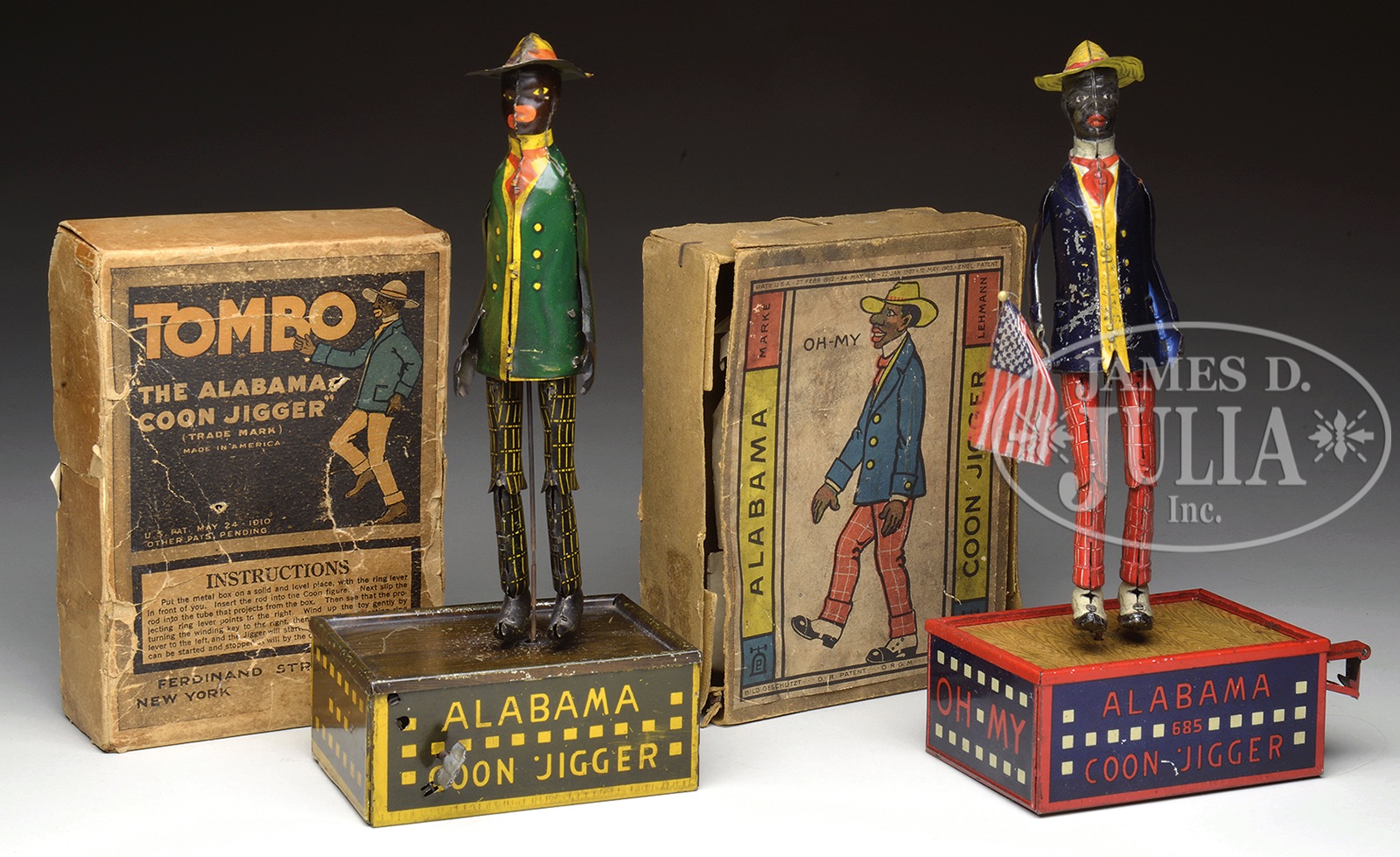 STRAUSS AND LEHMANN COON JIGGERS WITH ORIGINAL BOXES.1) The Strauss version, also known as Tombo is not as common as Marx coon jiggers and the figure itself is slightly taller than the Marx version. The dapper dressed gent wears a plantation style hat. The overall condition of this toy is very good with the most notable wear is where his feet strike the simulated wood platform. Original box is in fair condition with some reinforcing visible on the inside. 2) Lehmann Alabama Coon Jigger, also known as Oh My, is very similar in nature and appearance to the Strauss version. This toy is in very good original condition except where his right arm rubs against his body and where his feet strike the simulated wood platform. Box is in fair condition, missing a side flap on the lid. It retains original directions on the underside of the box lid. SIZE: Both are 10″ h. CONDITION: As stated above. Both are functional. 1-14217, 1-14218 (600-800) – Lot 3428 Auction: Advertising, Toy & Doll - Spring 2014 Please Note: All prices include the hammer price plus the buyer’s premium, which is paid by the buyer as part of the purchase price. The prices noted here after the auction are considered unofficial and do not become official until after the 46th day. |