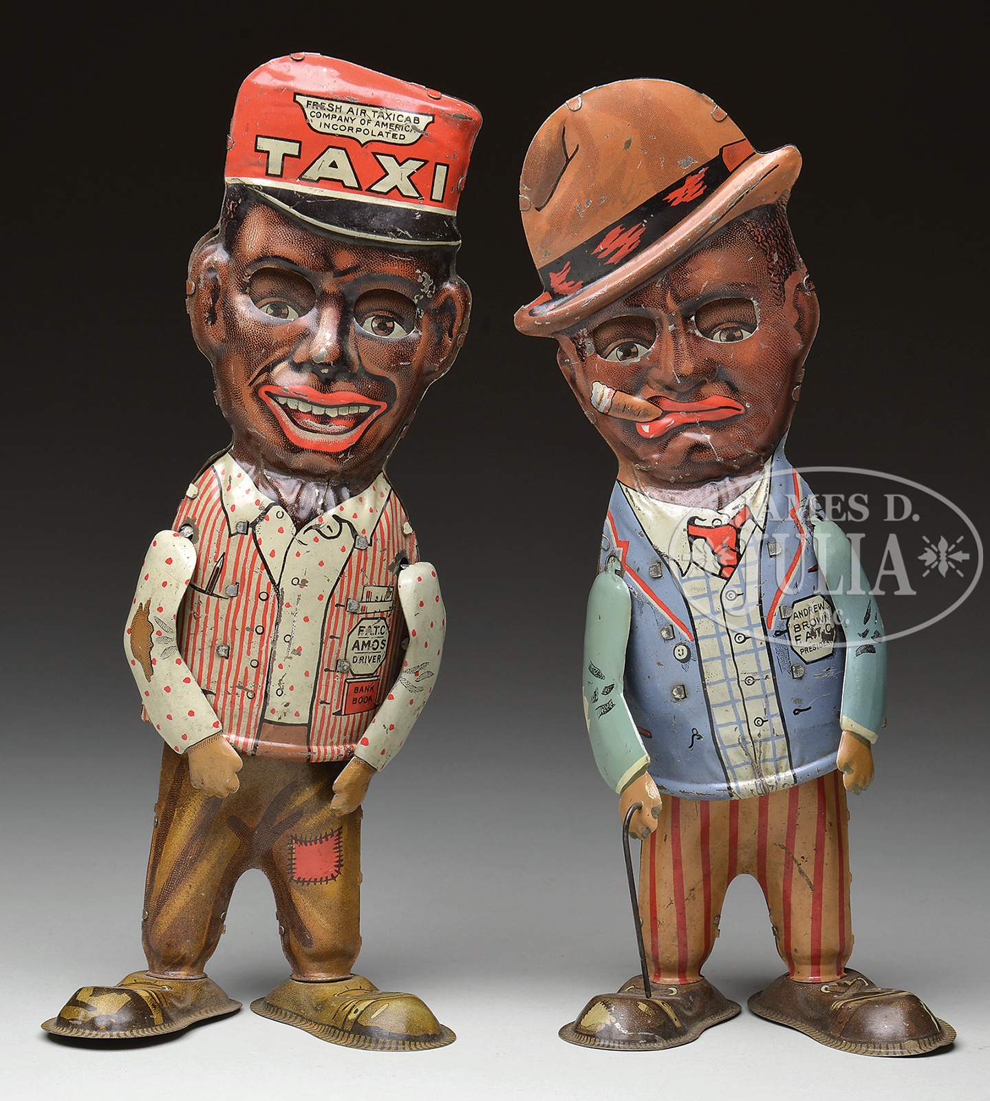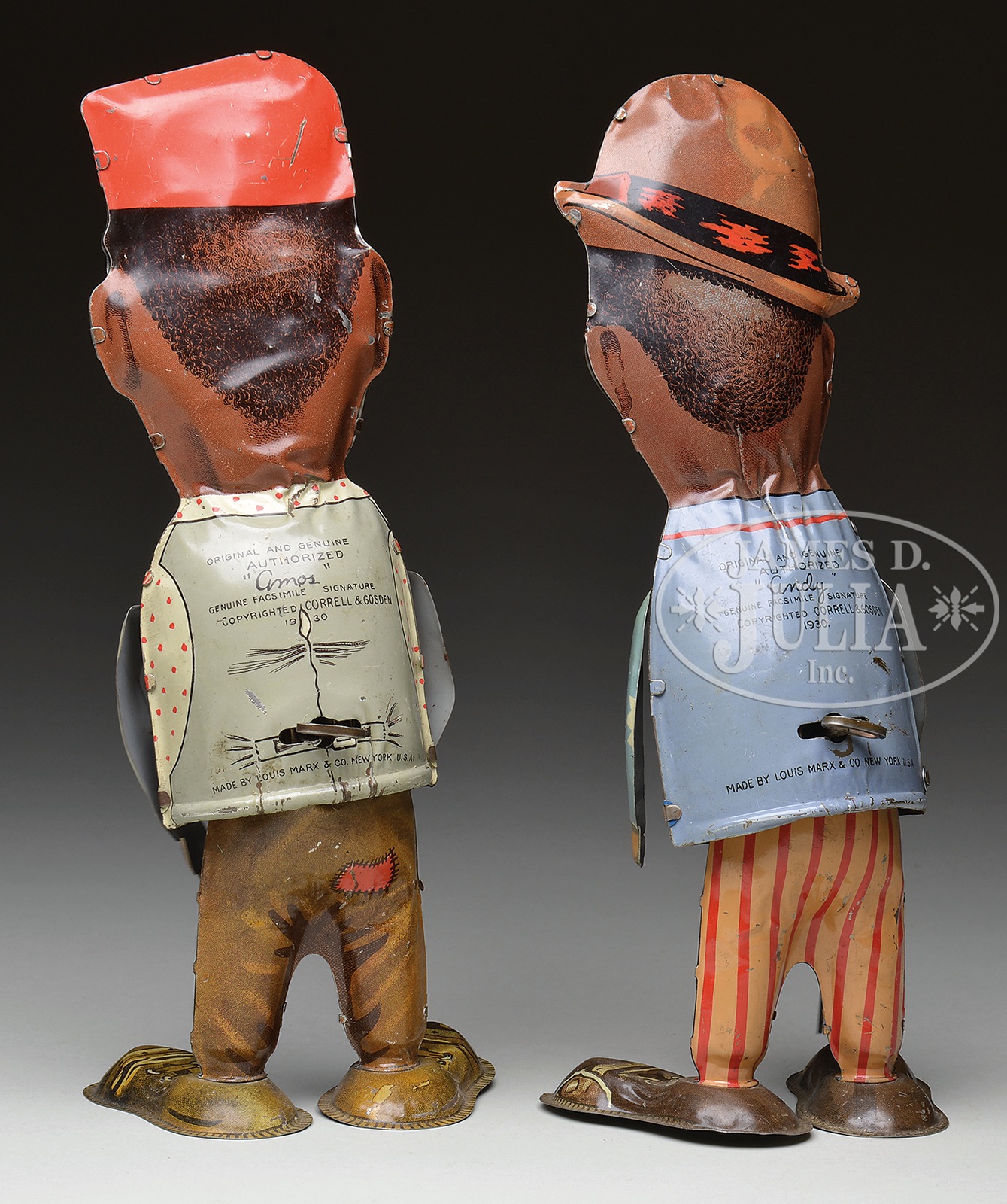 MARX AMOS & ANDY WALKERS.The more desirable set with the moving facial features, these finely lithographed walking figures were most popular with children of the 1930s. As they wobbled along, their eyes rose and fell and their arms shook about (Andy’s arms replaced). Both figures are in working order. SIZE: 11″ h. CONDITION: Typical wear, but overall good plus condition. 1-14225 (500-700) – Lot 3429 Auction: Advertising, Toy & Doll - Spring 2014 Please Note: All prices include the hammer price plus the buyer’s premium, which is paid by the buyer as part of the purchase price. The prices noted here after the auction are considered unofficial and do not become official until after the 46th day. |