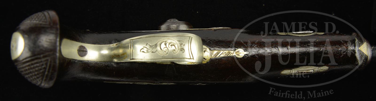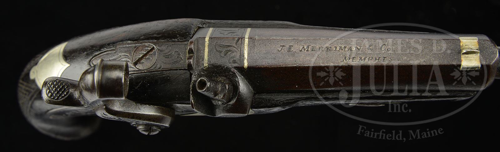 RARE CASED MATCHED PAIR OF “J.E. MERRIMAN” MEMPHIS TENNESSEE DERINGERS.SN NSN. This is most likely the only matched pair of Merriman deringers known. Overall these guns measure about 6″ long with 2-7/16″ bbls, 3-1/16″ with breeches. According to Eberhart & Wilson in their text The Deringer in America Vol. 1 Merriman was primarily a jeweler who sold guns on the side and probably did not manufacture. According to the 1855 city directory Merriman employed “one of the most skillful London engravers” and this gun is engraved on bbl flat in the English style “J.E. MERRIMAN & CO MEMPHIS”. Locks, breeches, tangs and German silver mounts are also engraved. Both guns being engraved in the same style and matching fairly closely though crudely done by the same hand. Bbls, breeches and stocks internally are assembly numbered “I” & “II”. There are no foreign proofs. Regardless if Merriman or someone else manufactured this matching pair they are indeed finely marked and present beautifully in the accompanying case. PROVENANCE: Collection of John Montague. CONDITION: Guns are very good overall appearing orig, complete and authentic throughout. Bbls are dark gray/brown with pitting. Other iron surfaces are dark gray with light pitting. German silver mounts are well fit into dark straight grain stocks. Still retaining about 70-80% darkened and thinning varnish. Mechanically guns function though there his no discernible half-cock stop. Bores have crisp well discerned rifling with pitting in 44 Cal. Accompanying casing is made from a 19th century mahogany box with later 20th century compartmentalizing for guns and accessories which include flask, scissor mold, balls and enameled cap tin. Casing and accessories display guns well. 4-54402 JS193 (6,000-8,000) – Lot 3429
