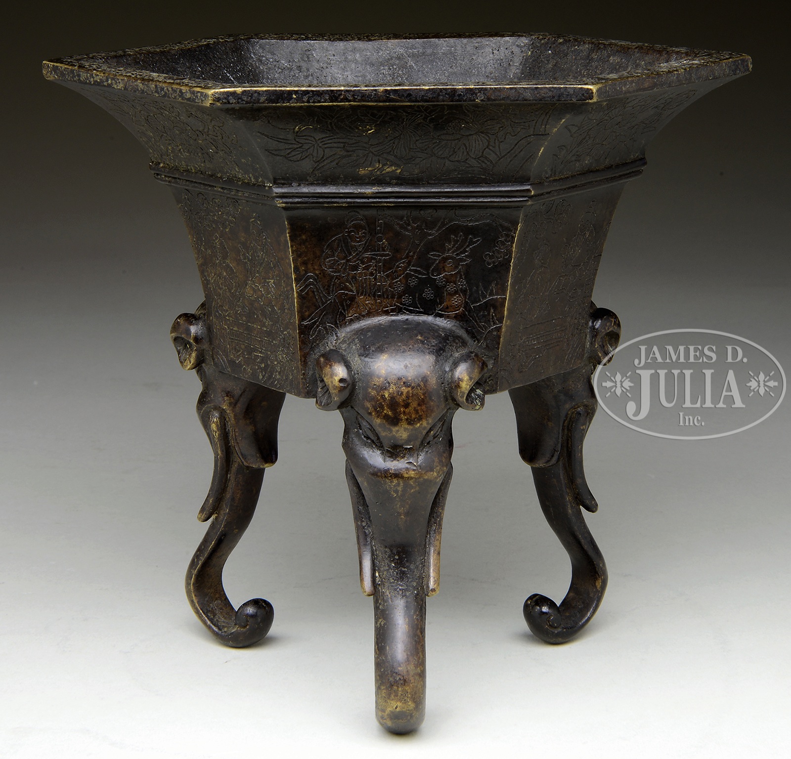 HEXAGONAL BRONZE TRIPOD CENSER.19th century, China. The censer’s body in hexagonal shape, tapering down and supported by three elephant mask and nose legs, the body gold lined with floral patterns, and bottom bears four character QIANLONG mark. SIZE: H: 7 in (17.8cm) W: 7 3/4 in (19.7cm). CONDITION: Good. 9-96871 (1,200-1,500) – Lot 3429