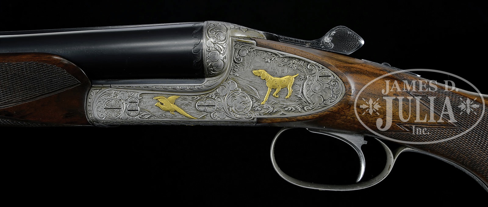 *FINELY ENGRAVED WAFFEN – DSCHULNIGG SIDEPLATED BOXLOCK GAME GUN WITH CASE.SN 40-1308. Cal. 12 ga. 2-3/4″ Chambers. 28″ Shoe lump bbls with matted, concave game rib, are engraved “Made in Austria” and “Waffen – Dschulnigg – Salzburg” on tops. Bbl flats are stamped with Ferlach nitro proofs with date of 1959. Bottoms of bbls are stamped with gauge and chamber information, provisional proofs, and “BOHLER – BLITZ – STAHL”. Coin finished, sideplated, boxlock action features single selective trigger, hidden crossbolt third fastener, and bolstered sides. Action is engraved with very well cut, classic, Germanic, open, scrolled acanthus framing game scenes with relief gold inlaid mammals and birds in well detailed backgrounds; a pointer points a flushing pheasant on left side of action, and a wily fox stocks a rising duck on right. A rabbit scampers across trigger plate, and a snipe settles into a marsh on trigger guard bow. Central points of acanthus leaves have been polished bright to accentuate depth of scroll. Very finely marbled and lightly figured European walnut horn capped pistol grip buttstock measures 13-7/8″ over checkered horn buttplate. Point pattern checkering with broad mullered borders is at grip. Long, beavertail, ejector forend has matching engraving and Deeley release. Bore diameter: left-.715, right -.716. Bore restrictions: left -.010 (IC), right -.004 (Skeet). Minimum wall thickness: left -.039, right -.038. Drop at heel: 2-7/8″, drop at comb: 1-3/8″. Weight: 7 lbs. 5 oz. LOP: 13-7/8″. Oak and leather English style case by Nick Makinson, with brass corners and brass rectangle on lid engraved “W F Willson” has red canvas outer cover with Nick Makinson label. Case is lined in burgundy cloth. Partitions have oak accents on tops, and a number of accessories are French fitted including, horn handled turnscrews, snap caps, round English oil bottle, a 2-pc brass and ebony cleaning rod under bbl recess, and mop, jag, and brush in a covered compartment, along with the key. CONDITION: Excellent.retaining nearly all orig blue on bbls, with a few minor light scuffs and marks. Action retains essentially all of its fine French gray finish, with some oil discoloration where protected. Stocks retain nearly all of what appears to be an old oil refinish, with some light subsequent marks. Beads behind lockplates have incipient cracks. Horn grip cap and buttplate are excellent, shiny, but with some light checks. Bores are excellent. Action is very slightly loose. Ejectors are strong and in time. Trigger works. Dark case leather is excellent, brass fixtures slightly tarnished. Straps and handle are very fine. Lock retaining loops are missing. Interior cloth is excellent with some minor soiling from contact with breech ends of bbls. Accessories are excellent, near new. Horn handles of turnscrews have some slight checks. 4-50837 MGM36 (4,500-7,500) – Lot 3430