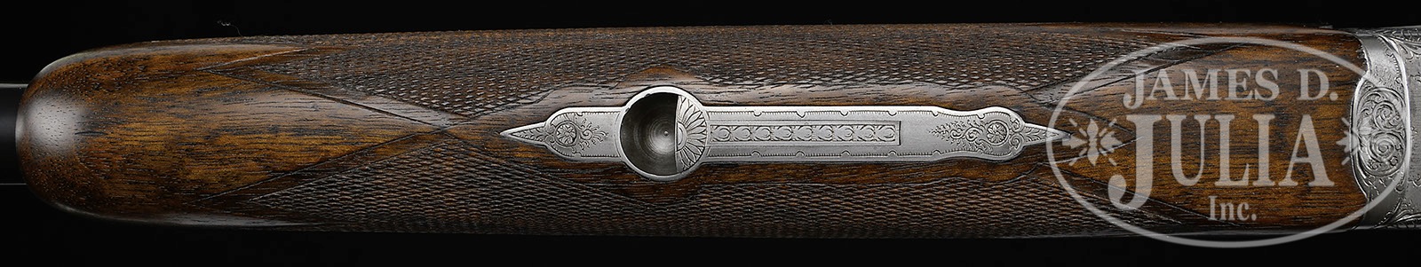 *JOHANN MICHELITSCH FERLACH MODEL 25E SIDELOCK OVER-UNDER HEAVY GAME GUN.SN 41619. Cal. 12 ga. 2-3/4″ Chambers. 30″ Demi-bloc bbls are fitted with narrow, ventilated, matted rib engraved “Made in Austria”. Bottom bbl is stamped with 1958 Ferlach proofs, SN, and Michelitsch logo. Coin finished, sidelock, double Kersten action features side bolsters, non-automatic safety, and Miller single selective trigger, with selector in front of trigger. Action is engraved with flourishes of well cut, medium, shaded scroll surrounding interesting vignettes of game birds on sideplates; a trio of long necked waterfowl erupt from marsh on left lock, and a trio of pheasants are at rest in wooded area on right. Bottom of action is engraved “JOH. MICHELITSCH FERLACH AUSTRIA MOD. 25E” in long riband through scroll. Finely flame figured and nicely marbled European walnut horn capped pistol grip buttstock with Monte Carlo comb, measures 14-1/2″ over black KICK-EEZ pad with two 1/4″ leather spacers. Point pattern checkering with broad, flat, mullered borders is at grip. Matching three piece ejector forend has Deeley release. Bore diameter: top -.714, bottom -.715. Bore restrictions: top -.037 (Full), bottom -.036 (Full). Minimum wall thickness: top-.037, bottom -.032. Drop at heel: 2-1/16″, drop at rear of Monte comb: 1-5/8″. Drop at comb: 1-1/2″. Weight: 8 lbs. 3 oz. LOP: 14-1/2″. CONDITION: Excellent. Bbls retain 90 – 95% of what appears to be orig blue, thinning overall. Action retains nearly all of its coin finish, somewhat darkened overall. Top lever and trigger guard are considerably silvered. Stocks retain most of what appears to be their orig finish, with several minor marks. Butt portion possibly re-oil finished with installation of new pad. Checkering is slightly worn. Bores are excellent. Action is tight. Ejectors are strong and in time. Miller trigger works. 4-50138 MGM38 (3,500-5,500) – Lot 3431