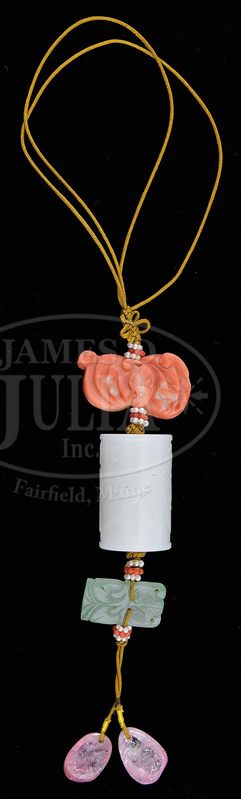 JADE PENDANT. 18/19th century, China. Pure white cylinder carved with a warrior and an inscription. Mounted with coral, green jade, and tourmaline. Coral carved as a bat on one side and cash coins on the reverse. SIZE: Jade is 1-1/4″ l. CONDITION: Very good. 9-91003 (2,500-3,500)