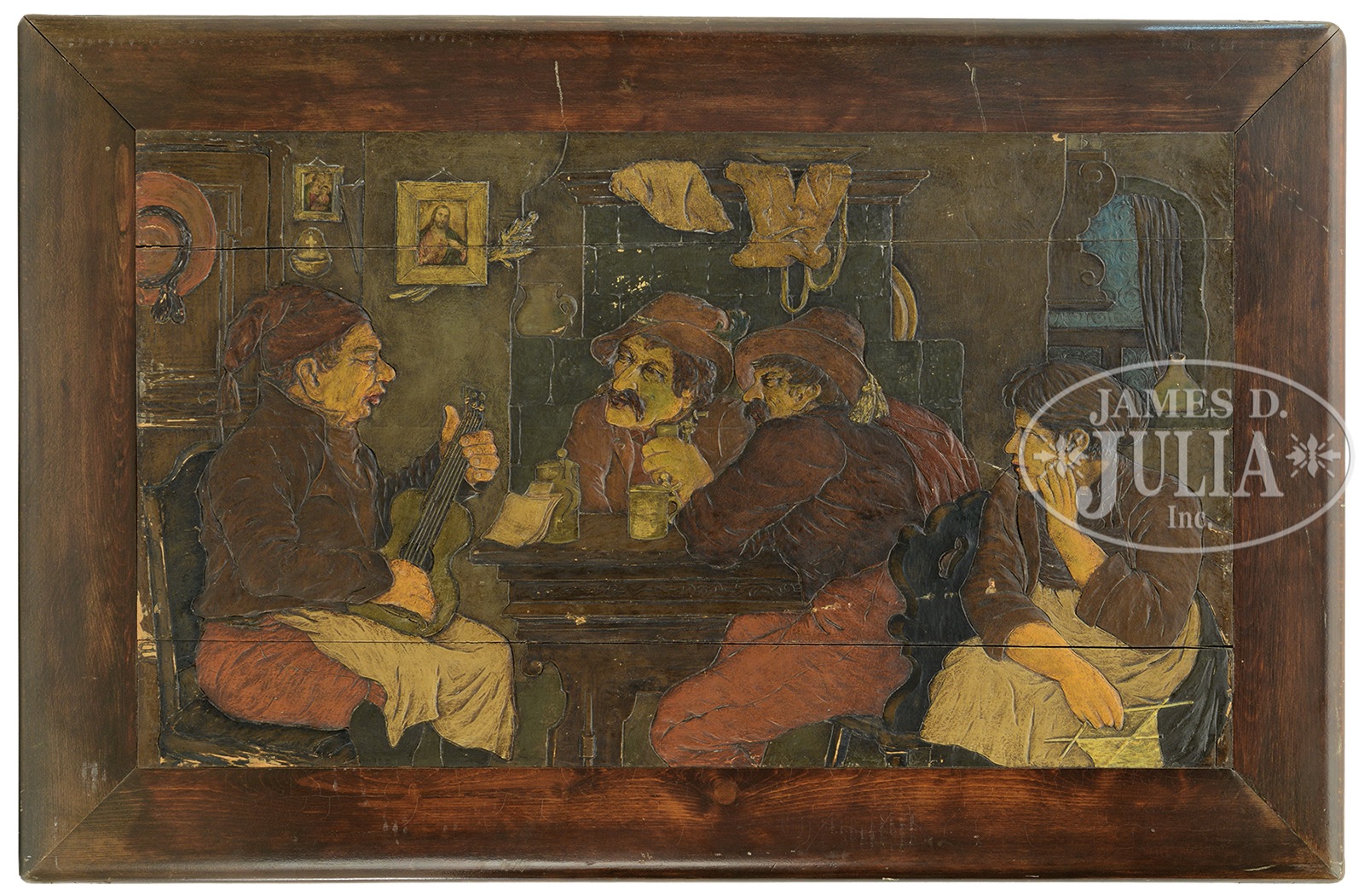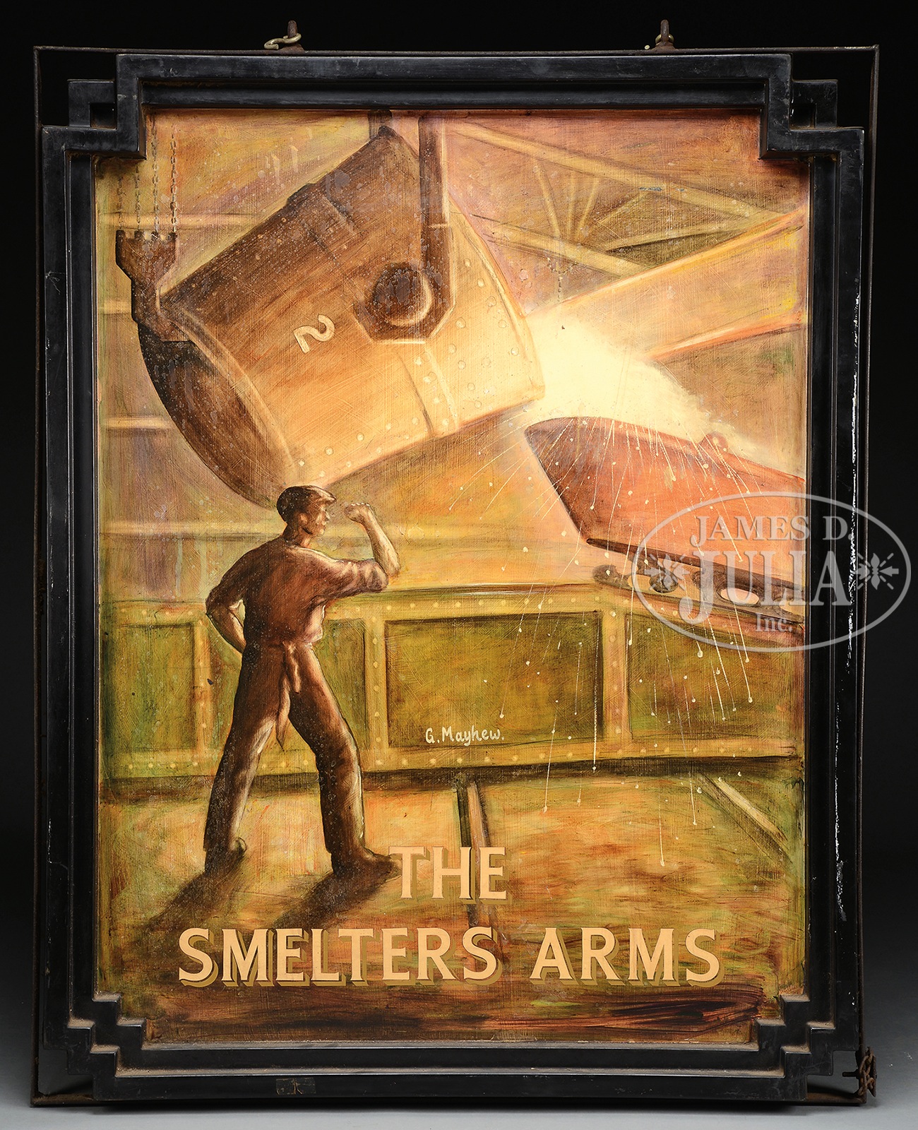 1) Hand carved and painted low relief picture shows three men and a woman in an interior tavern setting. Note on reverse indicated that is was found in an attic in St. Louis in 1945. Probably of German origin. The picture housed within a 4″ frame. 2) A two sided hanging sign “The Smelters Arms”, artwork by G. Mayhew, most likely a sign outside a tavern. Heavy iron hanging frame. The scene shows a smelter flexing his arm with a foundry bucket tilting its contents into a mold. SIZE: 1) Total 28″ x 43″. 2) Total 52″ x 42″ x 5″ d. PROVENANCE: From the personal estate collection of Michael Urioste of Gadsden Alabama. CONDITION: 1) Some light chips and scrapes, separation lines at seams. Good. 2) Some scratches, generally good. 49354-46 (700-900) – Lot 3434