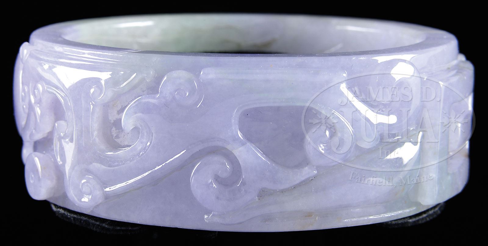 CARVED LAVENDER JADE BRACELET. Carving of archaic scrolling. Natural color. No indication of treatment. Accompanied by a Stone Group Laboratories certificate. SIZE: Interior: 2-1/4″ dia. CONDITION: Generally very good. 7-74580 (5,000-7,000)