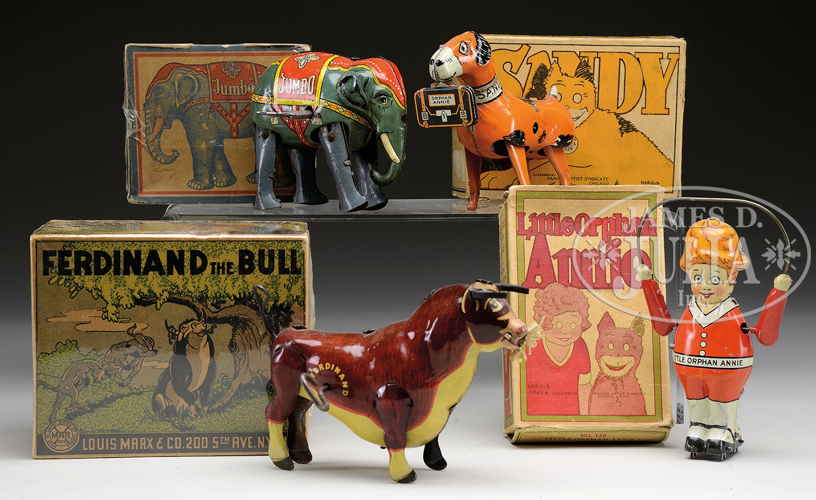 FOUR TIN WINDUP TOYS ALL WITH O.B.1) Ferdinand the Bull by Marx, copyright 1938 by Walt Disney. Movie character twirls tail as he spins in circles. Complete with original flower and bee. 2) Little Orphan Annie, copyright Harold Gray. Colorful all tin lithograph character skips rope. 3) Little Orphan Annie’s “Sandy”. License by Famous Artist Syndicate. Comic character dog walks forward holding suitcase. 4) Jumbo the Elephant, US Zone Germany. Famous Barnum & Bailey elephant walks forward. SIZE: Largest is 6″ l. CONDITION: All toys are working and in near excellent condition. Two of the boxes are sealed, two others are good to very good. 1-13880 (700-900) – Lot 3435 Auction: Advertising, Toy & Doll - Spring 2014 Please Note: All prices include the hammer price plus the buyer’s premium, which is paid by the buyer as part of the purchase price. The prices noted here after the auction are considered unofficial and do not become official until after the 46th day. |