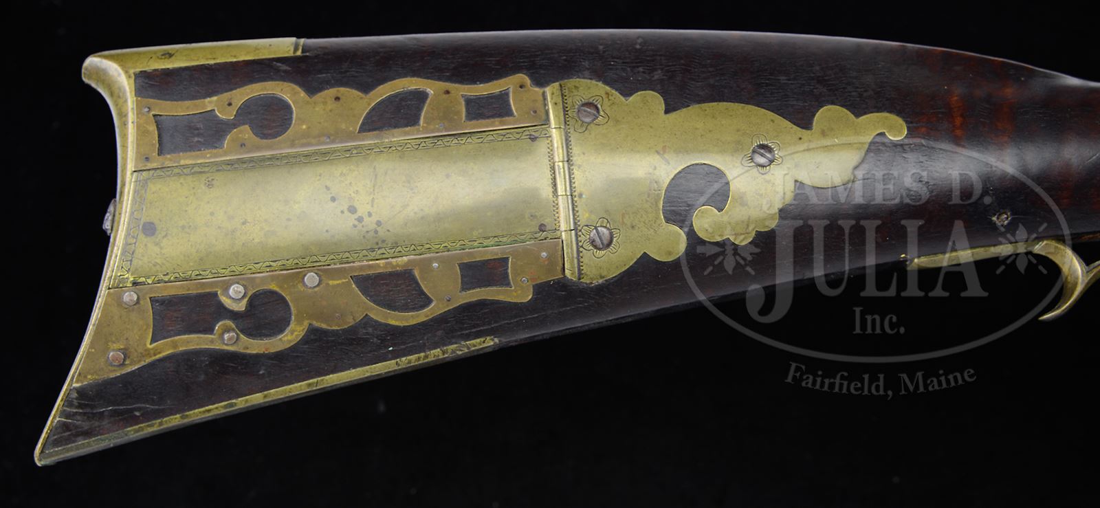 CURLY MAPLE FLINTLOCK KENTUCKY RIFLE ATTRIBUTED TO JACOB ALBRIGHT JR FROM MIFFLIN COUNTY, PA.SN NSN. Cal. .48. Overall length 59-1/2″, 4″ X 1-1/2″ buttplate. 44-5/8″ full oct unsigned rifled bbl. The bbl is held to the stock by 4 bbl wedges. This gun has a 4-pc brass patchbox with 6 piercings, 4-1/2″ brass toe plate and a flat brass 4-1/4″ horned sideplate. There is a silver half-moon inlay above the cheek piece and a “certifiable antique ivory” cheek piece inlay. There are 8 silver inlays decorating the forestock and an oval silver thumb piece inlay. The flint lock is marked “London Warranted” and the gun has double set triggers. Jacob Albright Jr., was born in Mifflin County, PA, in 1803 where he worked until 1830 after which he relocated to Wooster, OH. His father Jacob Albright worked in Center County, PA, after 1802.Consignor states purchased from attic in 1960 and has remained untouched. Special Note: This item contains or is made of ivory. Do not bid on this lot unless you have read and agreed to our "Ivory Position Statement" and the "Waiver of Legal and Financial Risk to James D. Julia in regards to your Purchase of an Ivory Object." This information is located in the front section of our catalog. CONDITION: 12″ of the forend wood has been replaced. The flint lock has been reconverted. The patchbox release needs adjustment and 5 of the pins holding the lower leaf of the patchbox have been replaced. Aside from some wood repair, gun shows honest wear. 49239-5 RGG C&R; IVORY (3,500-6,500) – Lot 3437 Click here to view provenance
