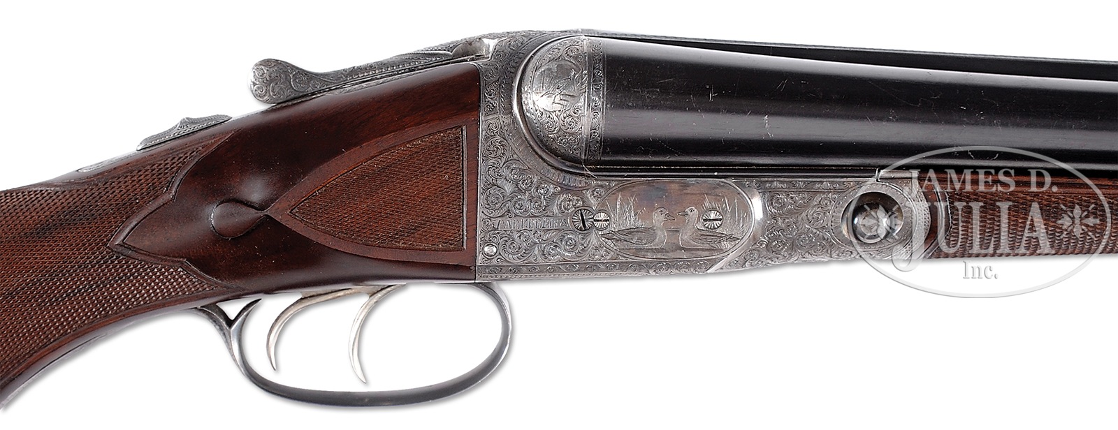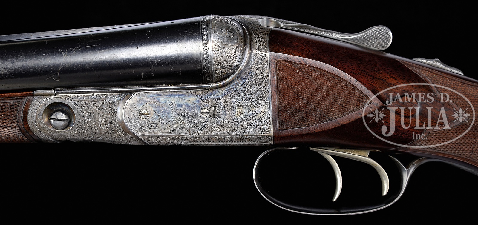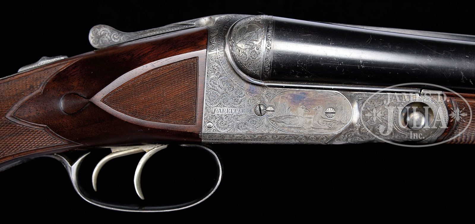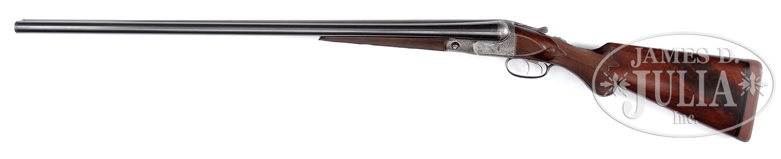 *PARKER “AHE” SHOTGUN WITH UNUSUAL SEMI-RELIEF ENGRAVED DOG ON FLOORPLATE AND HIGH ORIGINAL METAL CONDITION.SN 196508. Cal. 12 ga. 2-3/4″ Chambers. 2 Frame. 30″ Bbls are marked with Parker’s name and Meriden CT address, and “ACME STEEL”, on matted game rib. Bbl flats are stamped with all correct markings. Case hardened action with all correct markings on water table, features non-automatic safety and dbl triggers. It is engraved in usual “A” style with near full coverage nicely cut varying sized scroll surrounding detailed vignettes of game birds; pair of quail on left, a pair of mallards swimming in marsh on right. Left fence is engraved with flying duck, and right with a standing pheasant. Bottom of action portrays a pointing pointer. Trigger plate is semi-relief engraved with unusual, most likely special order, exceptional portrait of spaniel bringing a quail to hand. “PARKER BROS” is on rectangle on both sides of action. Action is filed with single beads around fences, and chevron on top lever. Trigger guard with scroll on bow surrounding vacant oval, has SN on tang. Crotch figured American walnut round knob buttstock measures 14-3/8″ over brown Decelerator pad. Stock has usual “A” style checkered side panels with unusual tear drop points, and fancy pattern checkering with fleur-di-lis intrusions toward comb. A gold oval with initials “IHB” is at bottom of grip. Matching splinter ejector forend is near fully checkered, and has nicely filed steel tip and usual release. Ejector patent date is on iron. This gun matches specifications as listed in the PARKER GUN IDENTIFICATION & SERIALIZATION ledger. Bore diameter: left -.730, right – .729. Bore restrictions: left – .032 (full), right – .011 (mod). Wall thickness: left – .030, right – .026. Drop at heel: 2-1/2″, drop at comb: 1-3/8″. Cast: Neutral. Weight: 8 lbs. 2 oz. LOP: 14-3/8″. PROVENANCE: Remarkable William Larkin Moore Private Estate Collection of Fine Sporting Arms. CONDITION: Excellent, as partially refinished. Bbls retain 70 – 80% orig blue, silvered and browned at muzzles, with a myriad of minor marks, dings, and scratches overall, thinning a bit on sides. Action retains approx 50 – 60% orig case hardening color, again with a number of light scratches, silvering from normal hand wear on fences, beads, and around bottom. Stocks retain essentially all of a red-toned high quality oil refinish, checkering cleanly re-cut. Bores are excellent, lightly frosted at the end of right bbl. Action is tight. Bbls are on face. Ejectors are in time. All Parker “A” grades are scarce, with an estimated total of 306 hammerless guns, 48 12 bore with 30″ Acme steel bbls. 50594-24 MGM112 (12,500-22,500) C&R – Lot 3437