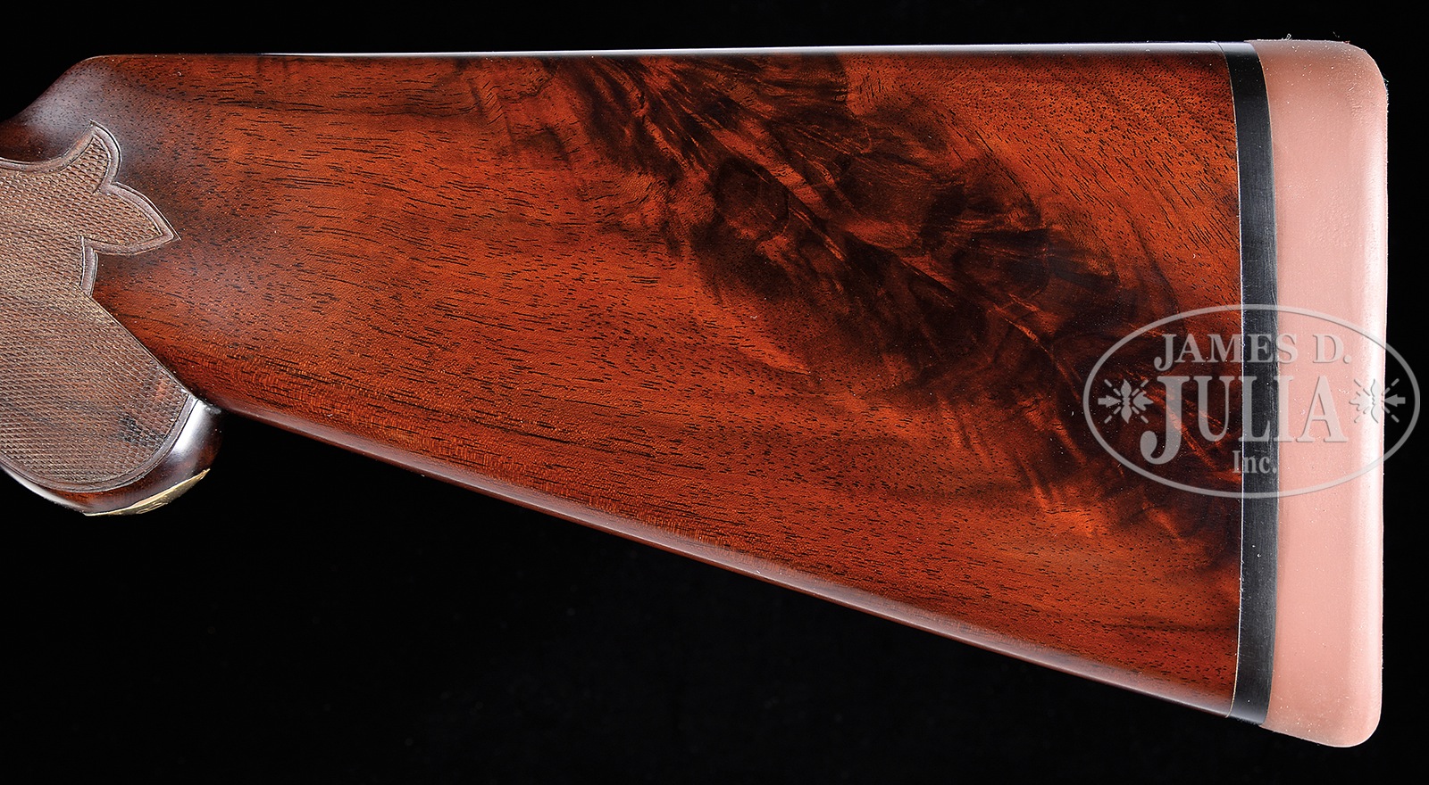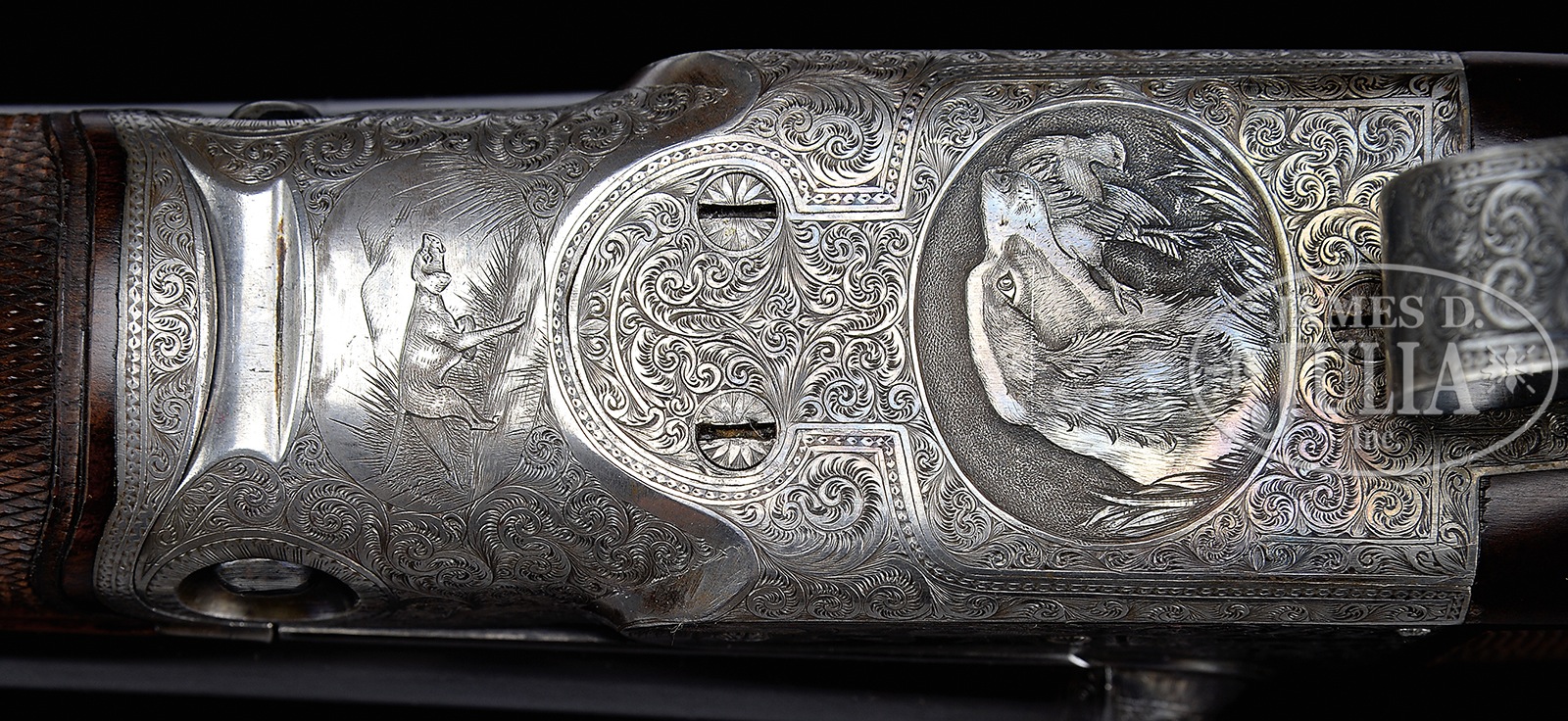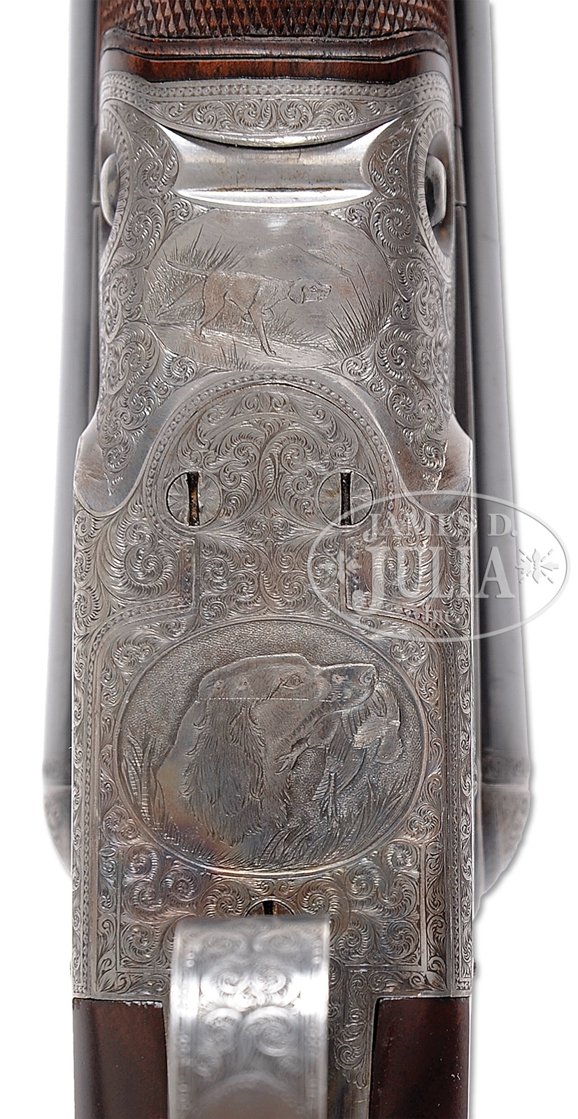 *PARKER “AHE” SHOTGUN WITH UNUSUAL SEMI-RELIEF ENGRAVED DOG ON FLOORPLATE AND HIGH ORIGINAL METAL CONDITION.SN 196508. Cal. 12 ga. 2-3/4″ Chambers. 2 Frame. 30″ Bbls are marked with Parker’s name and Meriden CT address, and “ACME STEEL”, on matted game rib. Bbl flats are stamped with all correct markings. Case hardened action with all correct markings on water table, features non-automatic safety and dbl triggers. It is engraved in usual “A” style with near full coverage nicely cut varying sized scroll surrounding detailed vignettes of game birds; pair of quail on left, a pair of mallards swimming in marsh on right. Left fence is engraved with flying duck, and right with a standing pheasant. Bottom of action portrays a pointing pointer. Trigger plate is semi-relief engraved with unusual, most likely special order, exceptional portrait of spaniel bringing a quail to hand. “PARKER BROS” is on rectangle on both sides of action. Action is filed with single beads around fences, and chevron on top lever. Trigger guard with scroll on bow surrounding vacant oval, has SN on tang. Crotch figured American walnut round knob buttstock measures 14-3/8″ over brown Decelerator pad. Stock has usual “A” style checkered side panels with unusual tear drop points, and fancy pattern checkering with fleur-di-lis intrusions toward comb. A gold oval with initials “IHB” is at bottom of grip. Matching splinter ejector forend is near fully checkered, and has nicely filed steel tip and usual release. Ejector patent date is on iron. This gun matches specifications as listed in the PARKER GUN IDENTIFICATION & SERIALIZATION ledger. Bore diameter: left -.730, right – .729. Bore restrictions: left – .032 (full), right – .011 (mod). Wall thickness: left – .030, right – .026. Drop at heel: 2-1/2″, drop at comb: 1-3/8″. Cast: Neutral. Weight: 8 lbs. 2 oz. LOP: 14-3/8″. PROVENANCE: Remarkable William Larkin Moore Private Estate Collection of Fine Sporting Arms. CONDITION: Excellent, as partially refinished. Bbls retain 70 – 80% orig blue, silvered and browned at muzzles, with a myriad of minor marks, dings, and scratches overall, thinning a bit on sides. Action retains approx 50 – 60% orig case hardening color, again with a number of light scratches, silvering from normal hand wear on fences, beads, and around bottom. Stocks retain essentially all of a red-toned high quality oil refinish, checkering cleanly re-cut. Bores are excellent, lightly frosted at the end of right bbl. Action is tight. Bbls are on face. Ejectors are in time. All Parker “A” grades are scarce, with an estimated total of 306 hammerless guns, 48 12 bore with 30″ Acme steel bbls. 50594-24 MGM112 (12,500-22,500) C&R – Lot 3437