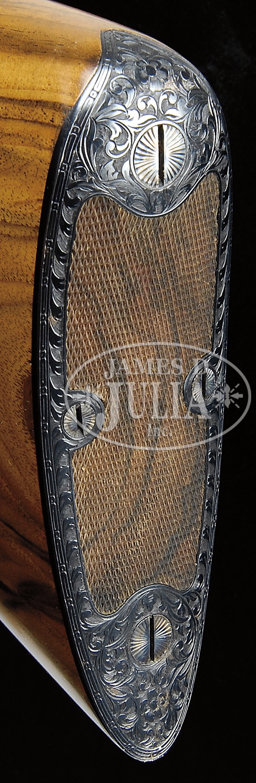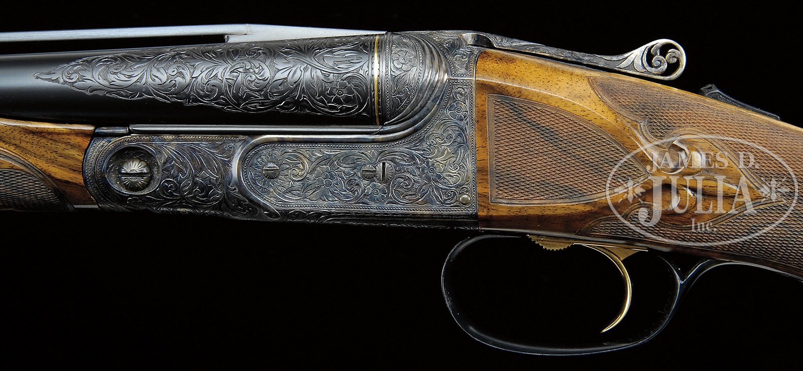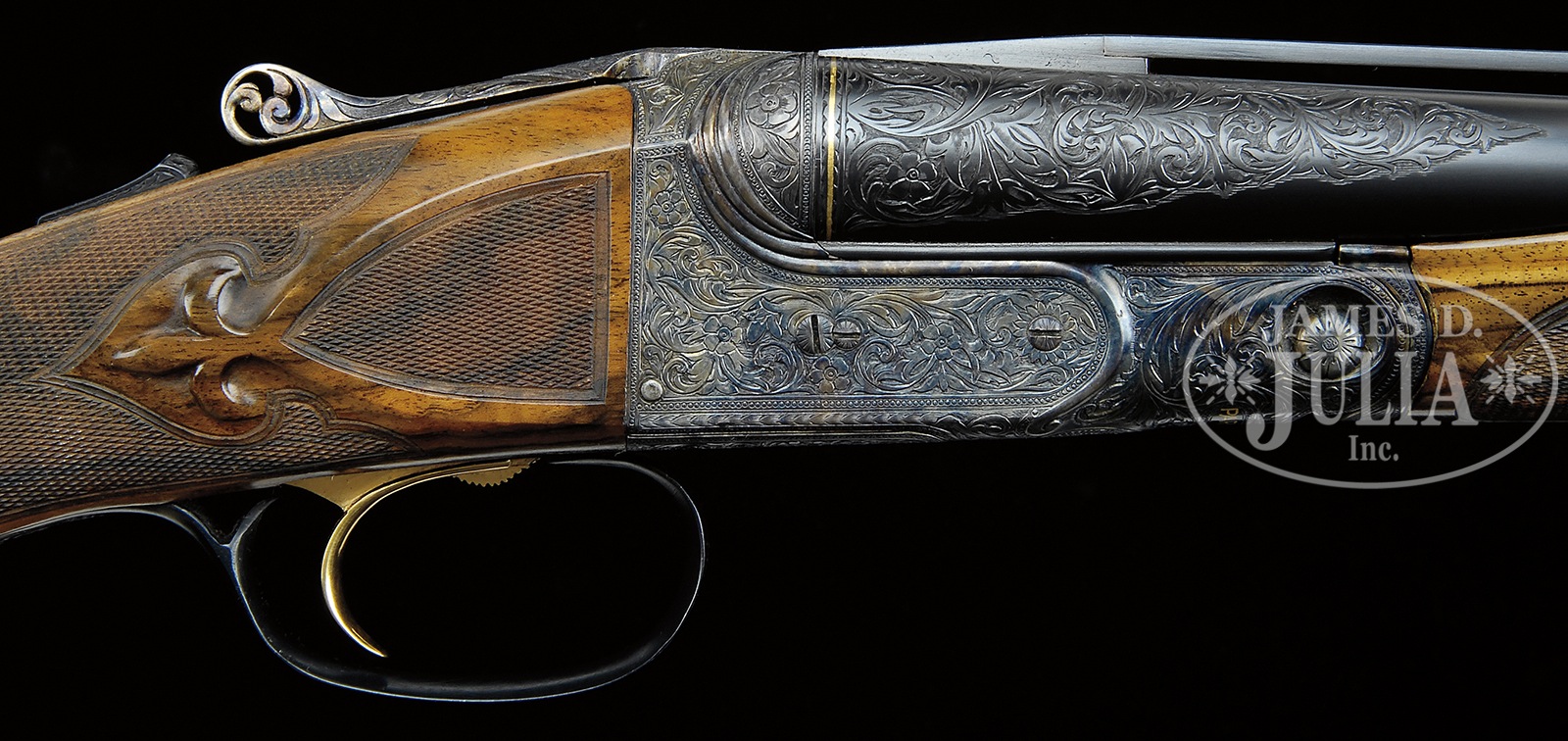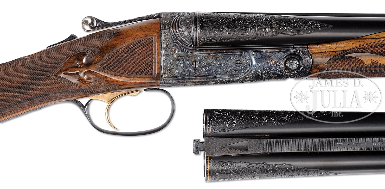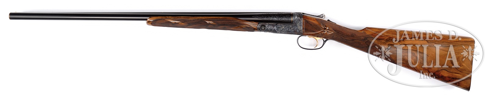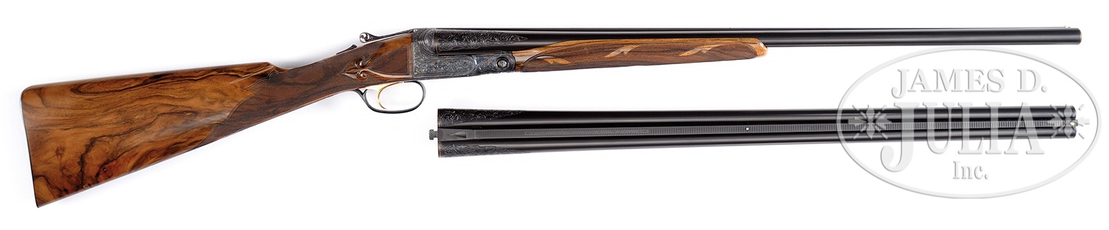 *ATTRACTIVE 20 GAUGE PARKER “A 1 SPECIAL” HIGH QUALITY UPGRADE SHOTGUN WITH EXTRA BARRELS AND HUEY CASE.SN 233194. Cal. 20 ga. 2-3/4″ Chambers. 0 Frame. This appears to be a DHE “All options” gun upgraded to “A1 Special”. This gun has 26″ ventilated rib bbls marked “Titanic Steel” with correct markings on water table. Another set of 26″ bbls has been fitted with Belgian proofs and wide, concave, matted rib. Belgian bbls have gold bands at muzzle and breech. Parker bbls have gold only at breech. Cyanide colored action has been nicely filed with four beads at fences, with bead along water table terminating in scroll at bottom. Action also features automatic safety (SAFE inlaid in gold), pierced thumbpiece to top lever, and single selective gold-plated trigger. Action is engraved with open flowing scrolled acanthus with floral highlights, as often seen on late A1 Special guns. “Parker Bros” is inlaid in gold on bottom of action. Trigger guard with matching engraving has SN inlaid in gold at grip. Beautifully marbled and nicely figured European walnut straight grip buttstock measures 14-1/2″ over matching skeleton buttplate. Stock features “A1 Special” pattern checkering with mullered borders, and checkered side panels with large fleur-di-lis drop points. Matching beavertail ejector forend with reinforcing bolt is checkered with fleur-di-lis extensions into pattern. Parker bbls: Bore diameter: left -.615, right -.615. Bore restrictions: left -.004 Flared (skeet), right -.007 Flared (skeet). Wall thickness: left -.026, right -.026. Drop at heel: 2-7/16″, drop at comb: 1-1/2″. Cast: approx 1/2″ off. Weight: 6 lbs. 14 oz. LOP 14-1/2″. Belgian bbls: Bore diameter: left -.622, right -.621. Bore restrictions: left -.020 (mod), right -.017 (lt mod). Wall thickness: left -.030, right -.030. Drop at heel: 2-7/16″, drop at comb: 1-3/8″. Cast: approx 1/2″ off. Weight: 6 lbs. 12 oz. LOP 14-1/2″. Huey oak and leather case with stitched leather corners, oval brass medallion, and Huey brass label has serial number “369” on lid. Interior is lined with green suede, with Parker gold embossed black leather label. Partitions are topped with oak, and gun is semi-French fitted, accessories are French fitted, and gold-plated. Accessories include striker bottle, round oil bottle, pair of snap caps, and also two rosewood handled turnscrews, one large and one small. Two keys are in a covered compartment. Twin ivory beads. Special Note: This item(s) contains plant or animal properties that may be covered by the Endangered Species Act (ESA). We have taken care to ensure that this item(s) meets the standard for sale under the ESA. However, certain states and other countries have laws that are more restrictive than the ESA. It is the bidder’s responsibility to ensure that it is lawful to purchase or transport this item(s) into their state, and to obtain the necessary import and export approvals. Delay or failure to obtain any such permit or approval does not relieve the buyer of paying for the item(s) and consummating the purchase. CONDITION: Excellent, near new, as custom finished. All work performed is of the highest caliber with correct finishes and polishes overall. There are only one or 2 minor marks in the wood. Metal finish is nearly flawless. Bores are excellent. Action is tight. Ejectors are in time. Trigger works. Case leather is excellent, showing a few rubs, mostly on corners and along top edge. Interior is near new, somewhat soiled from contact with bbls. Accessories are slightly toned. 50819-24 MGM186 (12,000-18,000) IVORY – Lot 3438
