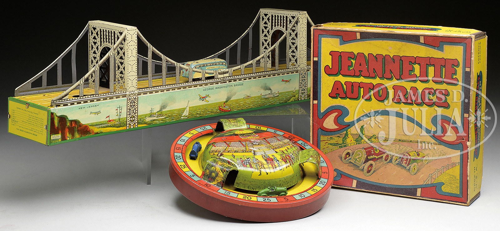 1) Jeannette Auto Race in original box. Manufactured by Jeannette Toy & Novelty Co., Penn. USA. A relatively rare pre-war mechanical toy showing cast iron racers running in circular motion around tin lithographed race track. Toy includes original catalog sheet showing other Jeannette toys available. 2) George Washington bridge by Fritz Bueschel, NJ, USA. Another relatively scarce key wind tin windup toy with marked Greyhound bus crossing the George Washington bridge. Lithography below bridge shows early planes and steam ships. Cars depicted on roadways appear to be 1930s. SIZE: Bridge is 25″ l. CONDITION: Key wind motor on bridge toy is working, band on pulley system needs adjustment – bus does not move. Otherwise desirable toy lot is clean and bright. 1-13725 (400-700) – Lot 3439