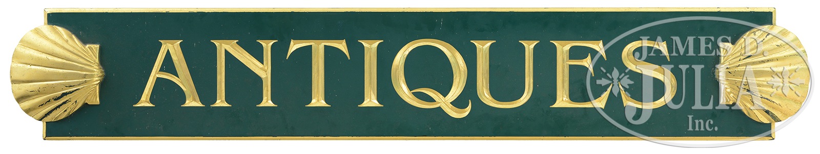 MIXED LOT: TWO SIGNS, TILE TABLE AND TWO FRAMED MUSIC SHEETS.1) 28″ l x 6-1/2″ w “Merrymeeting Camp/Bath” finger pointing sign in tin. 2) Fine 72″ x 12″ carved wood “Antiques” sign with gold shell decoration, gold letters & green background. 3) 12 tile stand depicting a bull fight having wrought iron base. 4 & 5) Two framed music sheets relating to cemeteries. Nicely housed in gilt modern frames with double mats. SIZE: Stand: 24″ h x 26″ l x 16-1/2″ w. Music sheets are 18″ x 14-1/2″ overall. PROVENANCE: From the personal estate collection of John W. Armiger Jr. CONDITION: Generally good, camp sign with some decoration loss. 49055-216 (500-600) – Lot 3442
