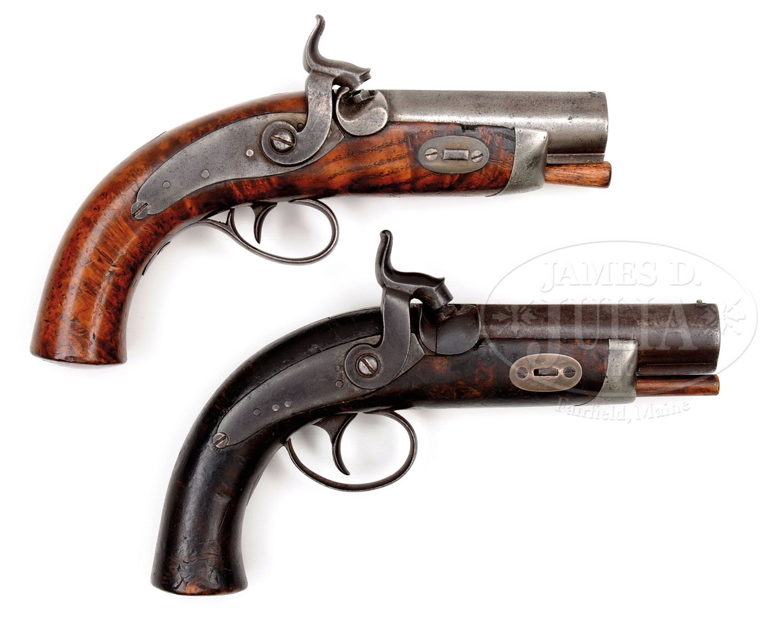 RARE PAIR “HUGH CONNOR” MOBILE ALABAMA DERINGERS.SN NSN. This is not a matched pair of pistols however they are about the same size and configuration though there are differences. This is a very rare maker with few examples known. Eberhart & Wilson in their text The Deringer in America Vol. 1 state Hugh Connor Jr. is shown in 1861 city directory as gunsmith and later post-war as gun and pistol maker. These are no doubt two examples of his rarely seen work which are iron, silver, brass and pewter mounted. Mr. Connor liked to work in multiple metals as both guns exhibit iron trigger guards, silver butt caps, silver plated brass keyway escutcheons and lock escutcheons. The beautifully figured maple gun exhibits small silver thumbplate too. Both guns measure just over 7″ overall with 3-1/2″ bbls including breeches. One gun is better than the other with finely figured maple stock retaining most of its varnish, second gun also maple mounted has turned quite dark with age though same rich colors can be seen under the almost blackened varnish. Both guns are marked on top bbl flats, “H. CONNOR/MOBILE” and back action locks are plain. Both guns measure about 44 Cal. PROVENANCE: Collection of John Montague. CONDITION: Gun one with lighter wood appears orig and complete though hard to ascertain if wooden ramrod is orig or not. Nipple of cone is broken off, metal shows old cleaning but bbl marking is still crisp and easily discerned. Bore shows discernible rifling though pitted. Gun two is darker and metal appears uncleaned with staining and pitting. Stock appears sound though there are a few cracks in grain, varnish has turned black though bright light shows the fine burl of the maple. Both guns are functional mechanically. 4-54341 JS178 (5,000-7,000) – Lot 3444