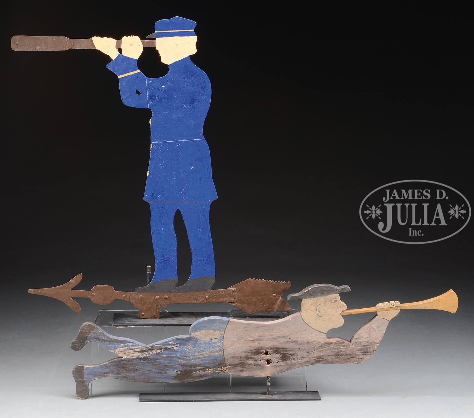 1) 33-1/2″ h x 29-1/2″ w. Painted sheet iron weathervane depicts a blue suited captain with long brown telescope to eye, stands on a brown arrow, the back having old red paint with half bar reinforcement. 2) 9″ h x 43″ l. Flying carved wood sailor with trumpet in mouth, colorful paint. SIZE: As noted above. PROVENANCE: From the personal estate collection of John W. Armiger Jr. CONDITION: 1) Repainted. 2) Has repaired break in trumpet, wear to paint, and some rot to side. 49055-74 (1,200-1,800) – Lot 3444