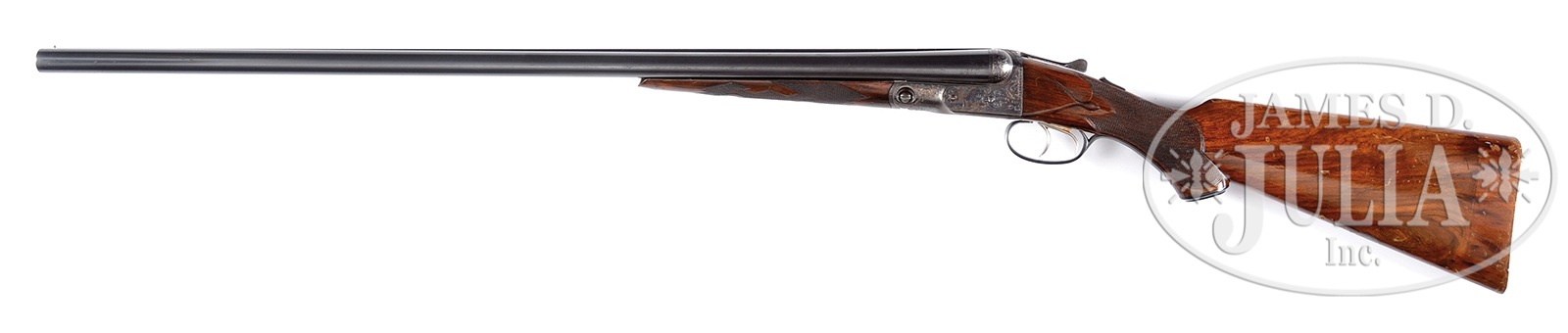 *SCARCE PARKER CHE SHOTGUN.SN 233863. Cal. 12 ga. 2-3/4″ chambers. 30″ bbls. Full length matted rib with brass front bead and marked “Parker Bros. Makers Meriden. CT. U.S.A. ACME Steel”. 1-1/2″ frame. Water table with SN and grade designation. BBl flats with unstruck bbl weight of 4 lbs 1 oz. and stamped “Parker Bros. Overload Proved”. Nickel plated double triggers. Auto ejectors. Auto safety. French walnut capped full pistol grip buttstock with large silver oval engraved with initial “M.D.R.” Checkered in typical C pattern with drop points behind action Grip cap marked “Parker Bros. Meriden Conn.”. Splinter forearm checkered in typical C pattern with engraved Deely latch and engraved steel tip. Receiver is nicely engraved with setter on right, pointer on left surrounded by well executed Parker scroll. Bottom of frame engraved with scroll and trigger plate near fully engraved with scroll and oversized quail in farm scene. Trigger guard bow is scroll engraved and floral border pattern at tang with SN noted. Breech balls, top of frame, and top lever are scroll engraved with geometric design. Bore diameter: left – .729, right – .731. Bore restrictions: left – .035 (full), right – .037 (full). Minimum wall thickness: left – .038, right – .028. Weight: 7 lbs. 9 oz. Drop at comb: 1-9/16″, drop at heel: 3″. LOP: 14-7/8 with 1-3/8″ well fitted wood extension over checkered butt. CONDITION: Excellent as refurbished, likely by Delgrego. Bbls retain 85-90% of an older restored finish with a few light spots of oxidation. Receiver retains most of its Delgrego style cyanide case hardened finish, more than 90% present. Buttstock is very good. Checkering lightly thinned with finish flaking in numerous spots on butt and handling marks and light scratches throughout. Forearm is excellent with minor grain separation towards iron that extends into checkering with scattered light handling marks and hunting bumps. Forearm latch and tip retain most of their restored cyanide color. Bores are excellent. Mechanics are crisp. Ejectors are in time. 50604-5 JSL (4,500-7,500) C&R – Lot 3448